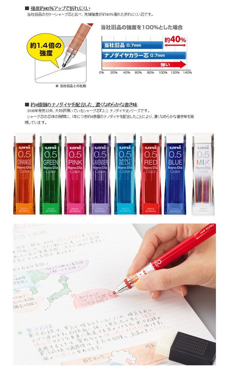 일본 UNI 미쓰비시 자동 연필 리드 NanoDia 컬러 리드 0.5mm-202ndc 다이아몬드는 코어를 부수기 쉽지 않습니다스토어 가기