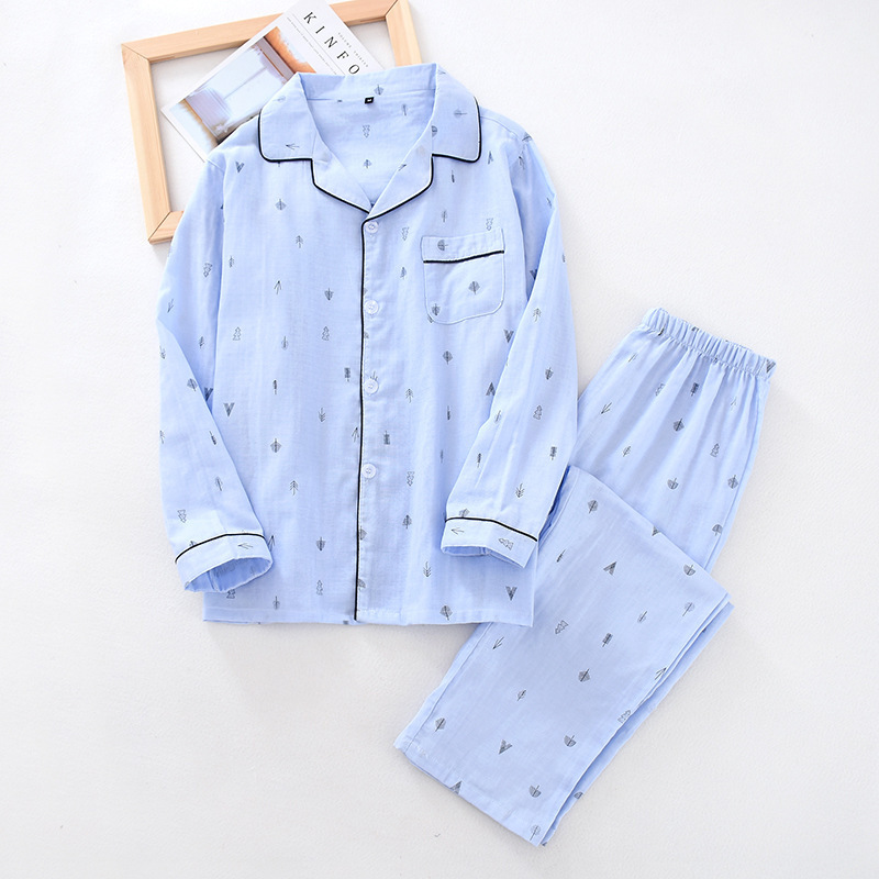 봄과 여름 새로운 남성용 잠옷 면사 긴팔 바지 가정복 세트 중년을위한 캐주얼 느슨한 플러스 사이즈 생활복스토어 가기
