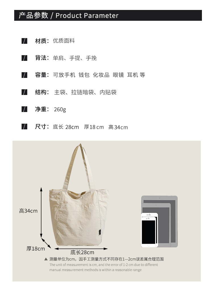 일본식 방수 나일론 캐주얼 어깨 천 가방 여성의 틈새 디자인 감각 캔버스 대용량 통근 토트 백