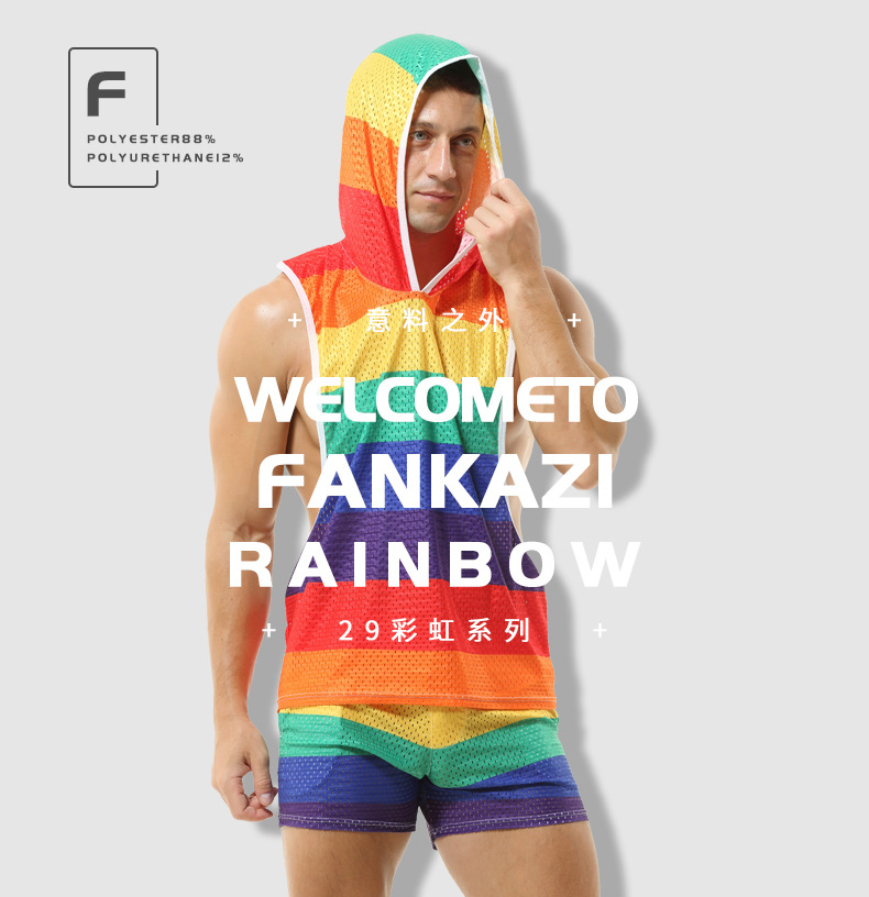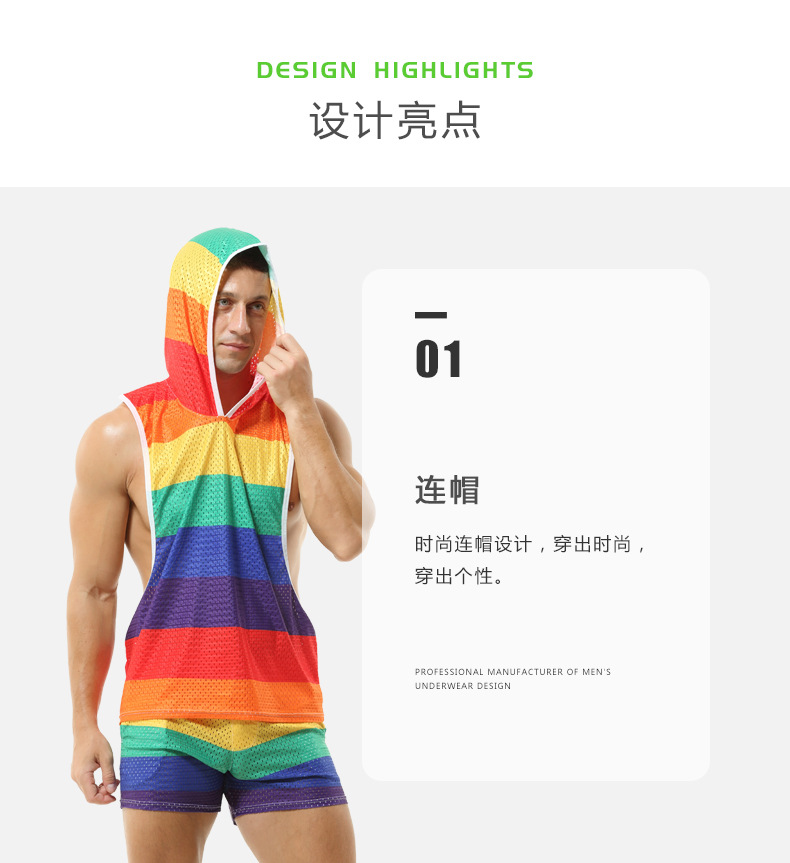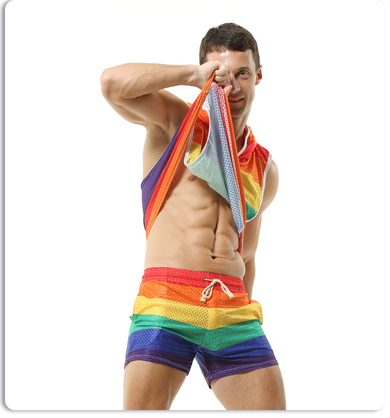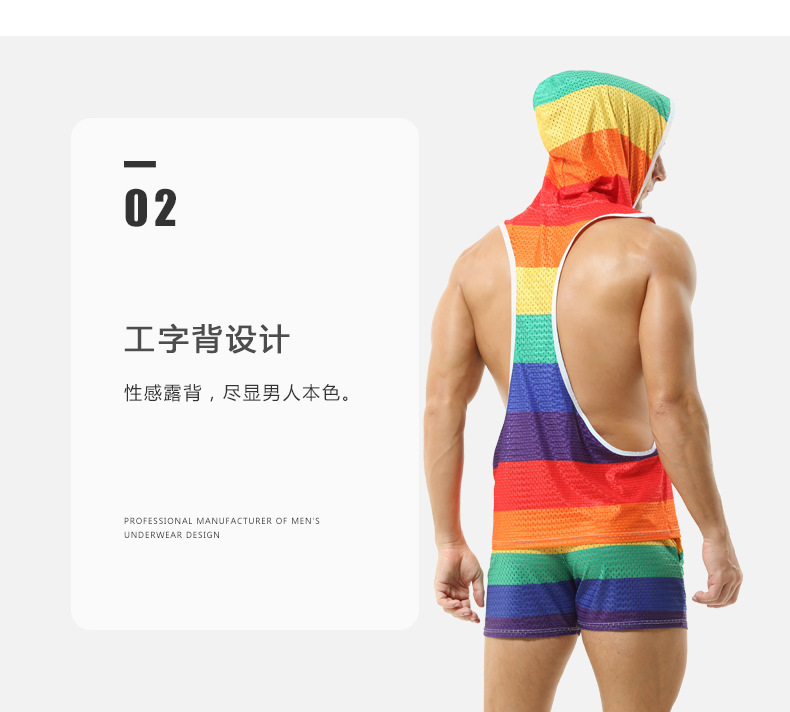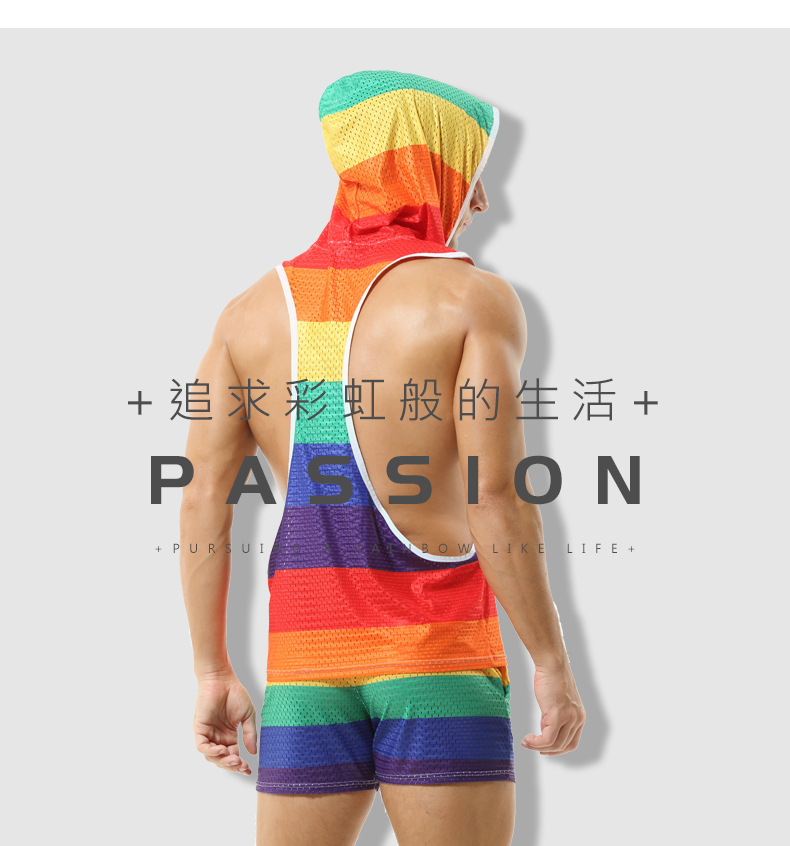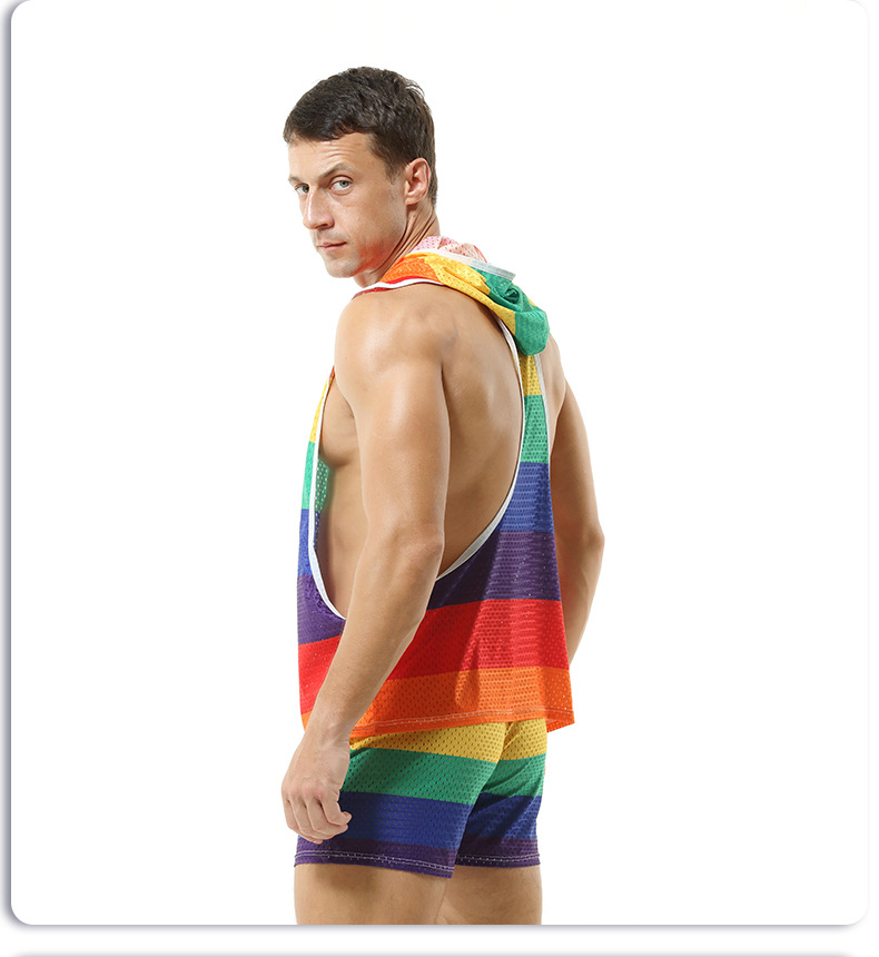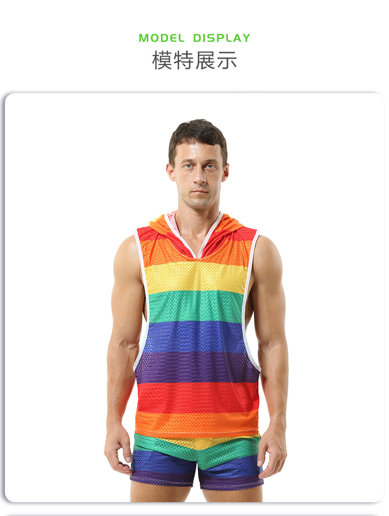 레인보우 후드 남성 조끼 V-넥 중공 통기성 얇은 섹시 민소매 느슨한 I-셔츠 바지없이스토어 가기
