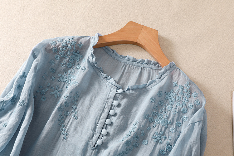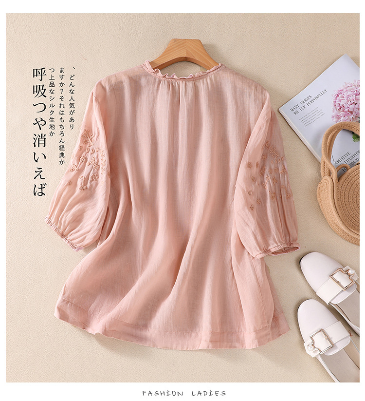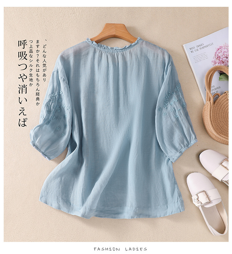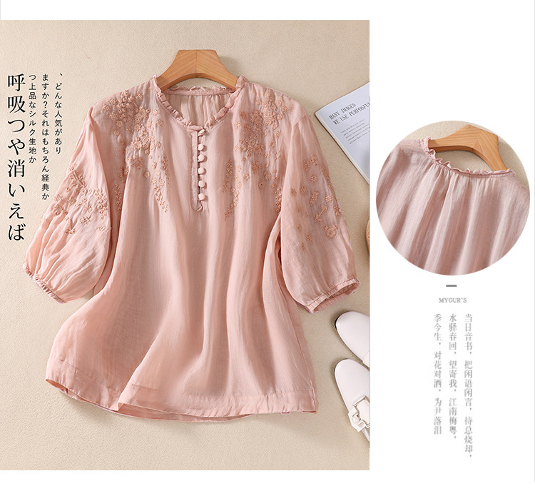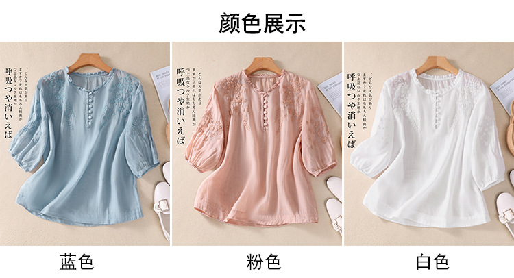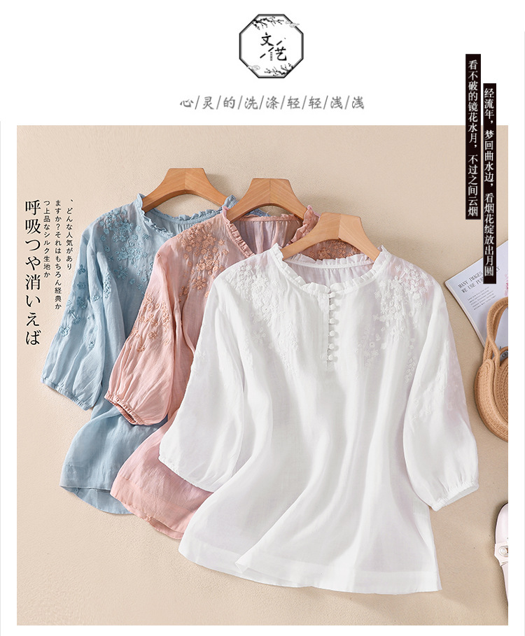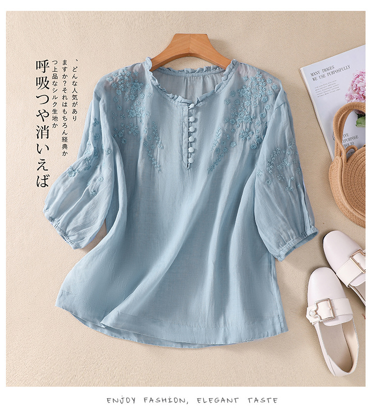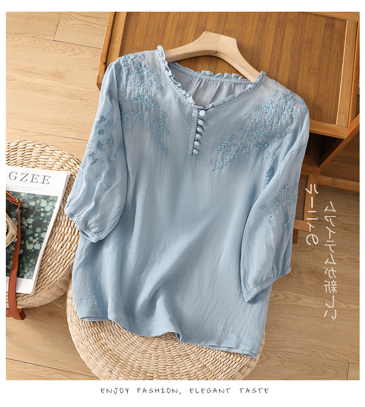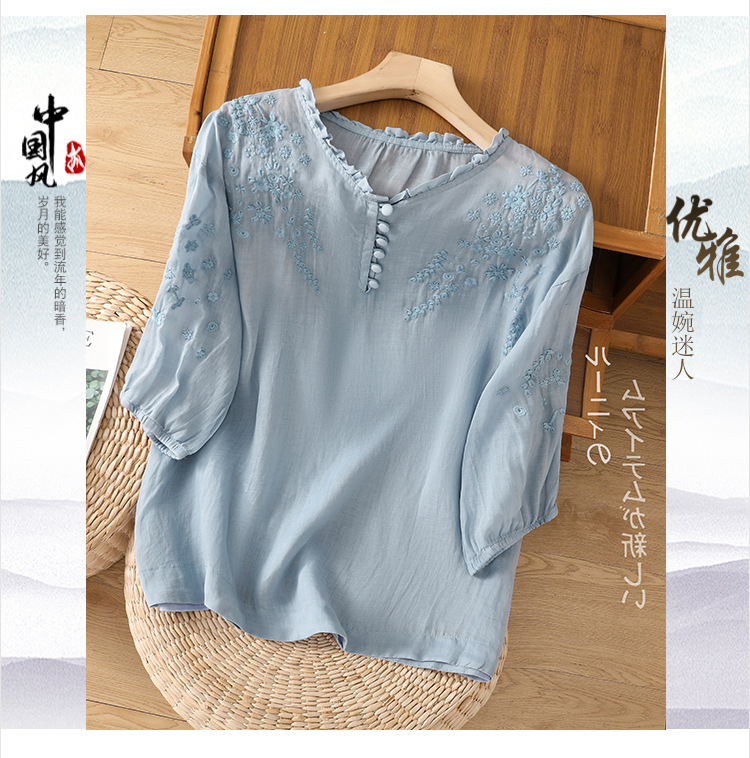 실제 사진 2025 여름 새로운 스타일 문학 느슨한 자수 꽃 V 넥 5부 소매 셔츠 여성 셔츠상의 # 9041스토어 가기