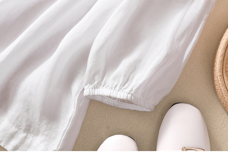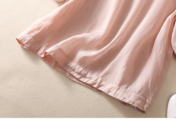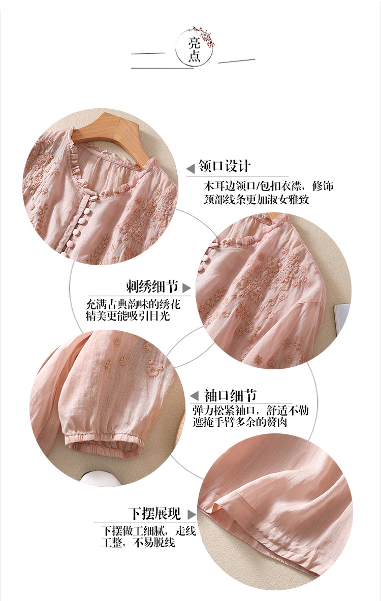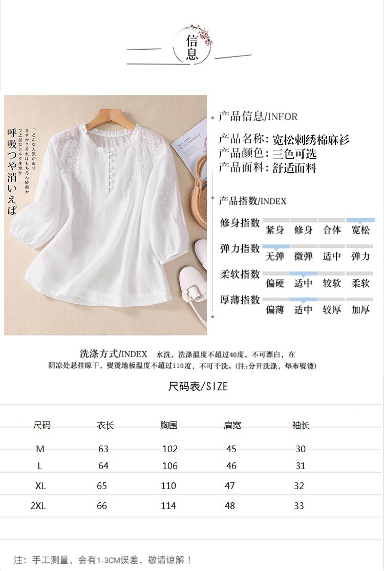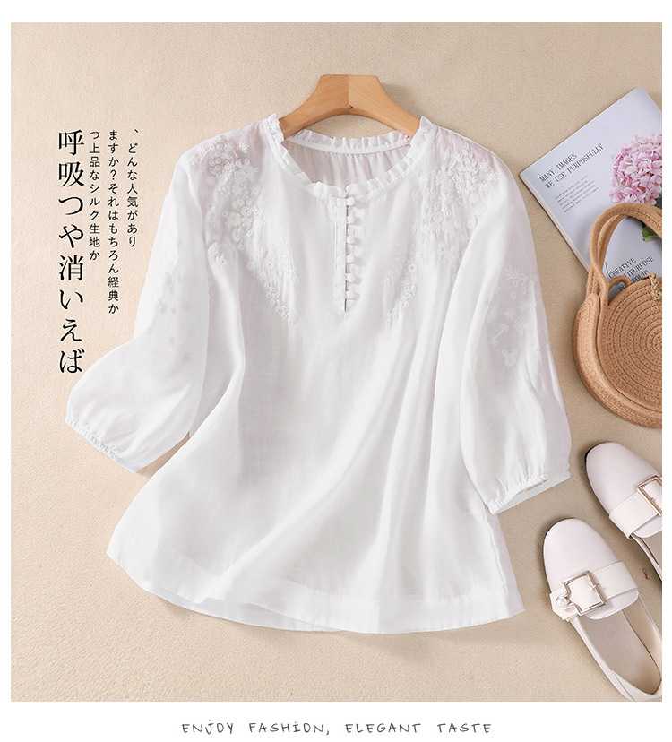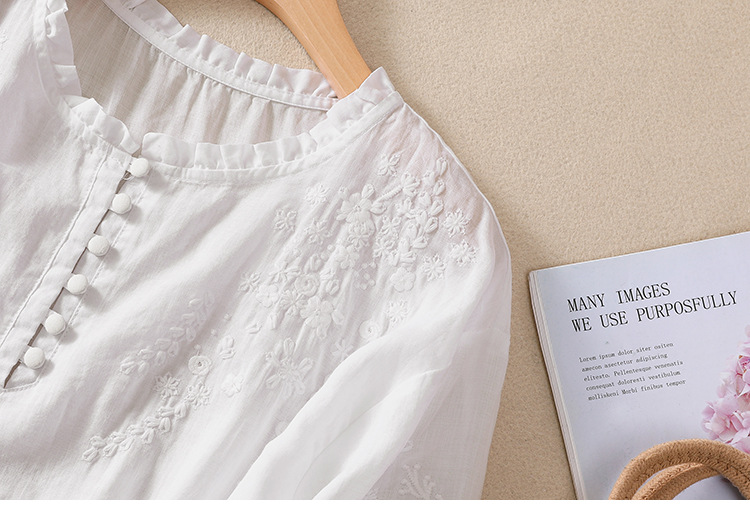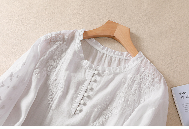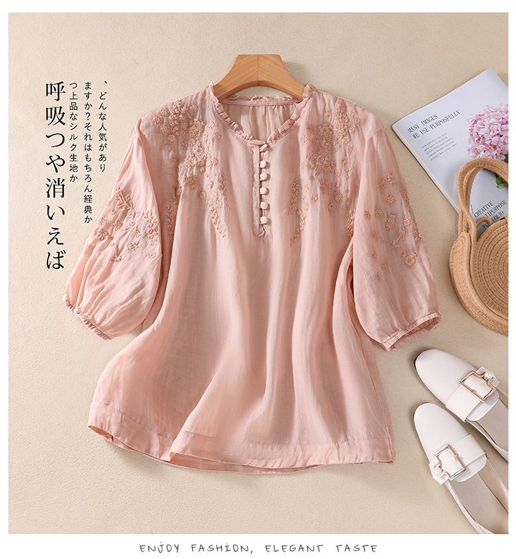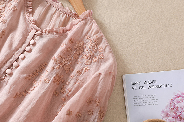 실제 사진 2025 여름 새로운 스타일 문학 느슨한 자수 꽃 V 넥 5부 소매 셔츠 여성 셔츠상의 # 9041스토어 가기