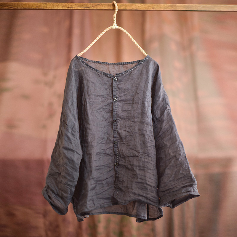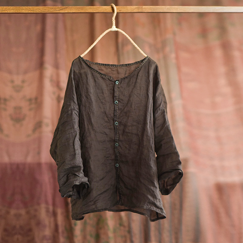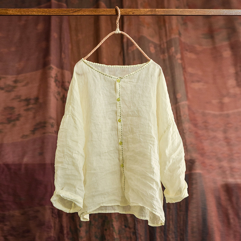 4076 오리지널 수제 경량 라미 빈티지 아티스틱 블라우스 핸드 스티치 크루넥 가디건 탑 대마 셔츠