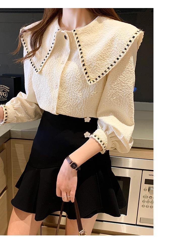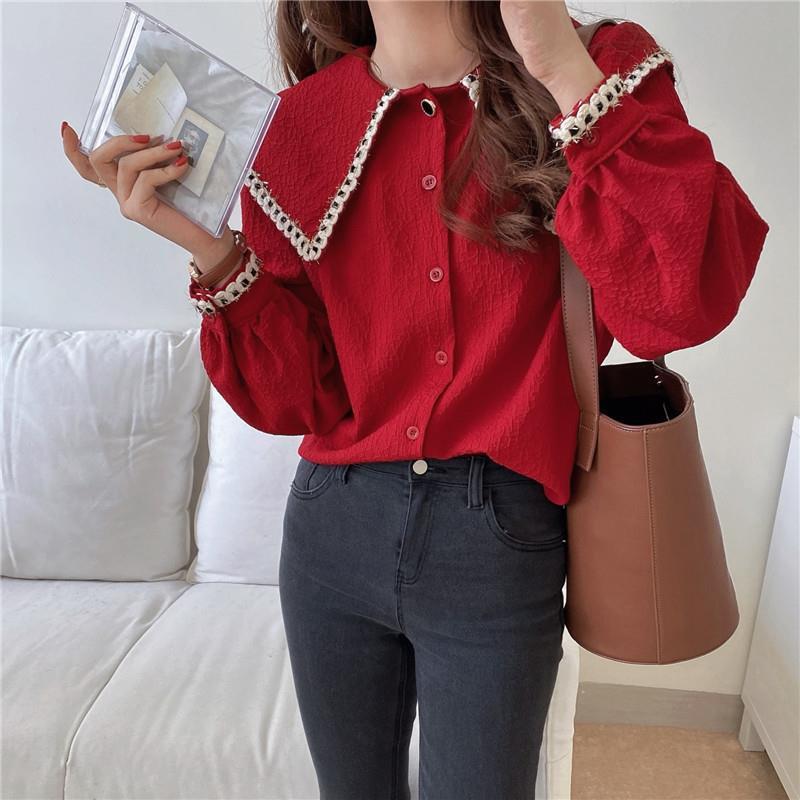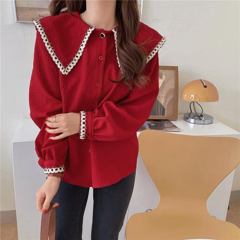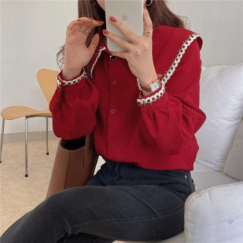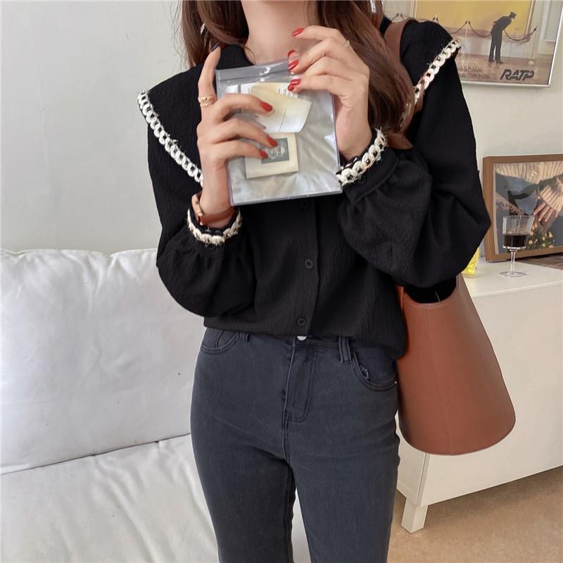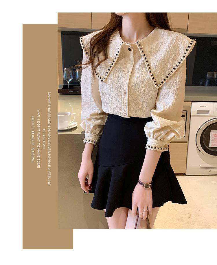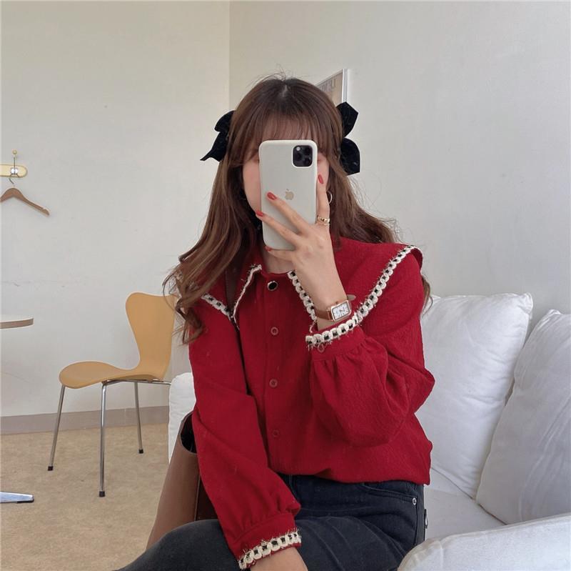 프랑스 복고풍 시크 탑 여성의 최신 유행 봄과 가을 인터넷 인기 큰 인형 칼라 셔츠 여성의 느슨한 디자인 감각스토어 가기