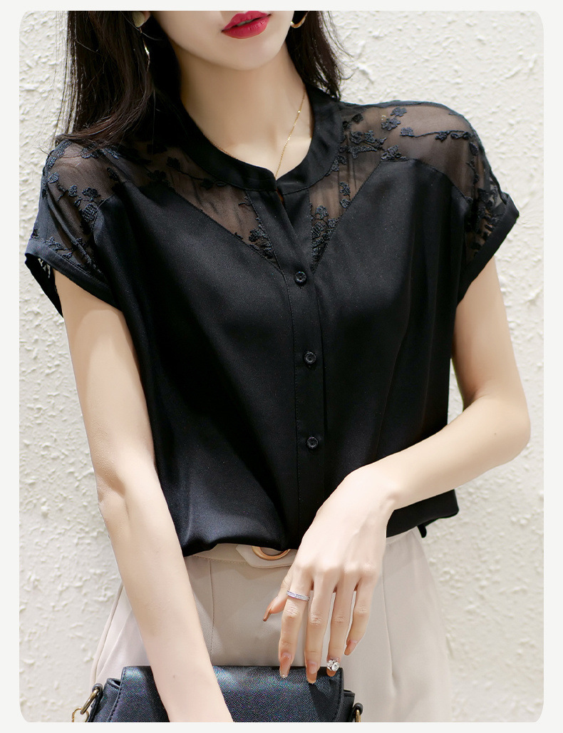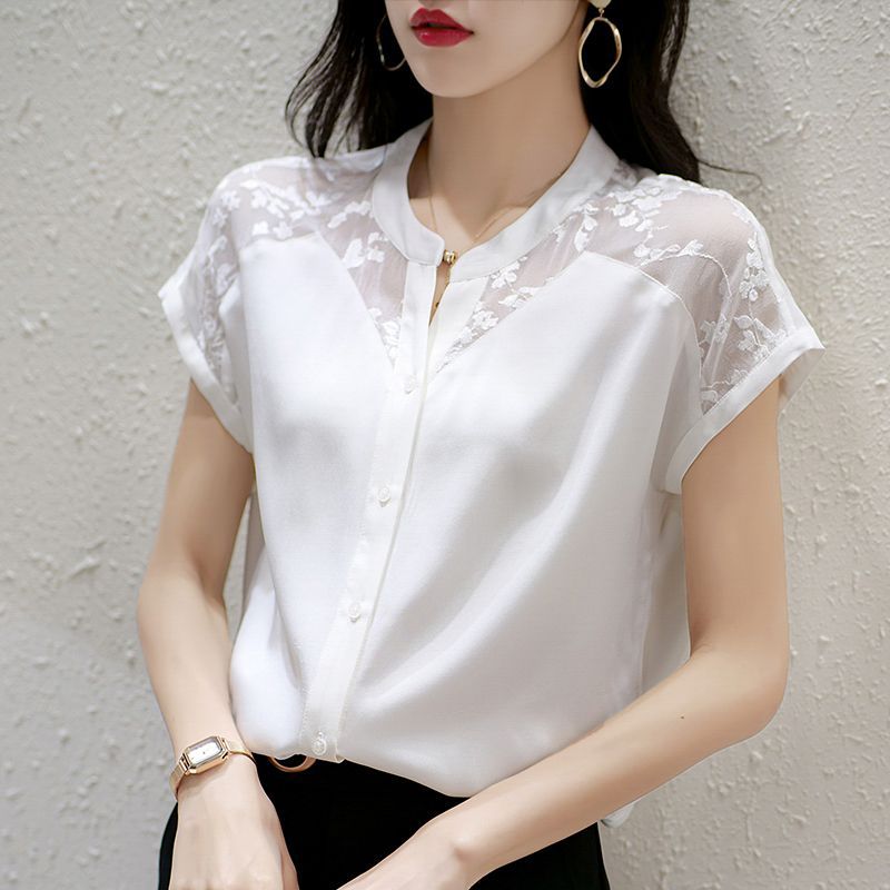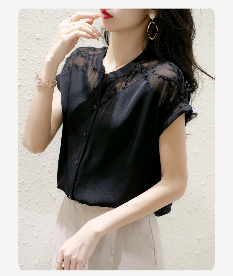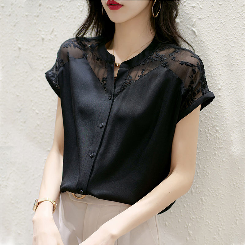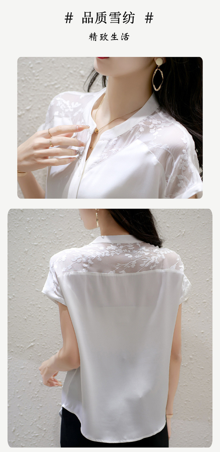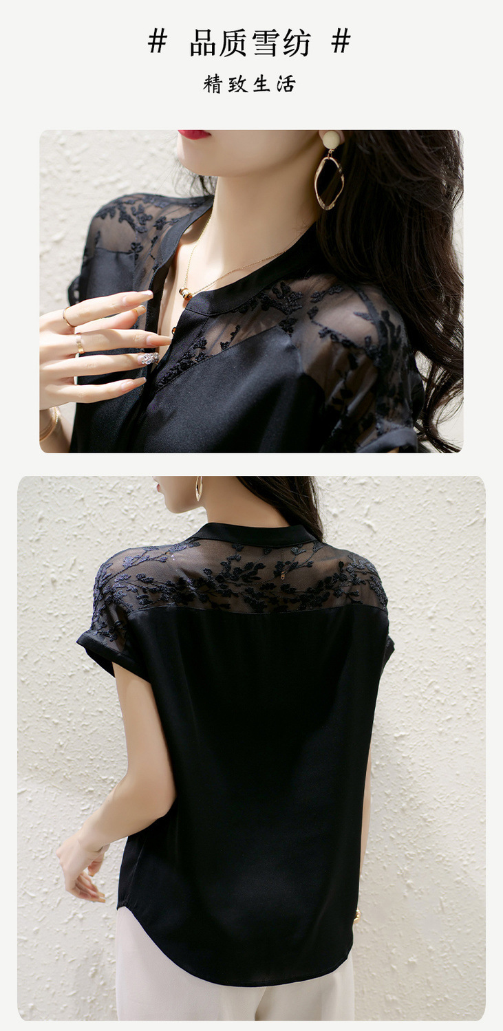 여성용 쉬폰 셔츠 탑 반팔 2025 여름 신작 레이스 스플리싱 자수 셔츠 서양식 배 커버 슬리밍 셔츠스토어 가기