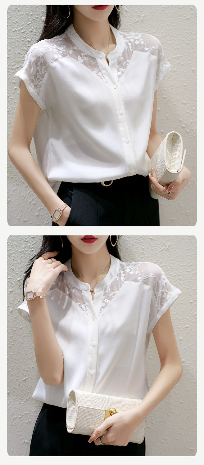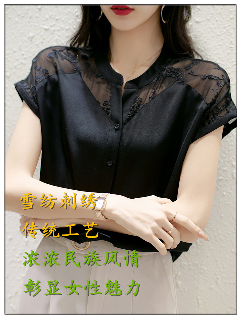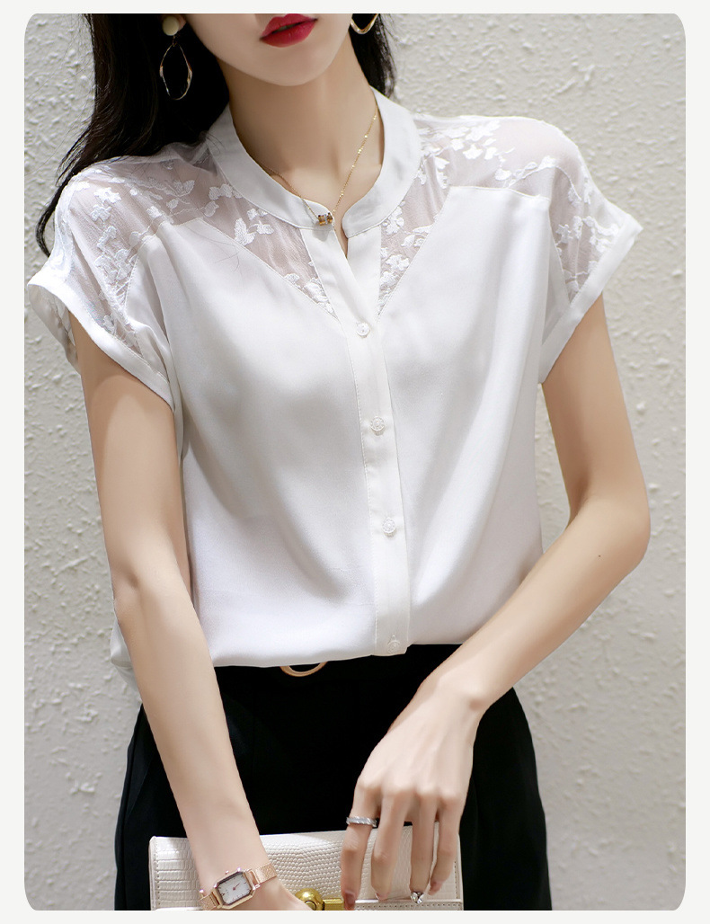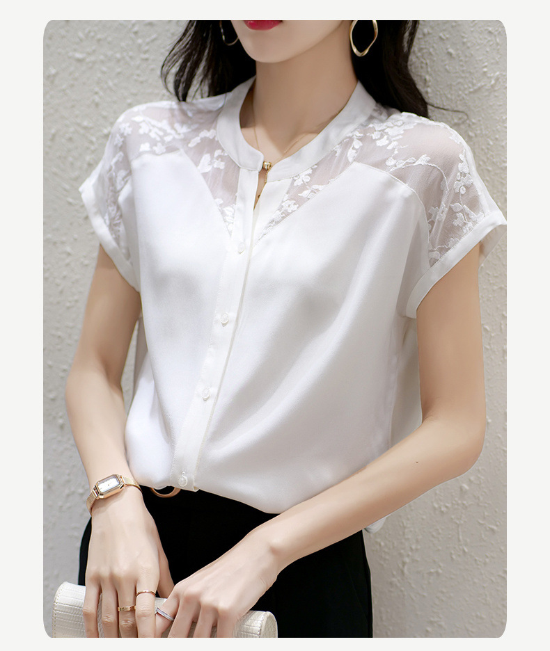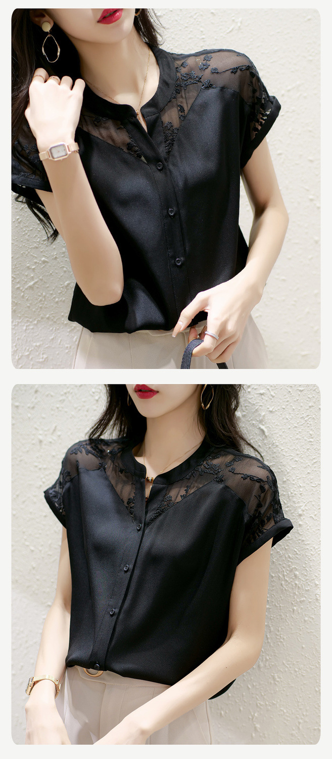 여성용 쉬폰 셔츠 탑 반팔 2025 여름 신작 레이스 스플리싱 자수 셔츠 서양식 배 커버 슬리밍 셔츠스토어 가기