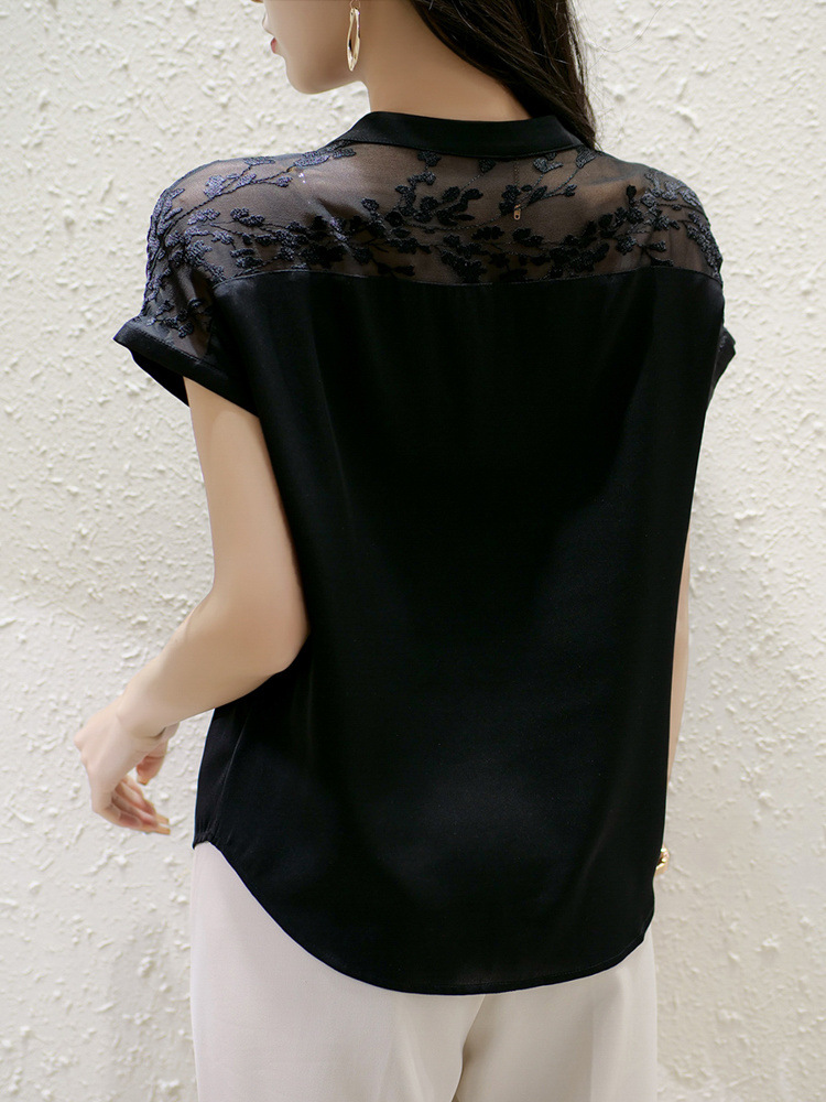 여성용 쉬폰 셔츠 탑 반팔 2025 여름 신작 레이스 스플리싱 자수 셔츠 서양식 배 커버 슬리밍 셔츠
