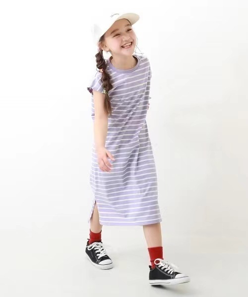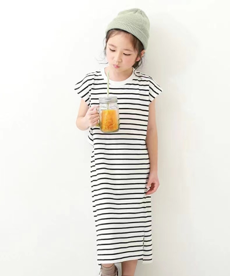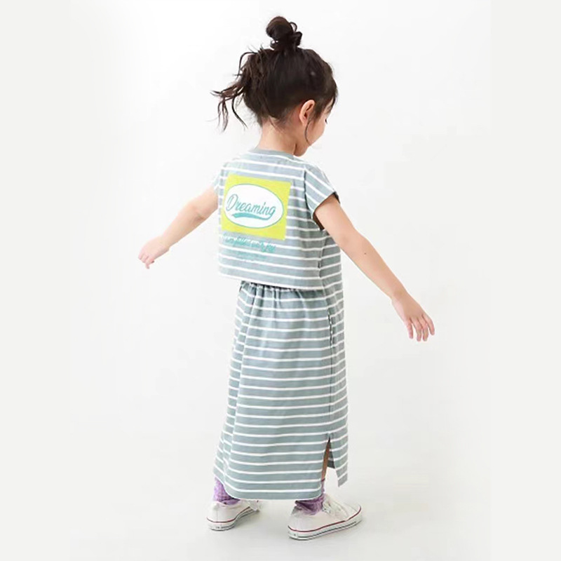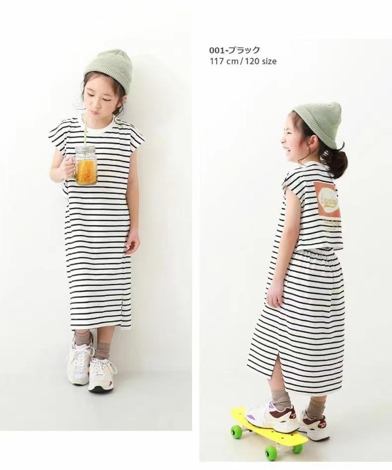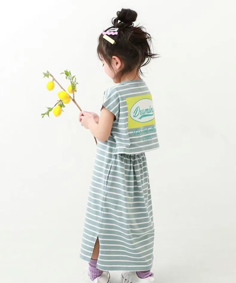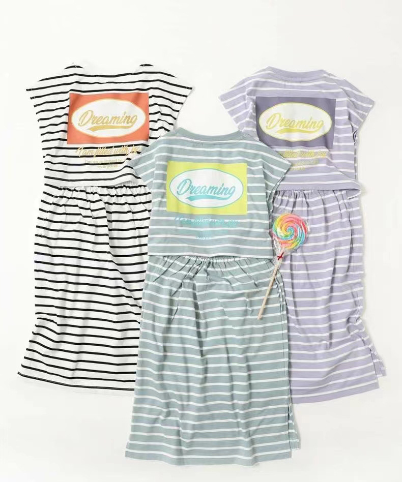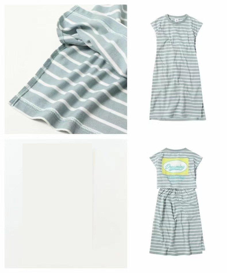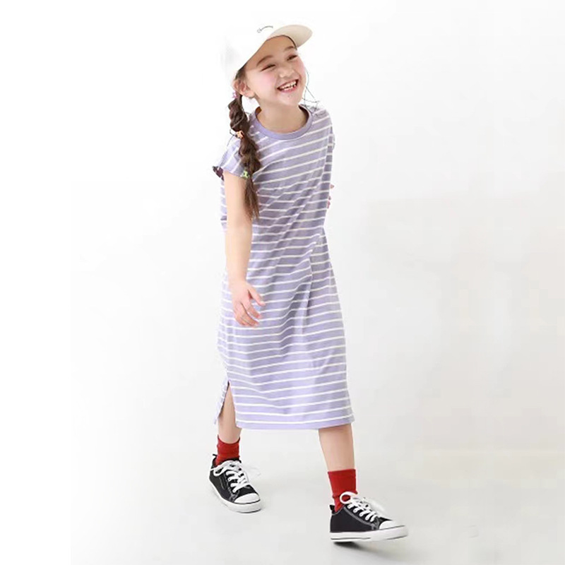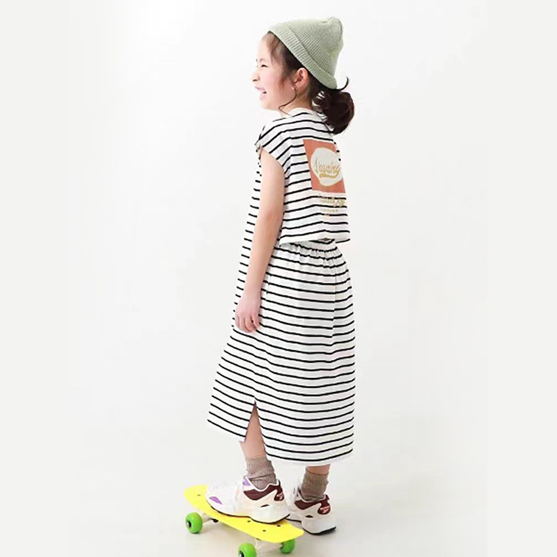 2023 여름 소녀 치마 다시 개방 탄성 스티치 통기성 스트라이프 반팔 원피스스토어 가기