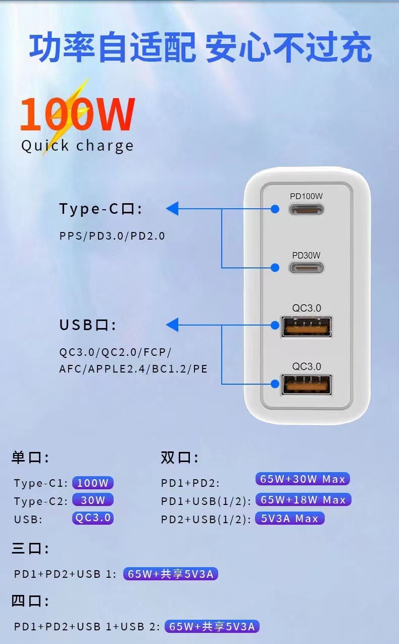 100W 질화 갈륨 충전기는 DJI Air3 드론, 범용 휴대폰 및 컴퓨터 PD 멀티 포트 고속 충전에 적합합니다.스토어 가기