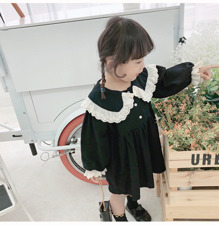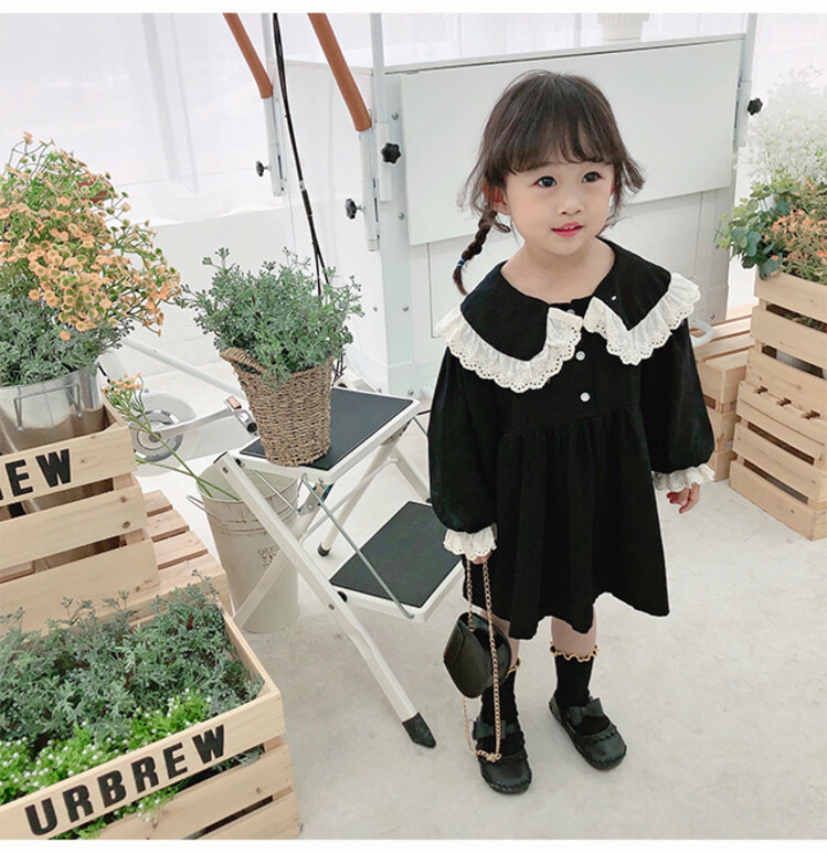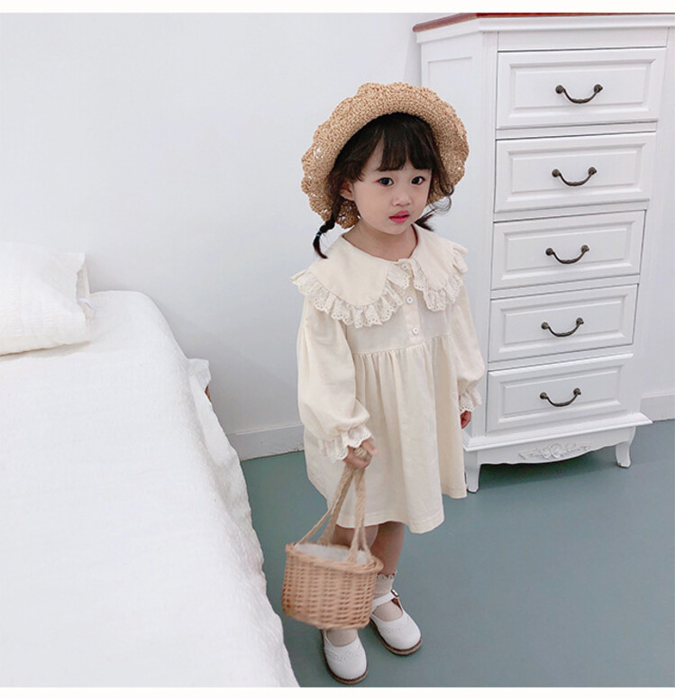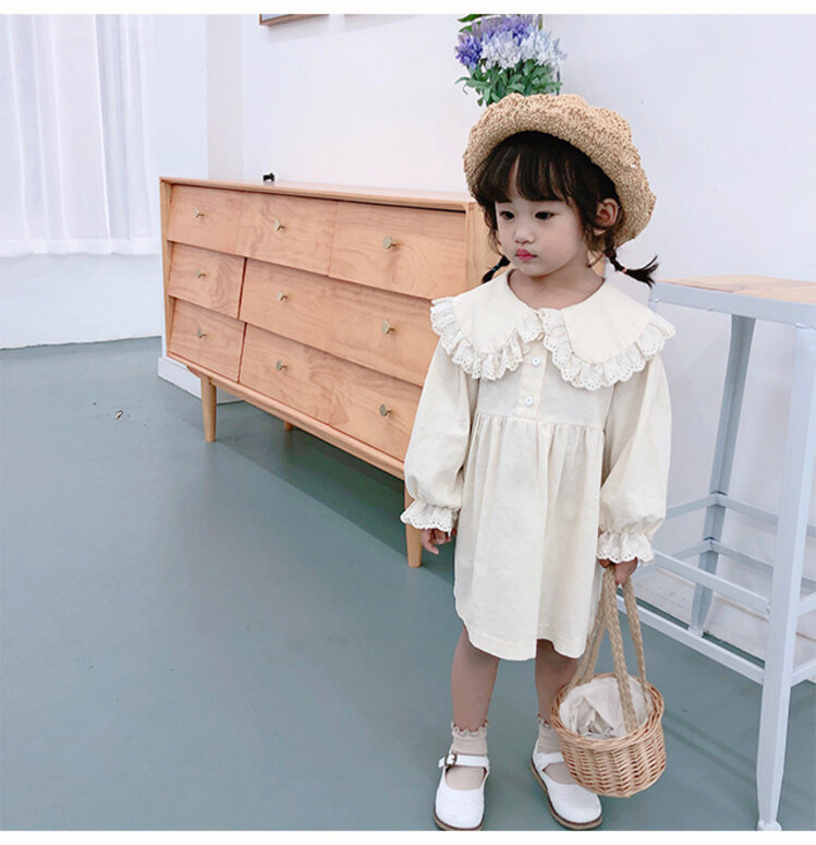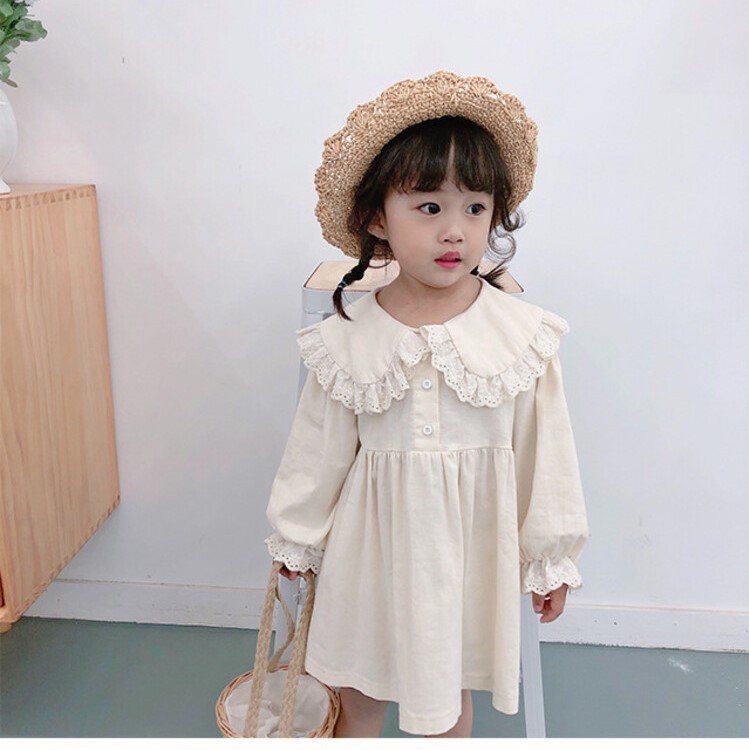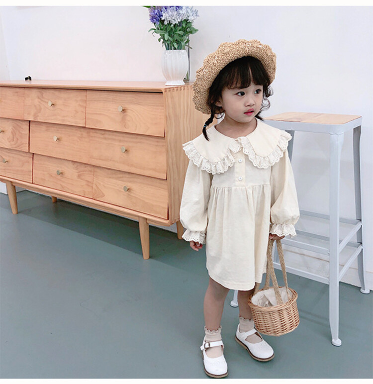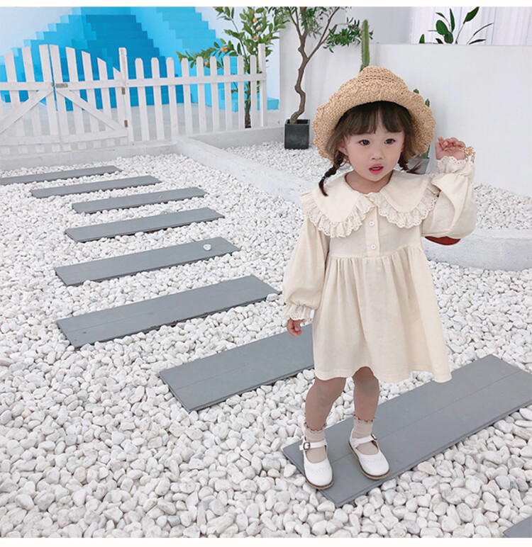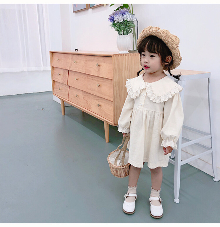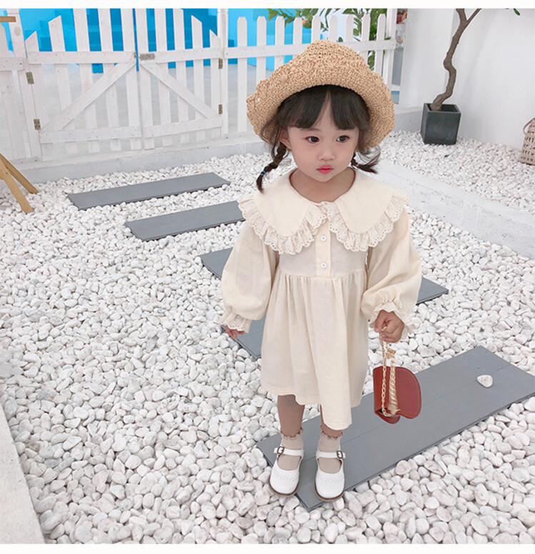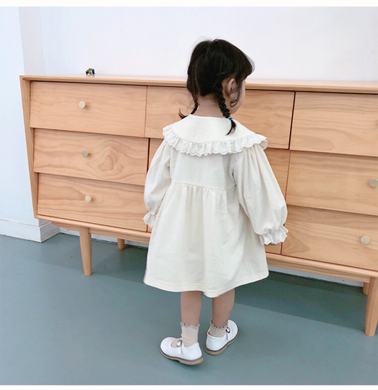 여아 레이스 칼라 단색 원피스 봄 가을 한국 스타일 아동용 긴팔 공주 드레스스토어 가기