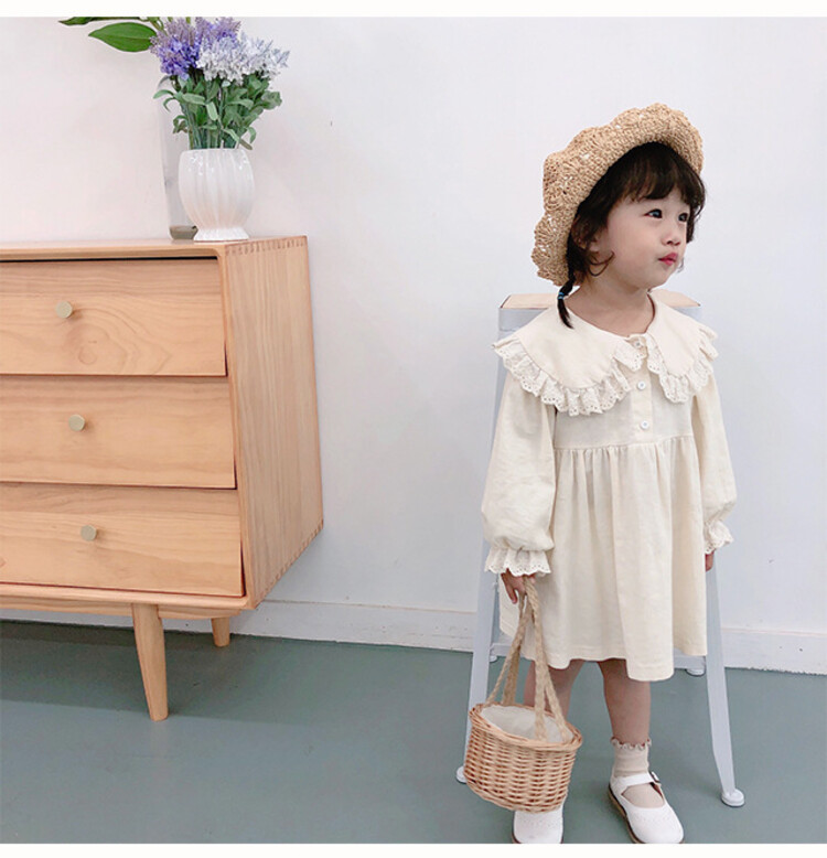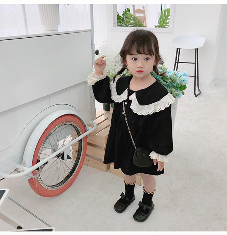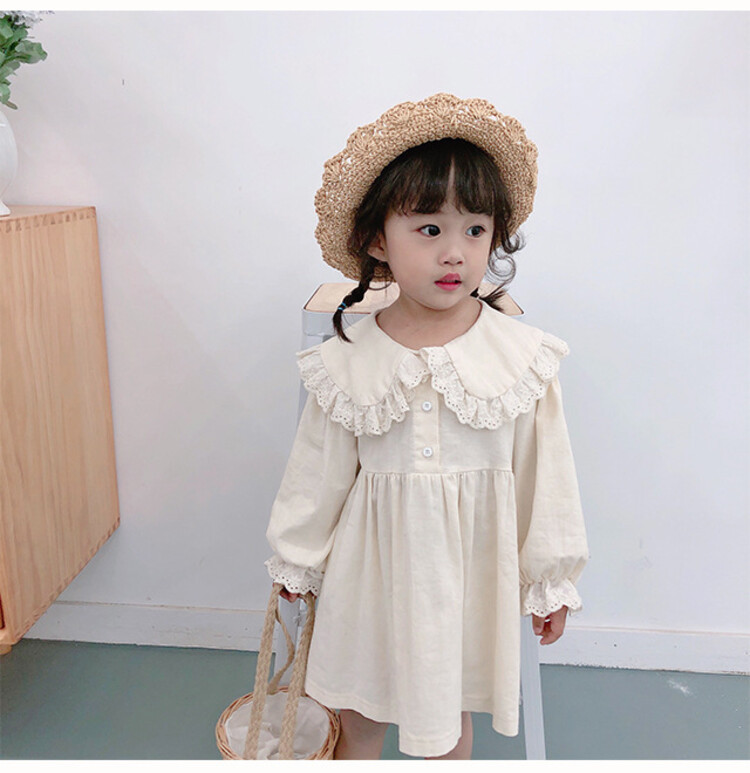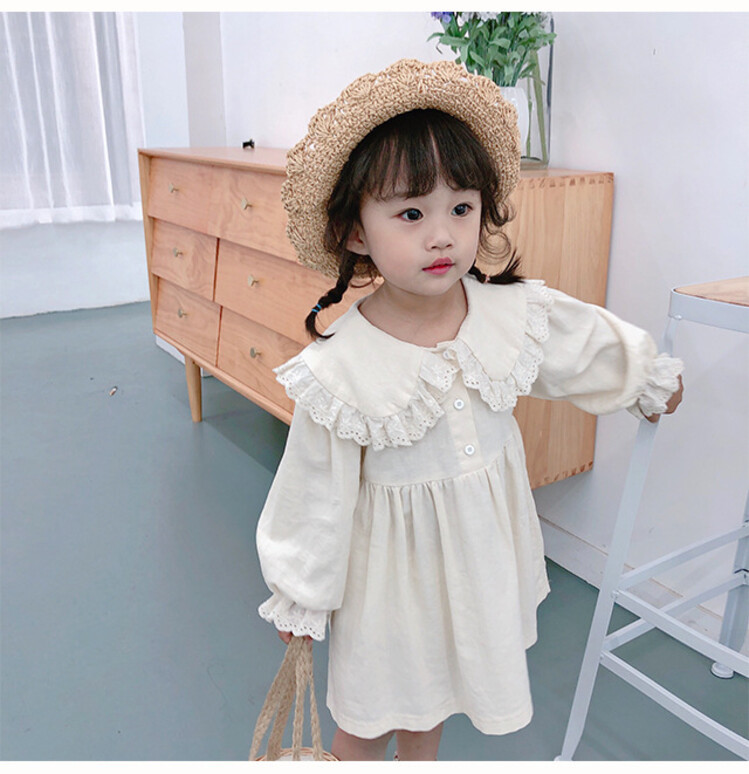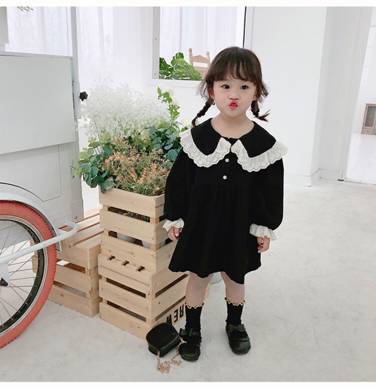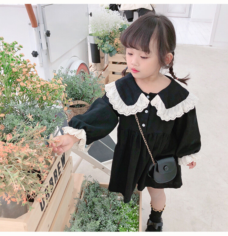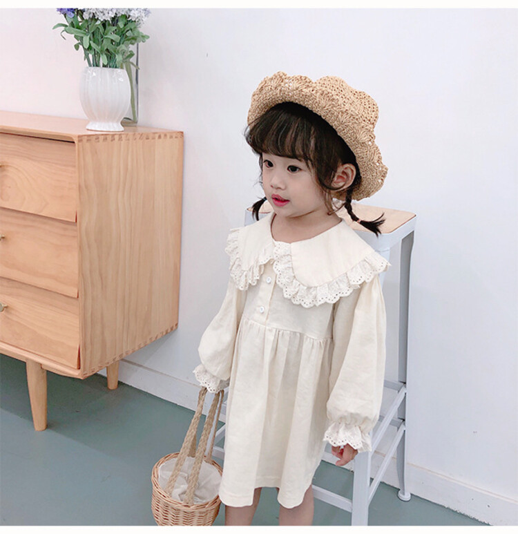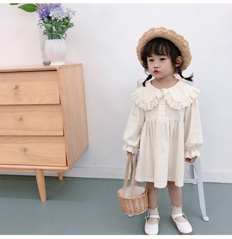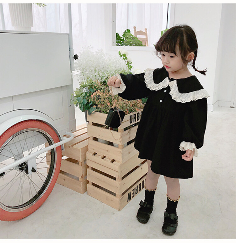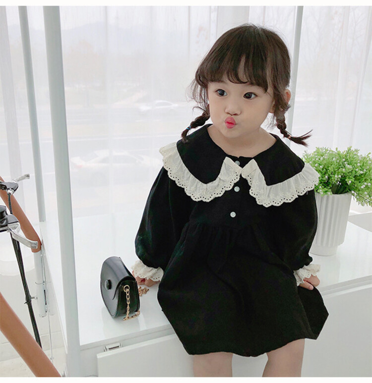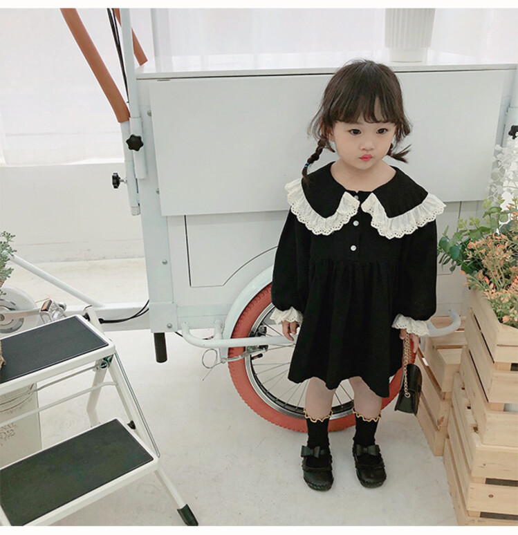 여아 레이스 칼라 단색 원피스 봄 가을 한국 스타일 아동용 긴팔 공주 드레스스토어 가기