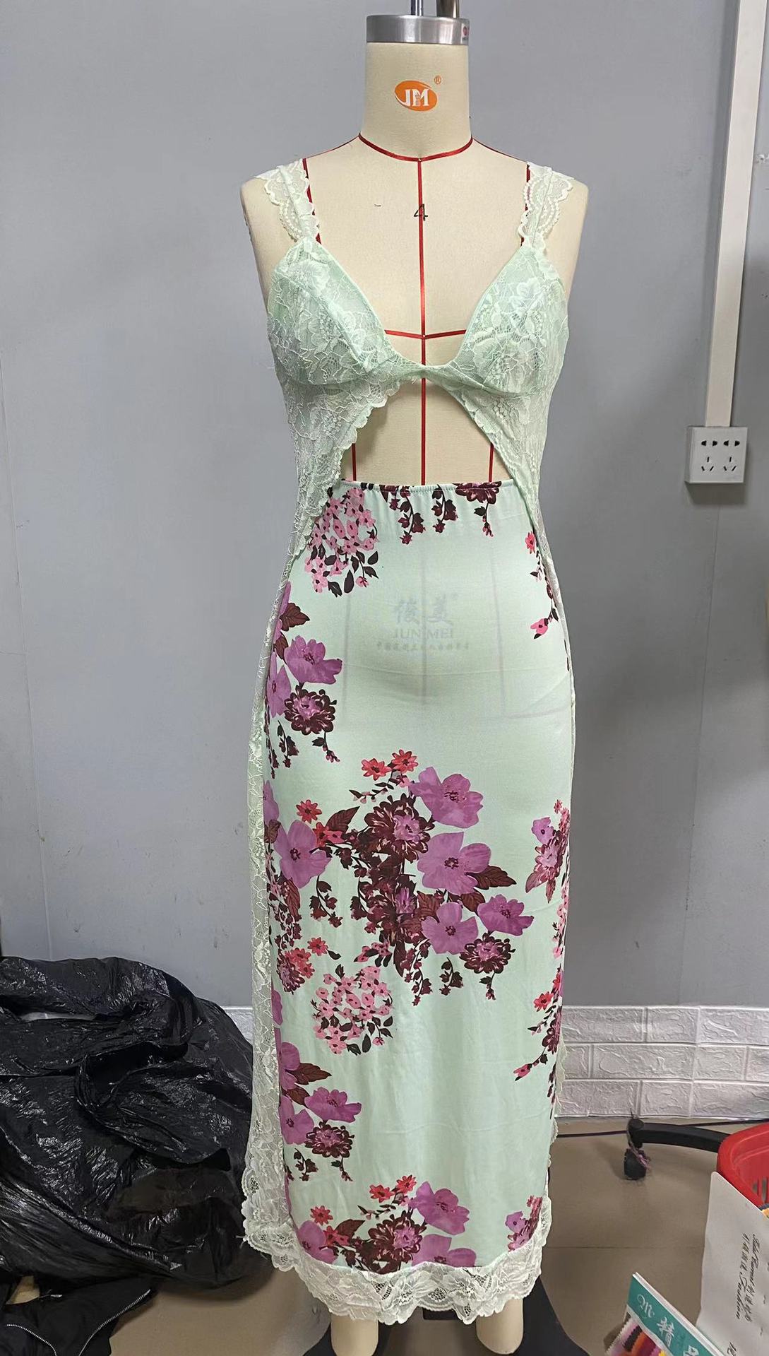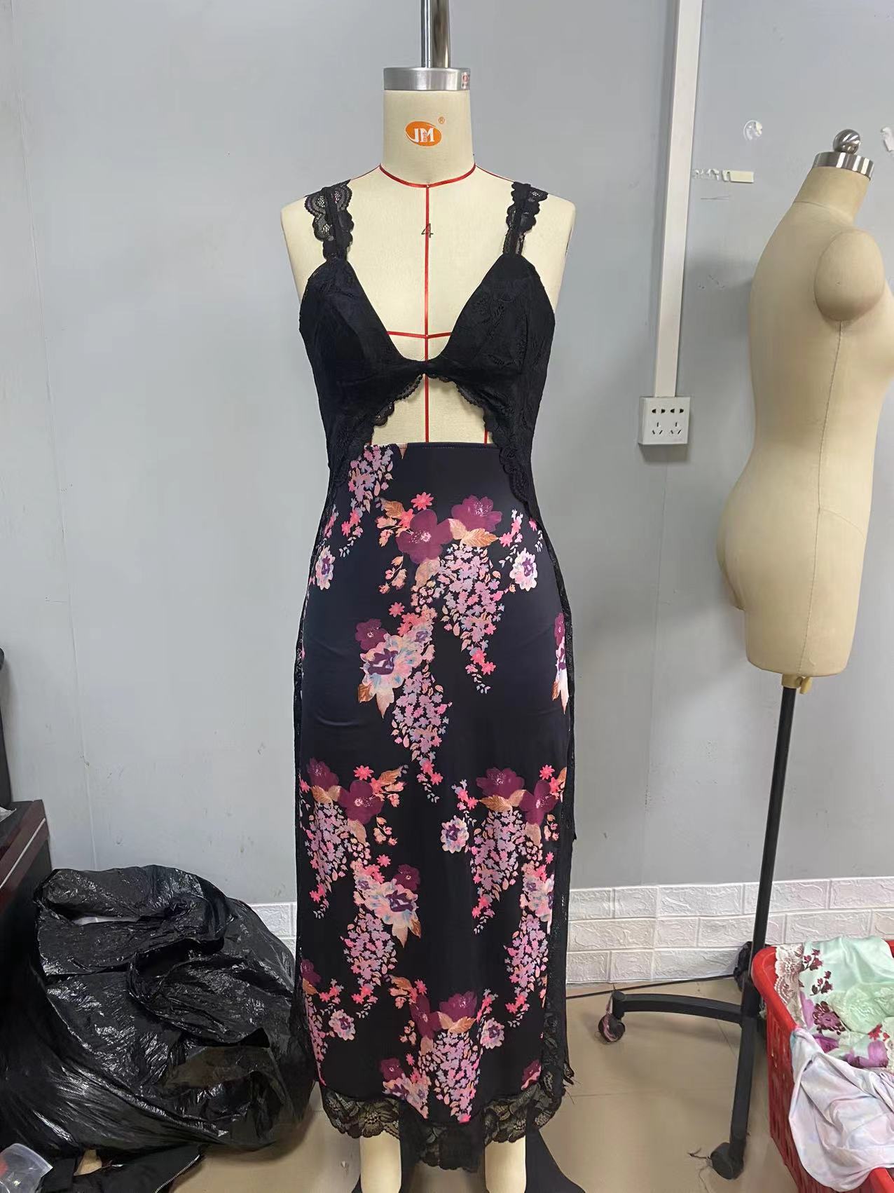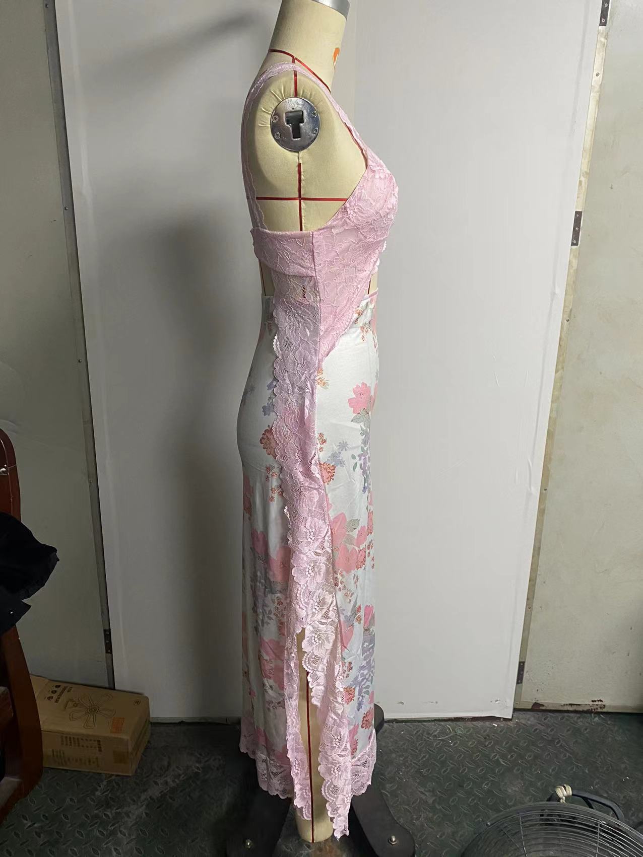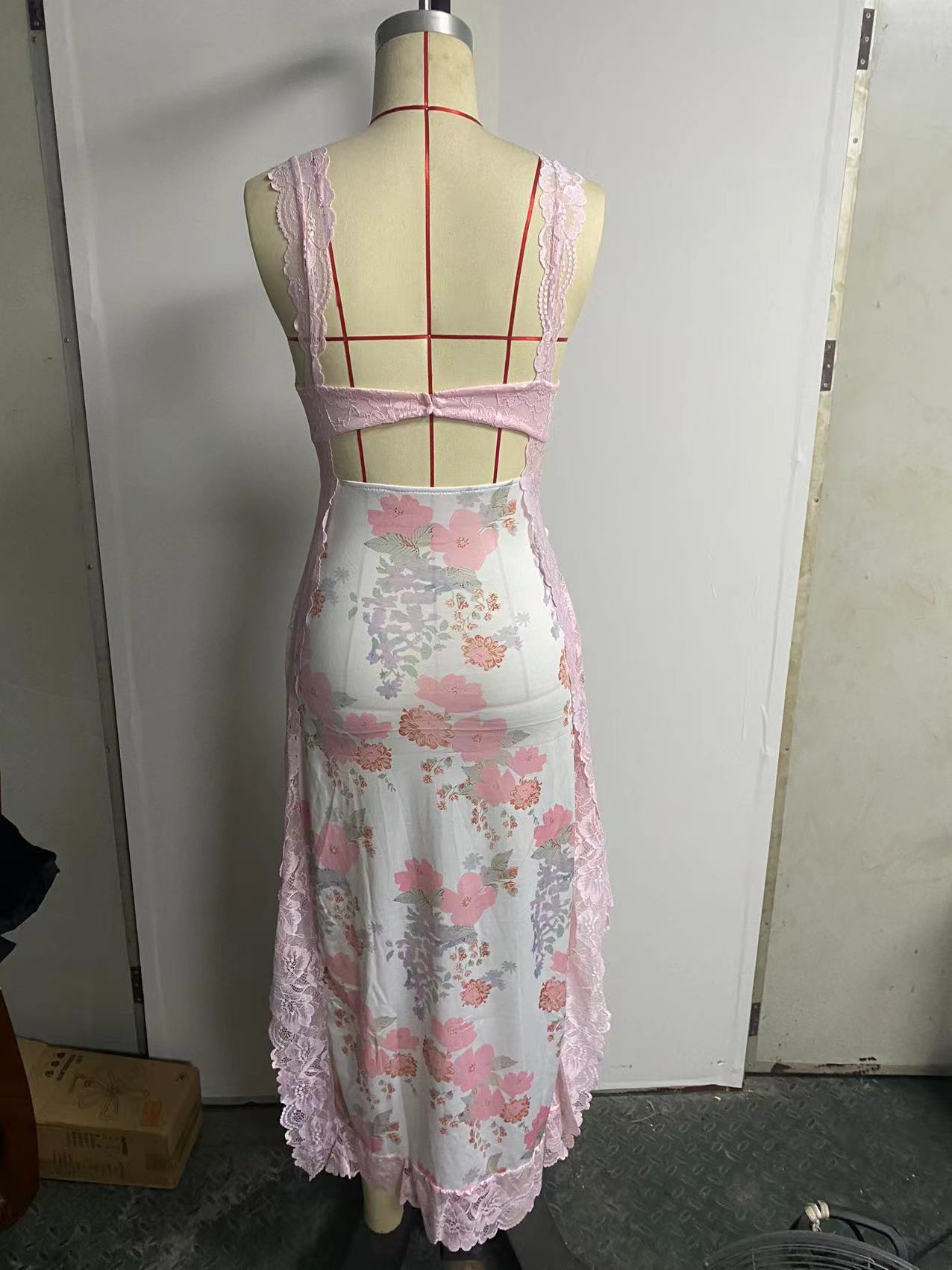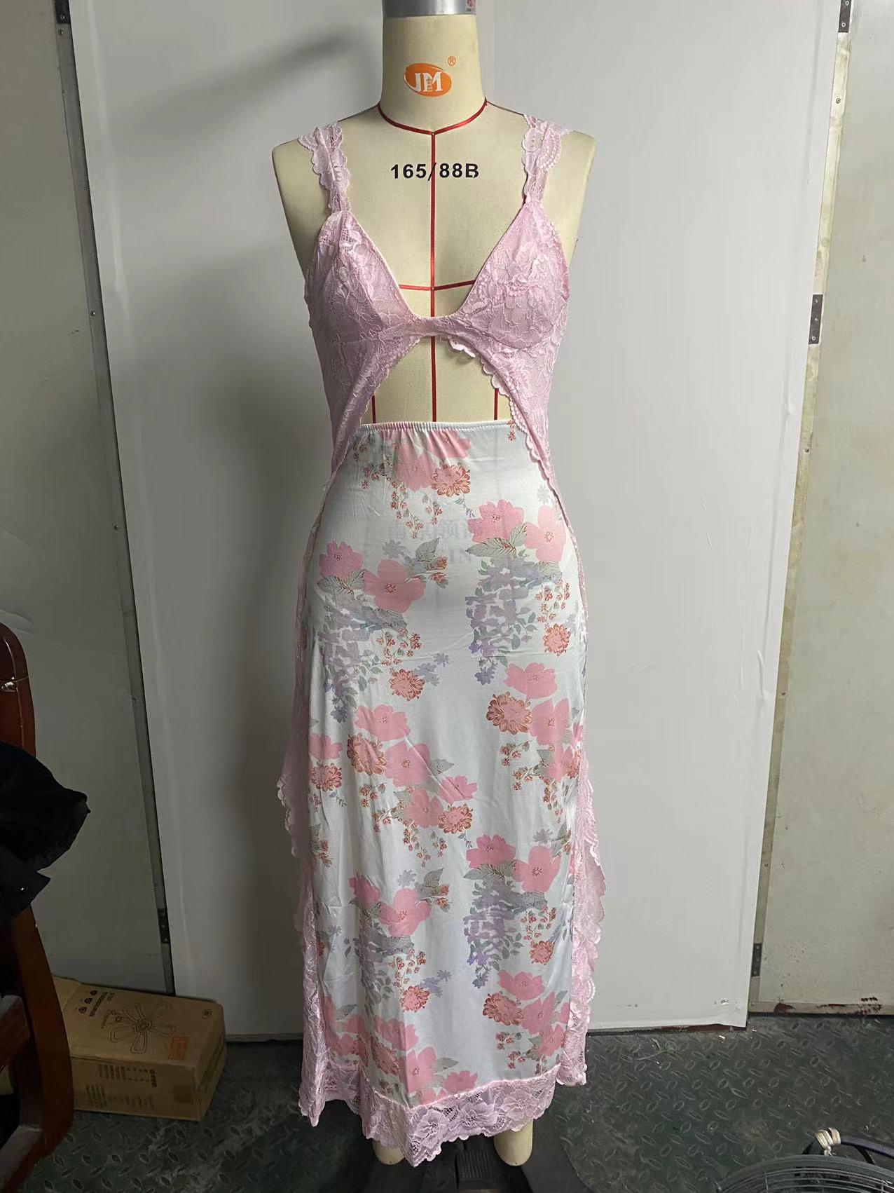 2023 년 여름 새로운 아마존 AliExpress 핑크 부드러운 레이스 어깨 끈 스티칭 벤트 롱 원피스 여성용 의류스토어 가기