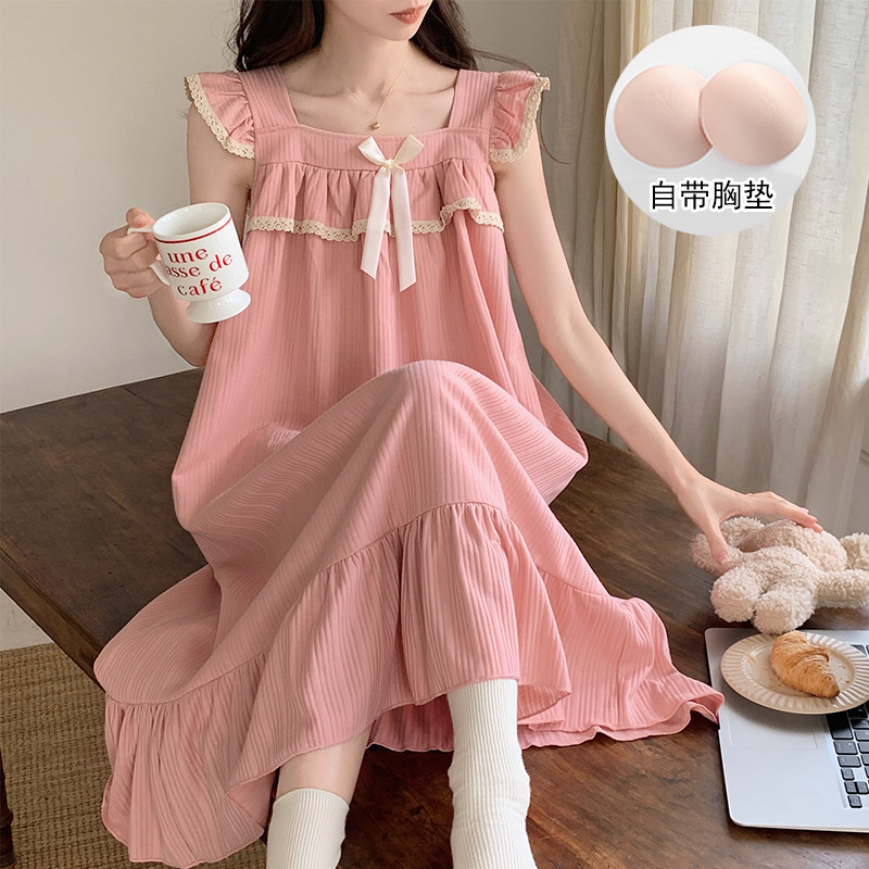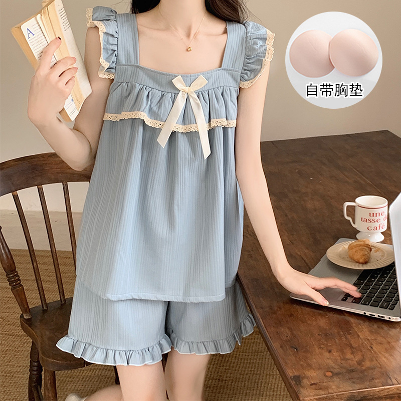 가슴 패드가있는 잠옷 여성용 여름 니트 코튼 섹시 캐미솔 2 피스 여름 여성용 공주 스타일 가정복