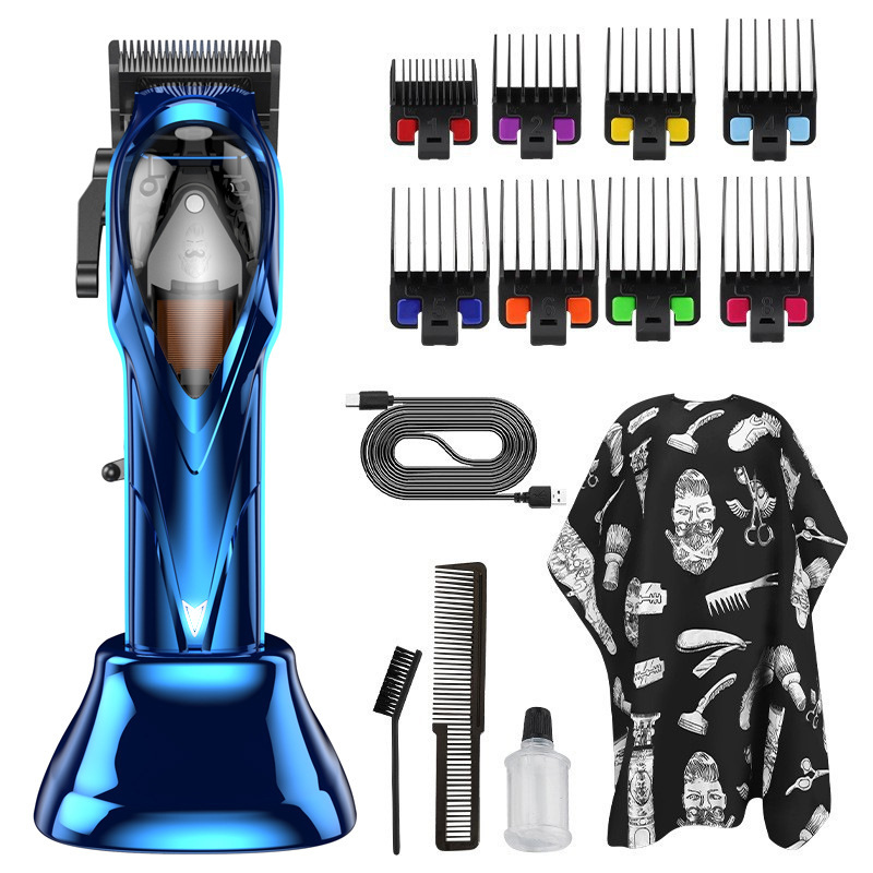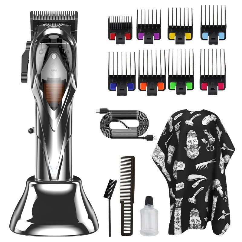 产品配件:主机+USB充电线+充电底座+限位梳*8(1.5 3 4.5 6 10 13 19 25mm)+清洁刷+英文说明书+梳子+围布+3ml润滑油;