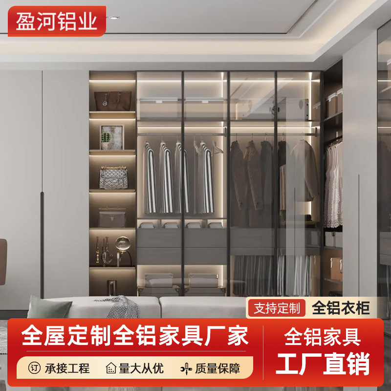 현대적이고 심플한 가정용 침실 유리문(조명 포함) 일체형 금속 알루미늄 합금 옷장, 전체 알루미늄 가구, 공장 직판스토어 가기