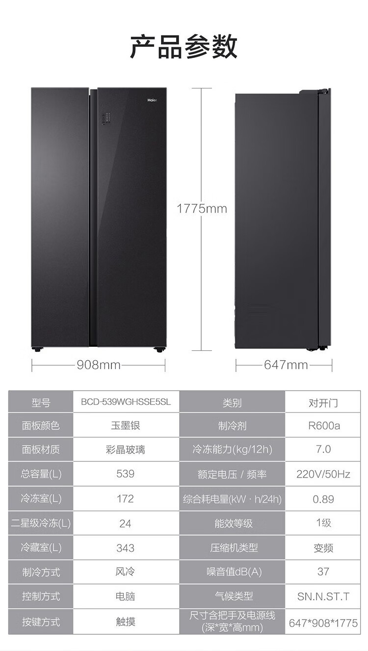 Haier 539 리터 반대쪽 도어 임베디드 냉장고 색상 크리스탈 레벨 1 주파수 변환 건식 및 습식 저장 BCD-539WGHSSE5SL