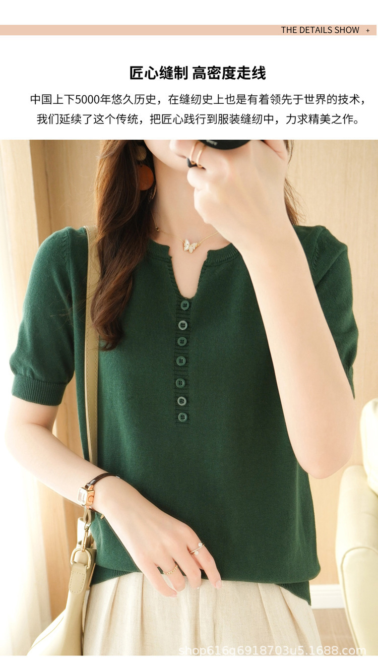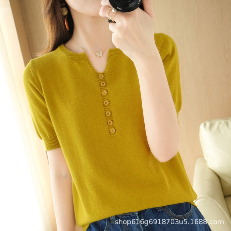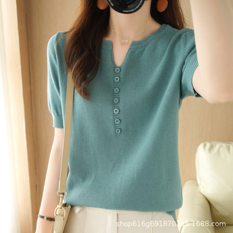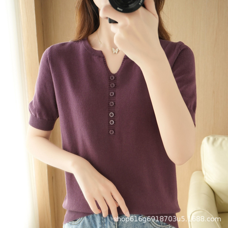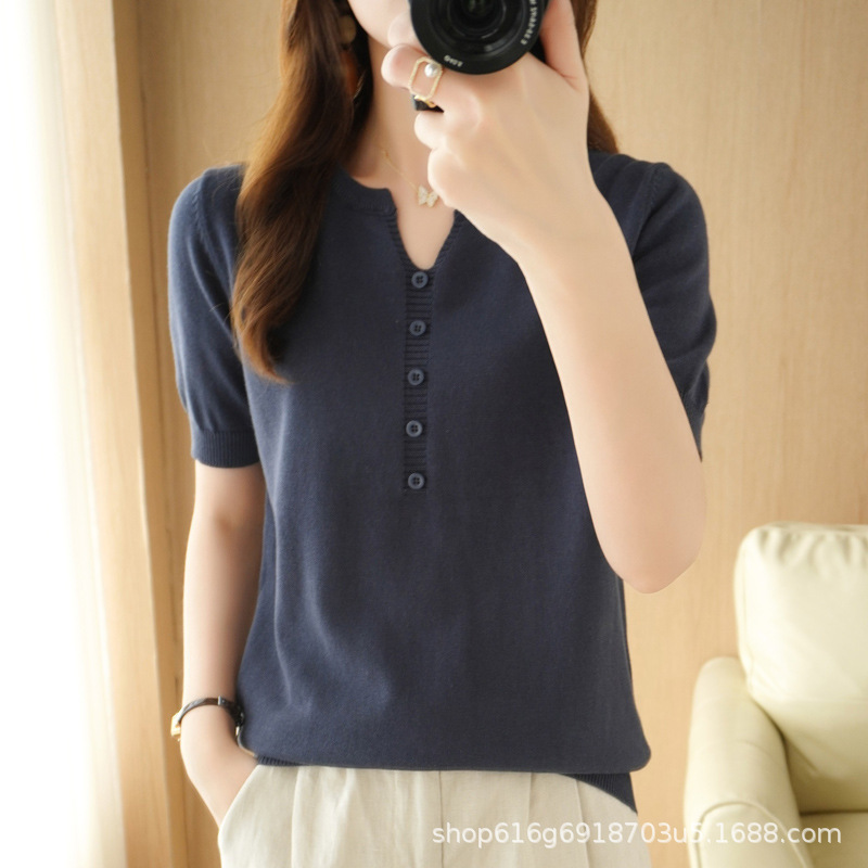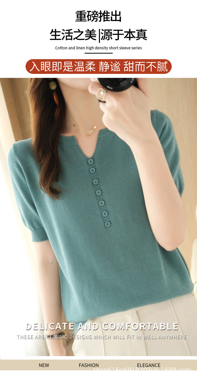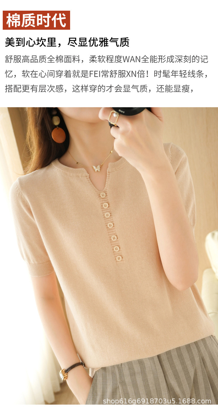 2025 봄 여름 신작 V 넥 반팔 여성용 루즈 풀오버 퓨어 코튼 반팔 코튼과 린넨 니트 다목적 서양식 티셔츠 탑스토어 가기