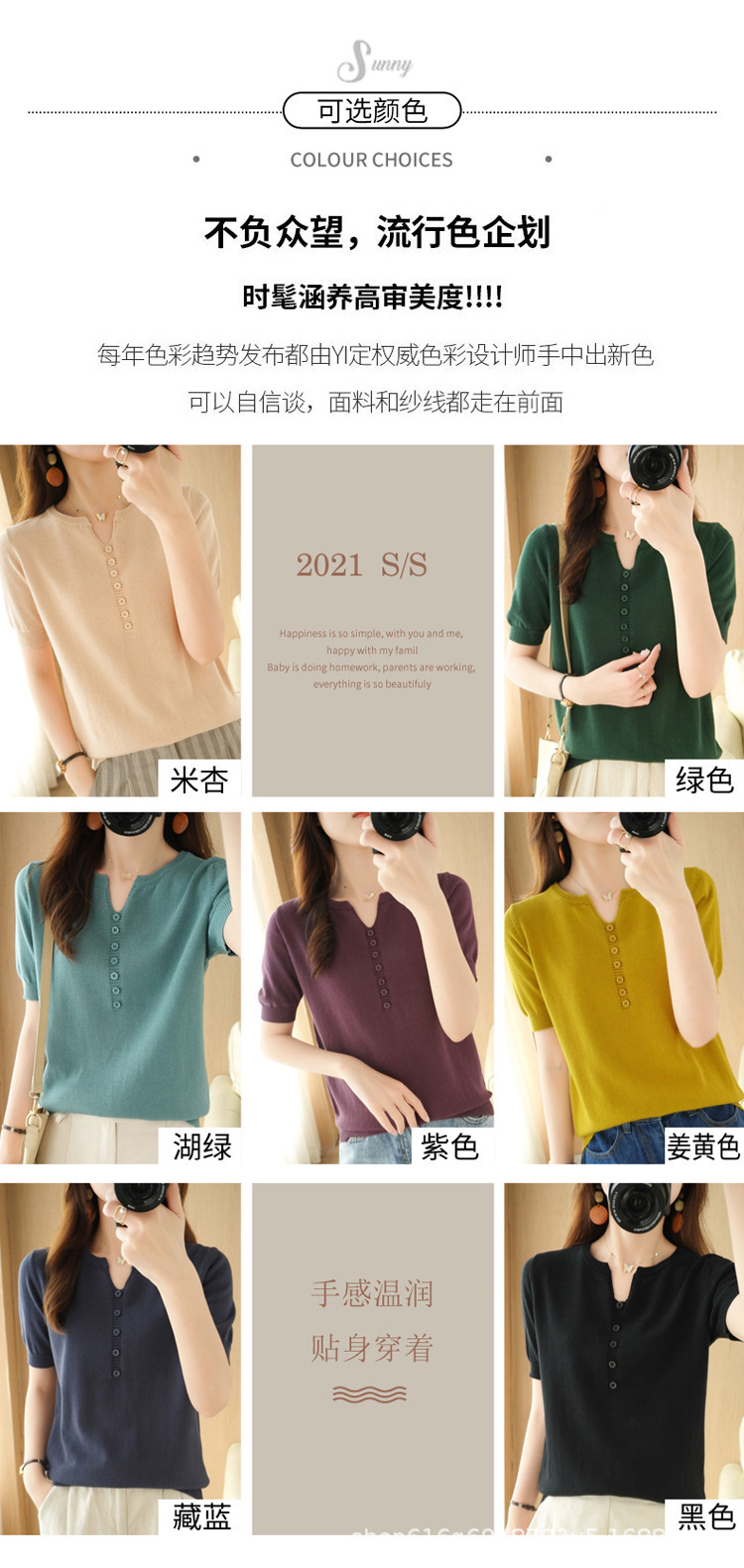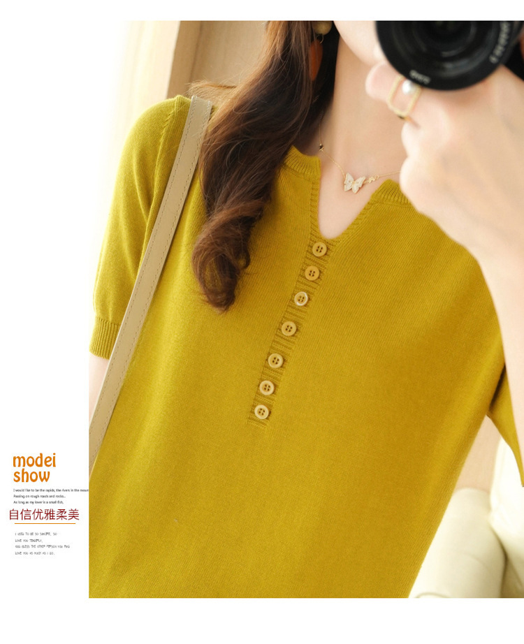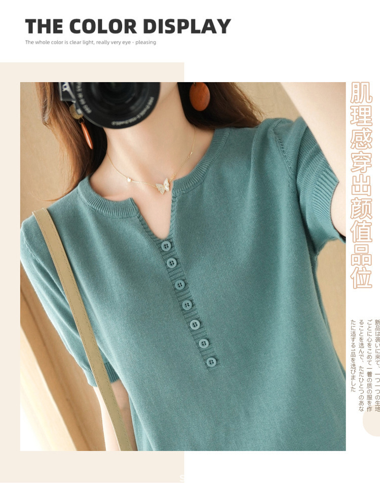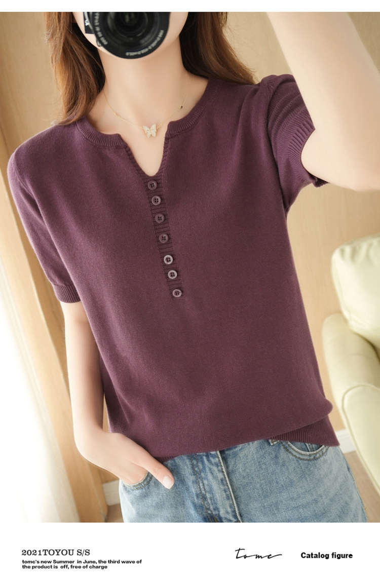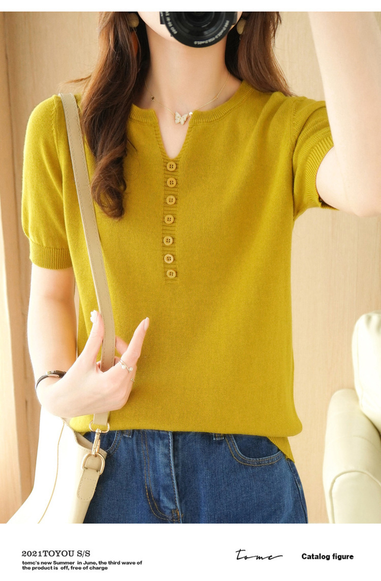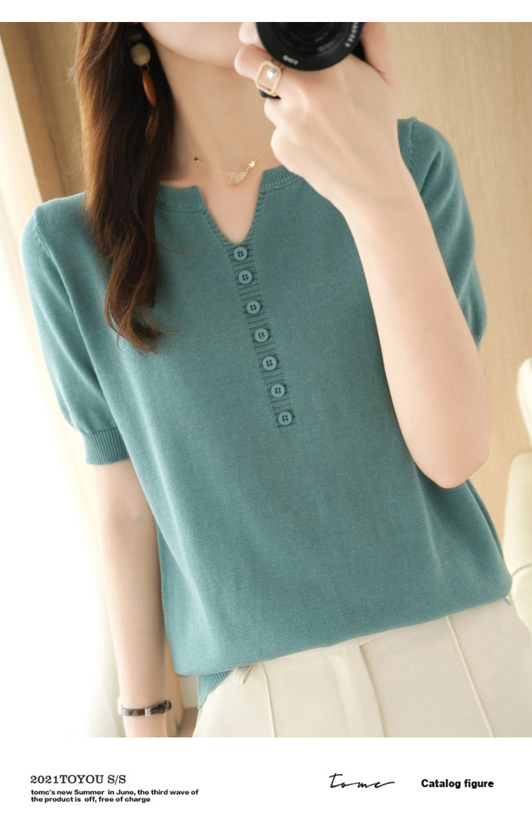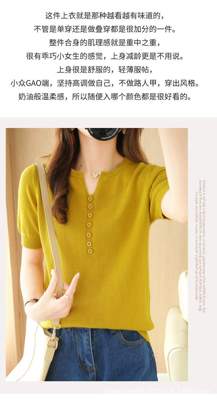 2025 봄 여름 신작 V 넥 반팔 여성용 루즈 풀오버 퓨어 코튼 반팔 코튼과 린넨 니트 다목적 서양식 티셔츠 탑스토어 가기