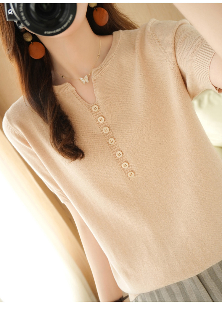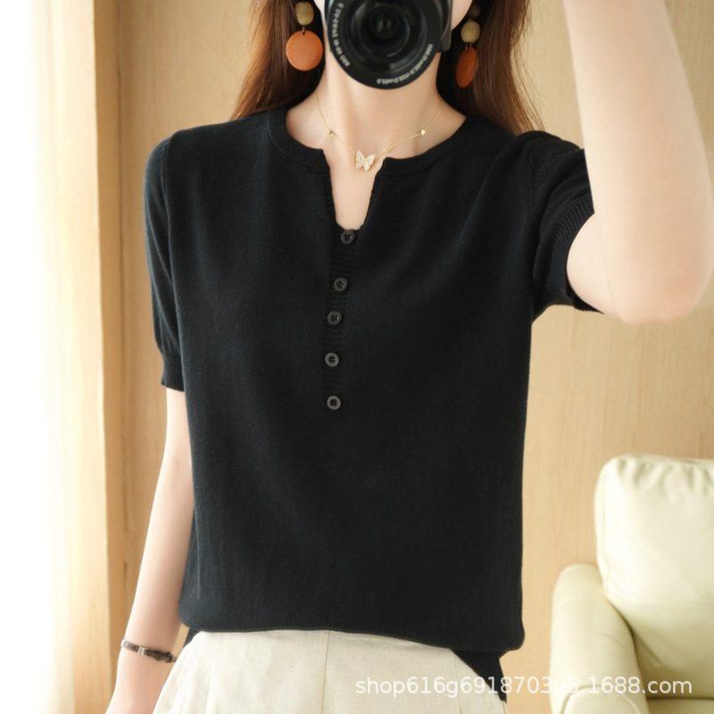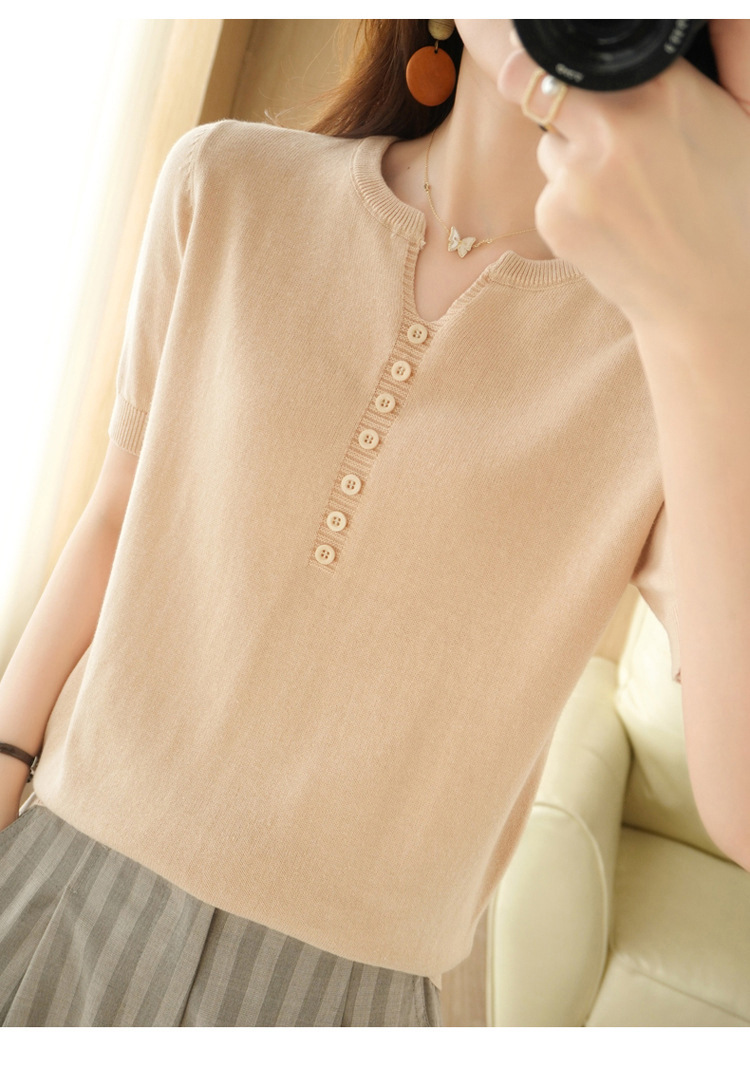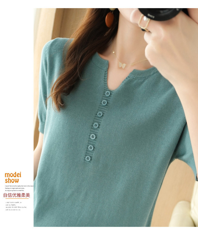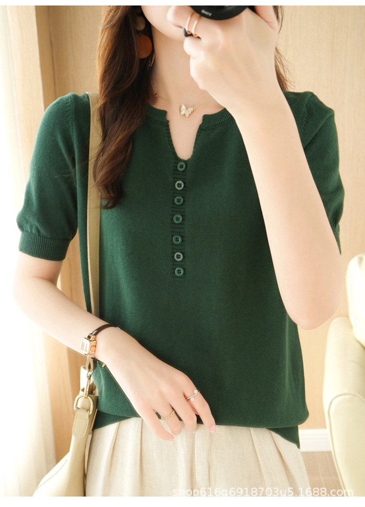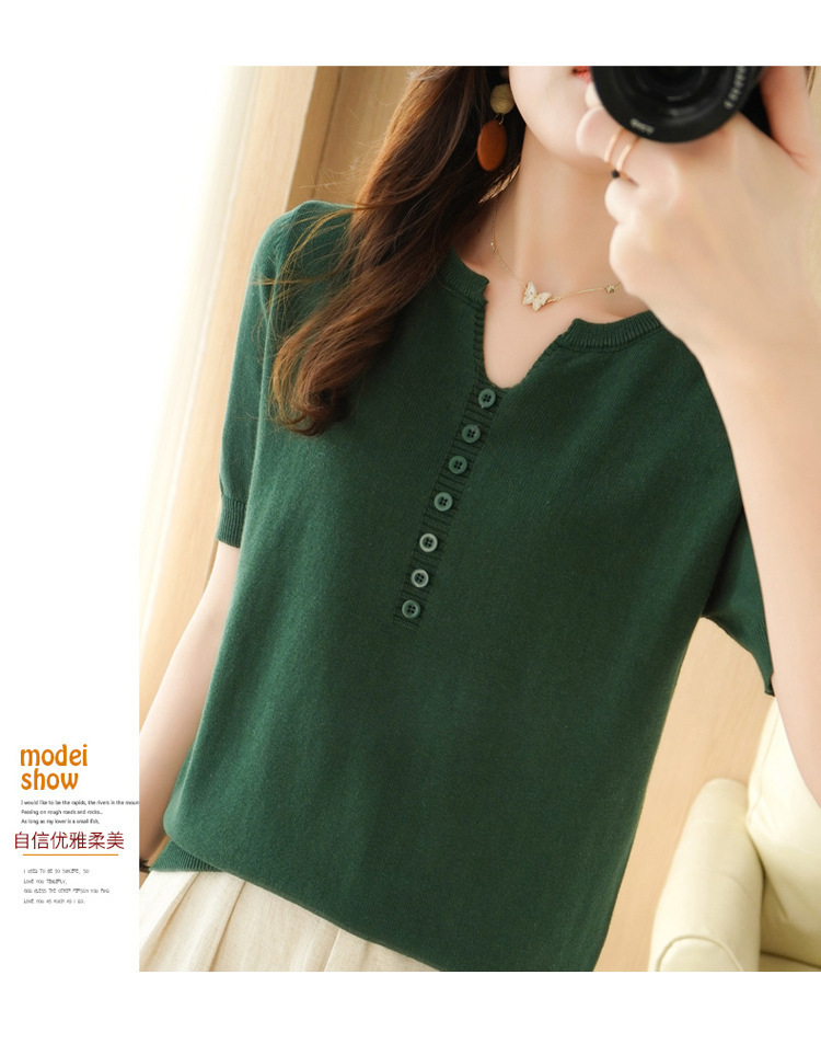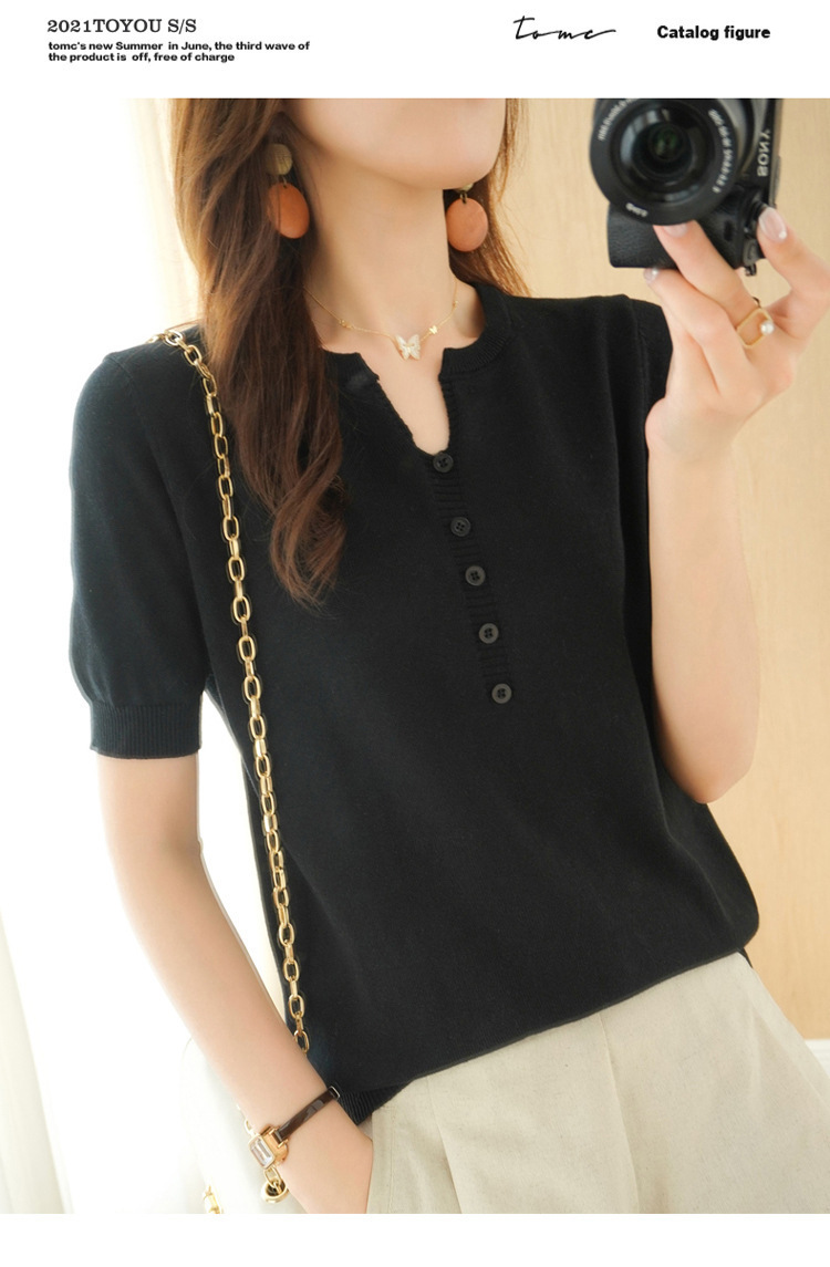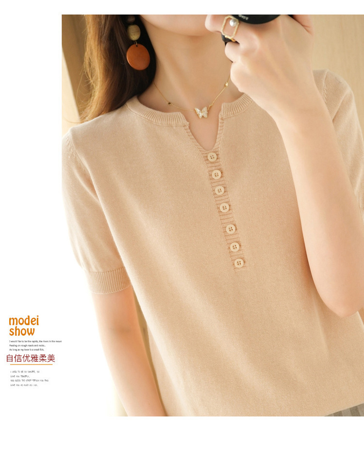 2025 봄 여름 신작 V 넥 반팔 여성용 루즈 풀오버 퓨어 코튼 반팔 코튼과 린넨 니트 다목적 서양식 티셔츠 탑스토어 가기