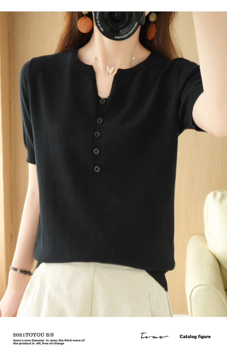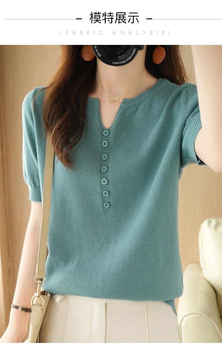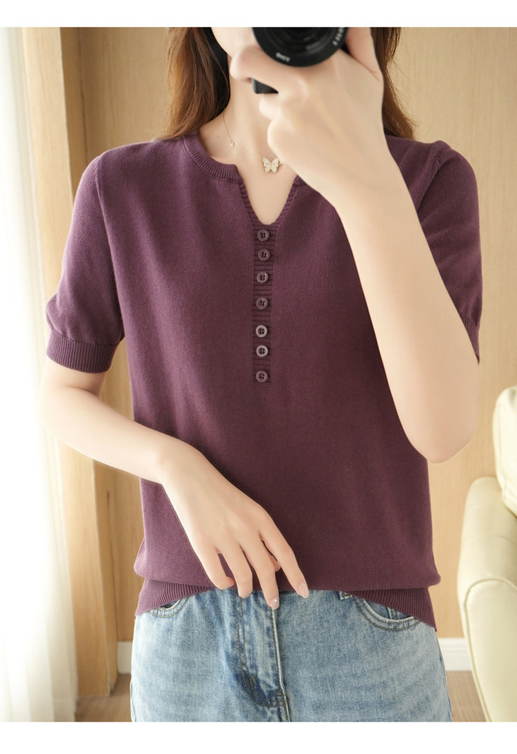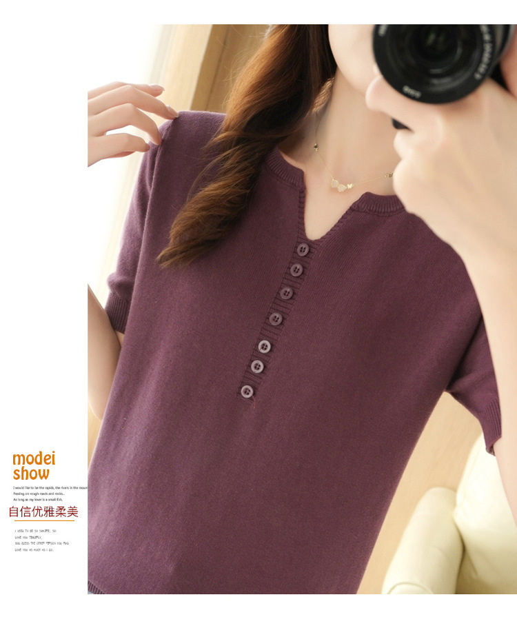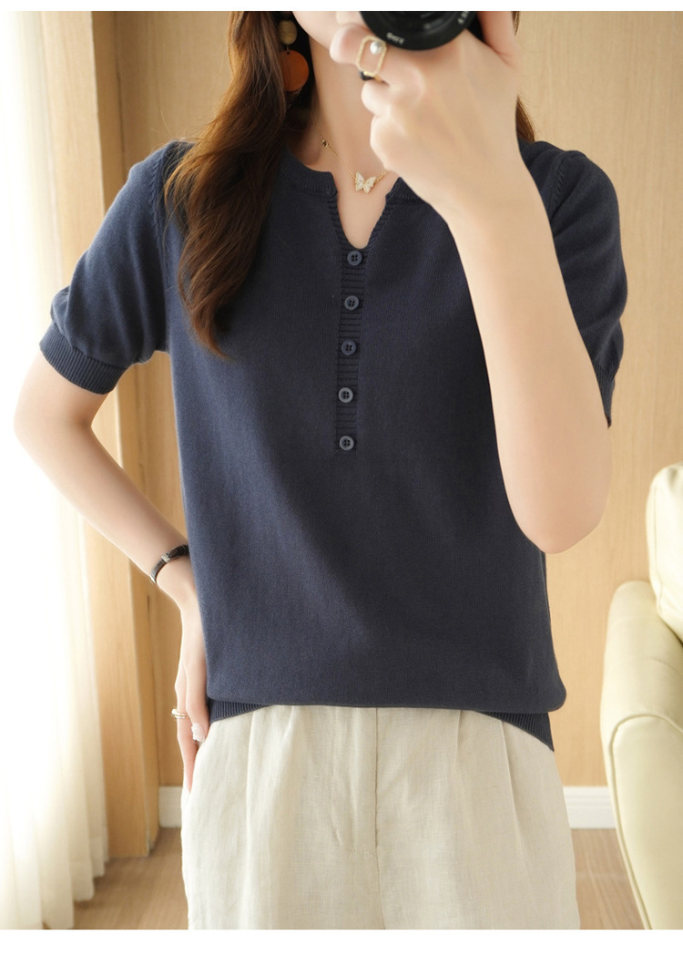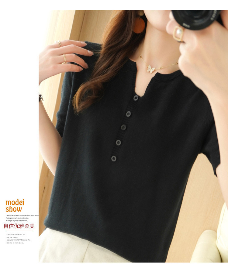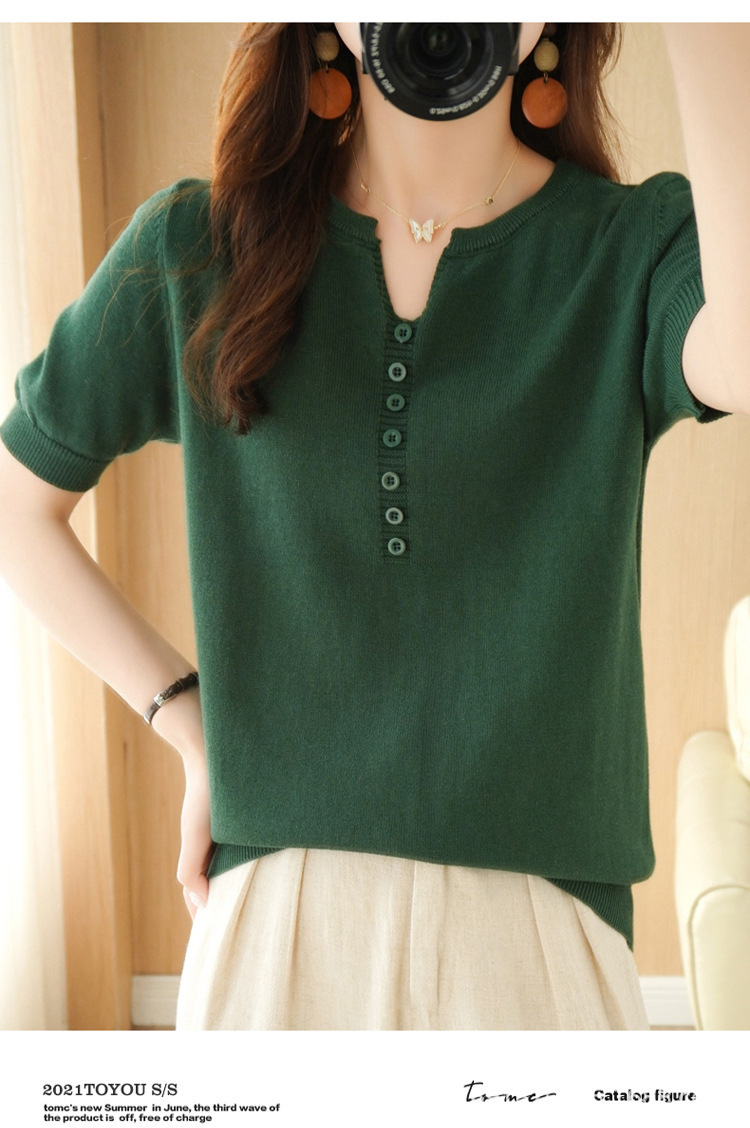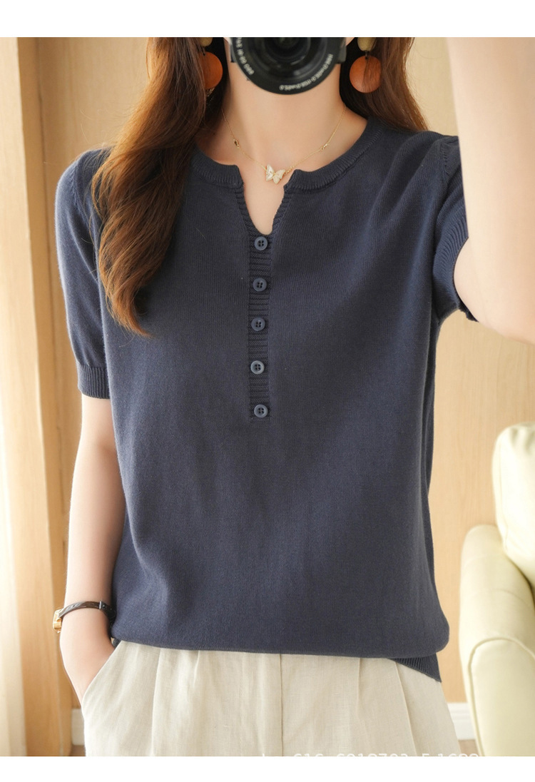 2025 봄 여름 신작 V 넥 반팔 여성용 루즈 풀오버 퓨어 코튼 반팔 코튼과 린넨 니트 다목적 서양식 티셔츠 탑스토어 가기