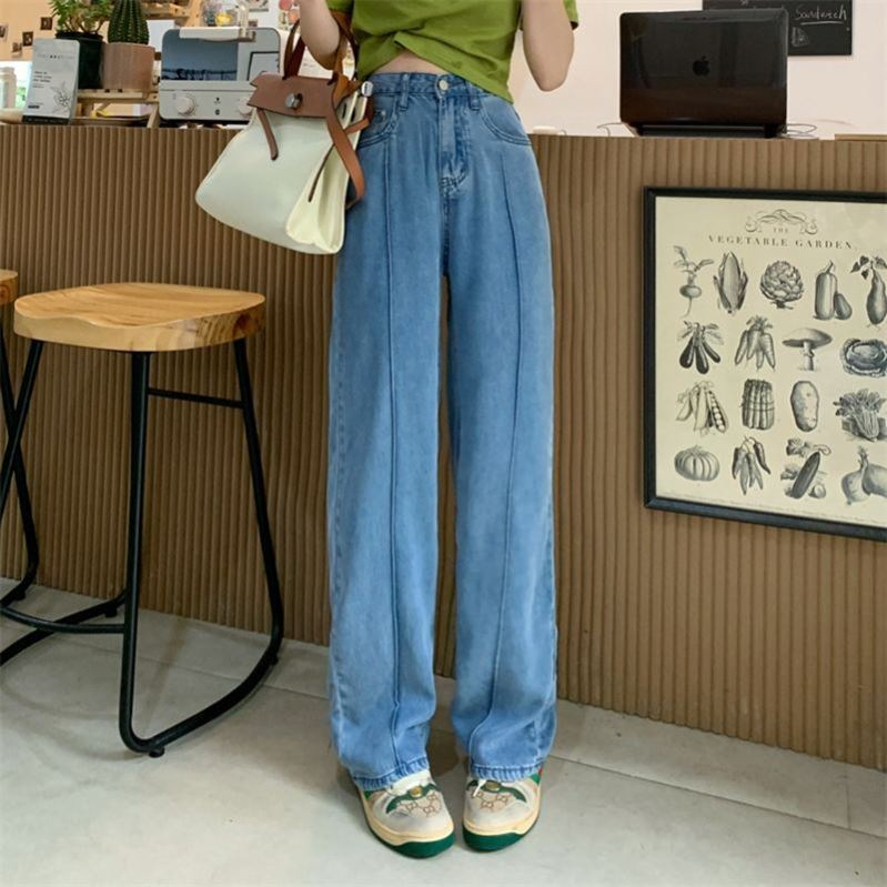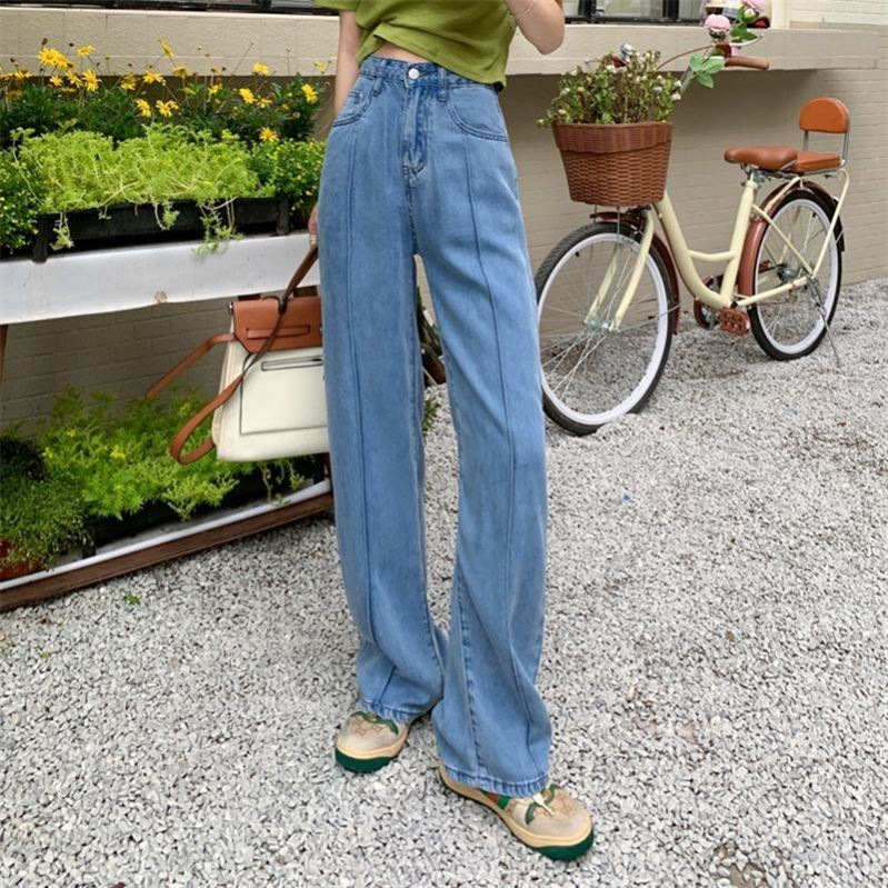 높은 허리 넓은 다리 인공 텐셀 청바지 여성 여름 드레이핑 얇은 느슨한 얼음 실크 스트레이트 팬츠 바지 인터넷 유명 여성 의류스토어 가기