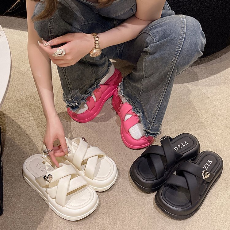 2023 여름 새 여성용 슬리퍼 여성용 아우터 크로스 두꺼운 밑창 비치 샌들 캐주얼 페어리 스타일 높이 여성 신발