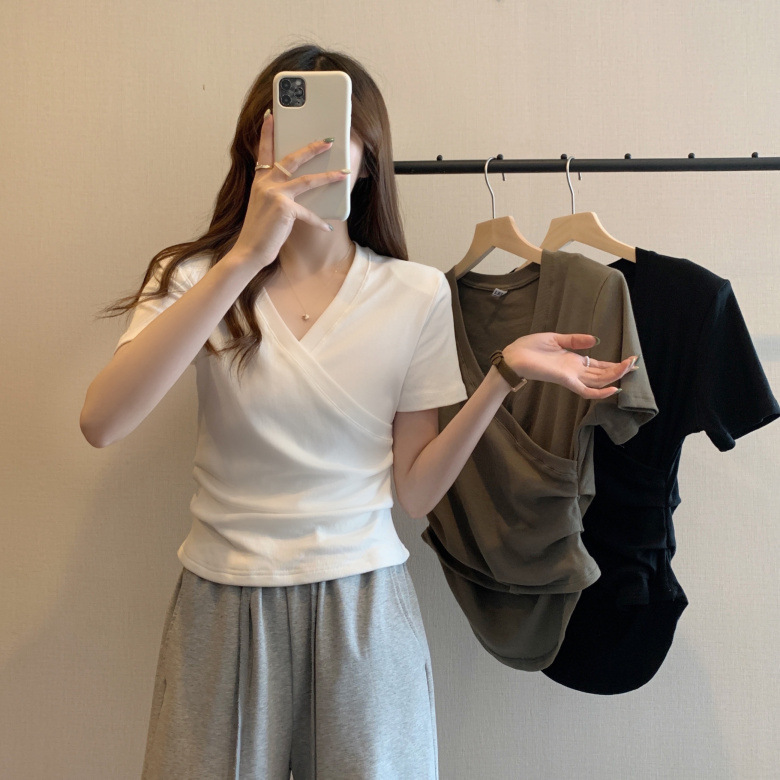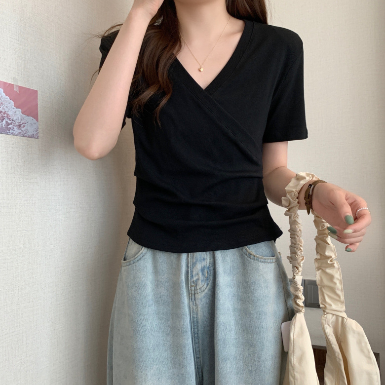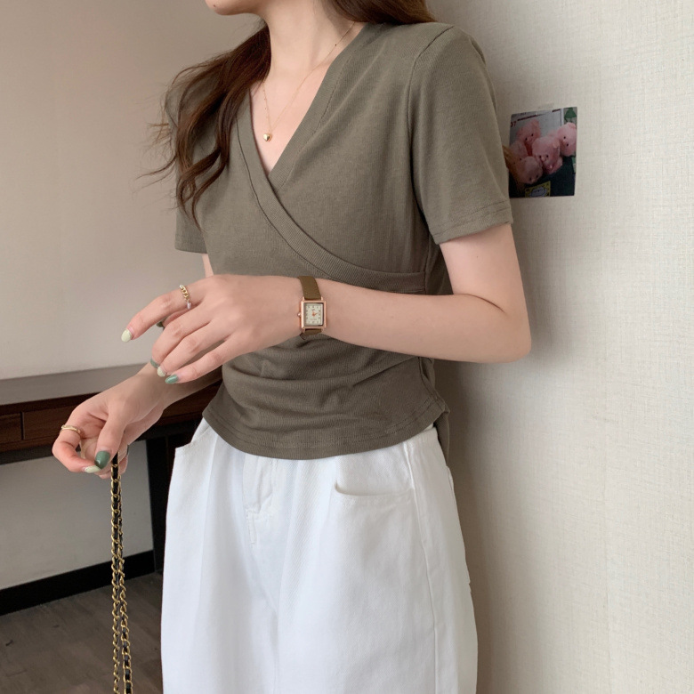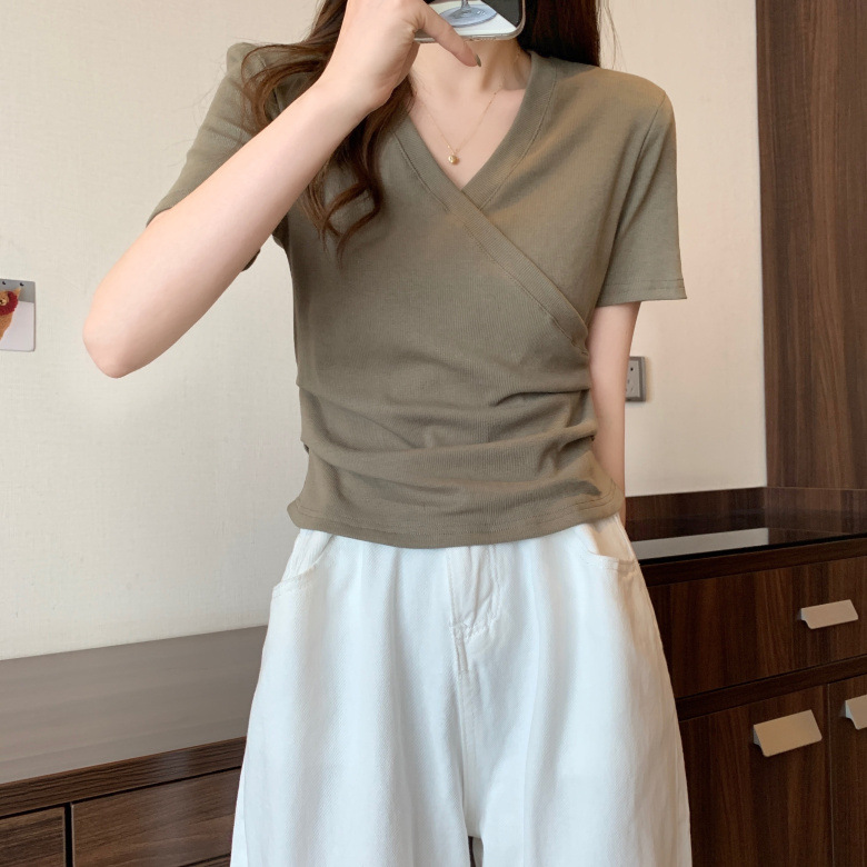 2025 새로운 여름 디자인 슬림 피트 짧은 학생 슬림 피트 탑 트렌디 크로스 v 넥 반팔 티셔츠 여성용스토어 가기