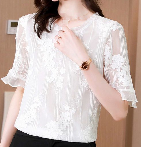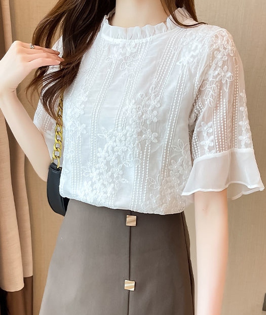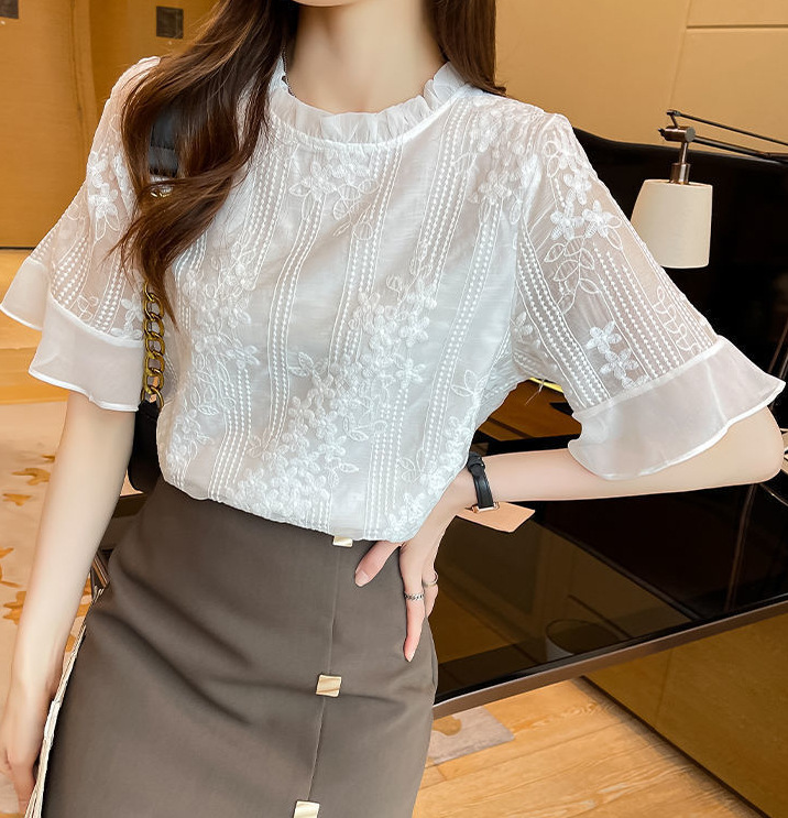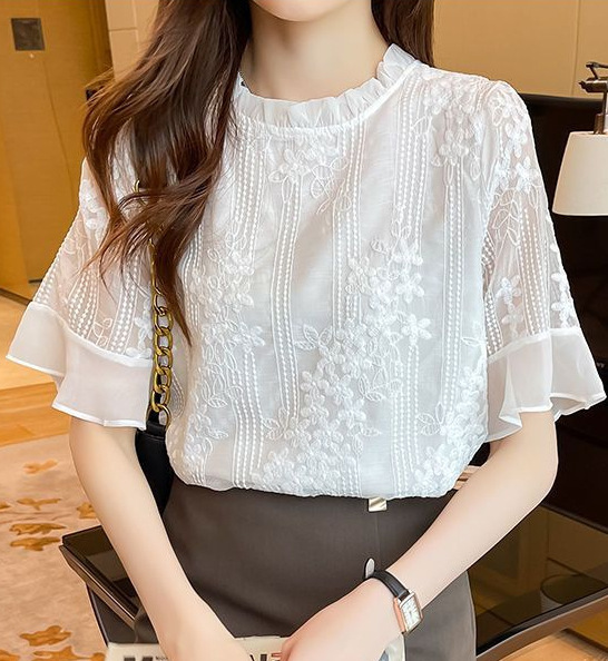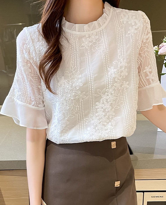 쉬폰 셔츠 흰색 반 소매 티셔츠 여성용 2023 새로운 여름 반팔 우드 이어 칼라 셔츠 안티 실크 탑 작은 셔츠스토어 가기