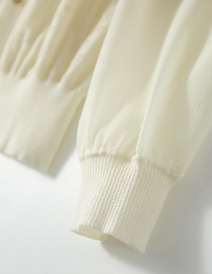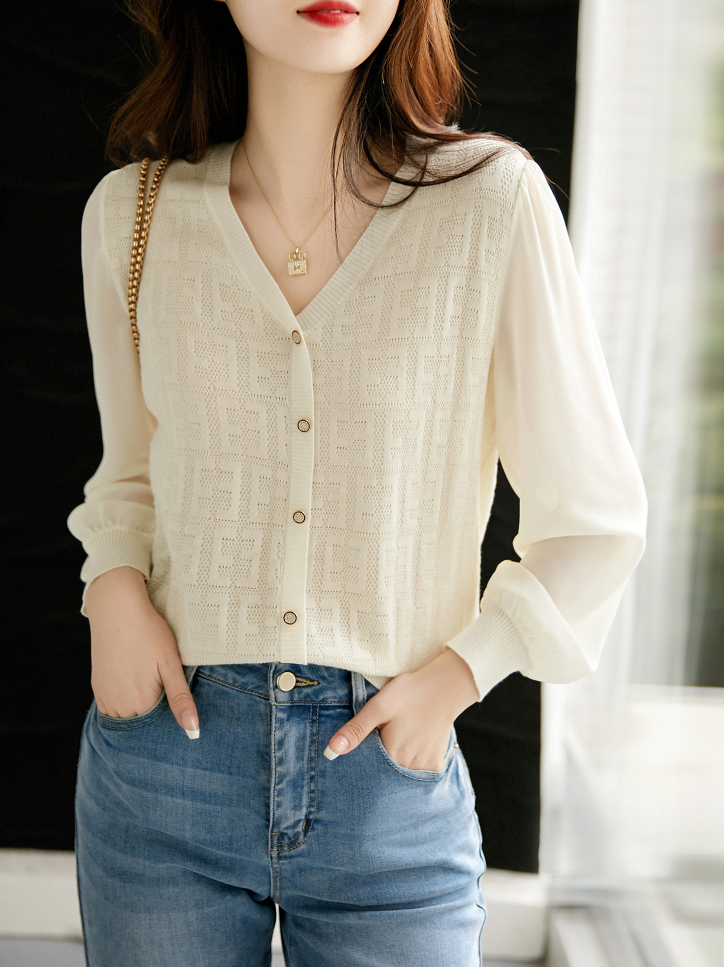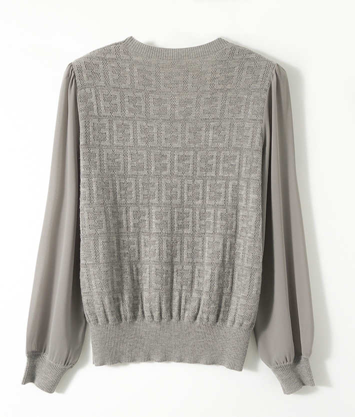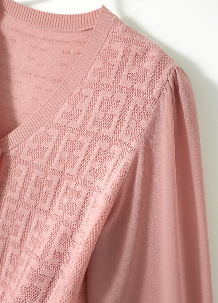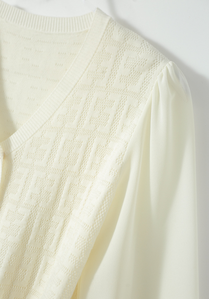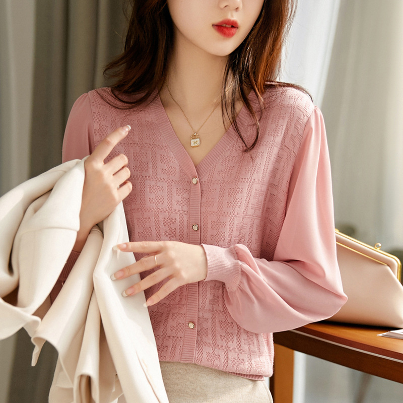 봄과 가을 2024 새로운 여성의 긴 소매 할로우 쉬폰 스티칭 V-넥 니트 베이스 셔츠 웨스턴 스타일 탑스토어 가기