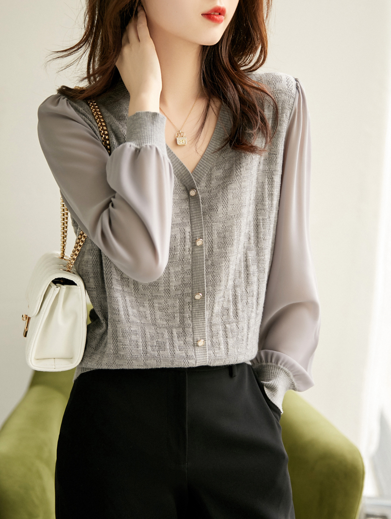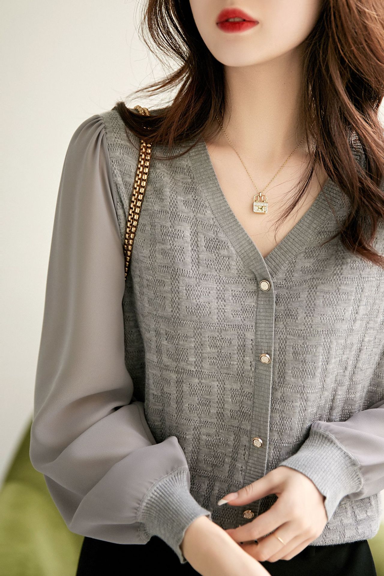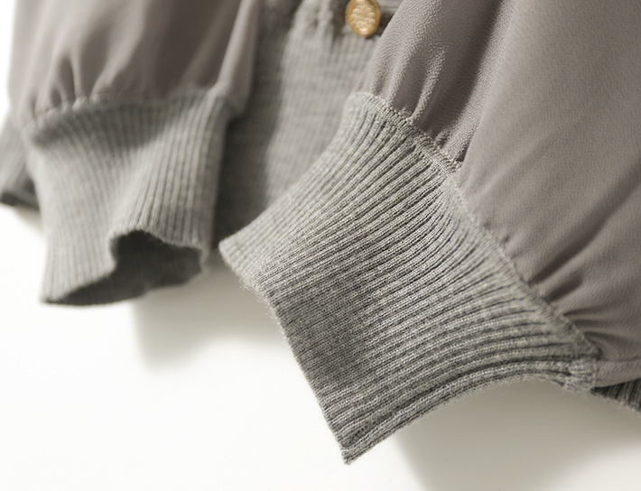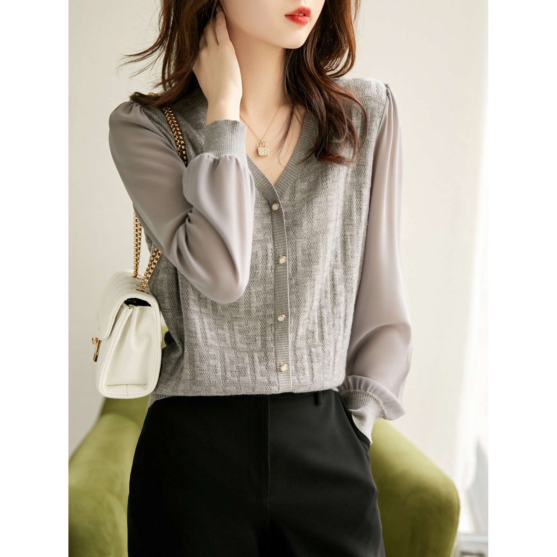 봄과 가을 2024 새로운 여성의 긴 소매 할로우 쉬폰 스티칭 V-넥 니트 베이스 셔츠 웨스턴 스타일 탑스토어 가기