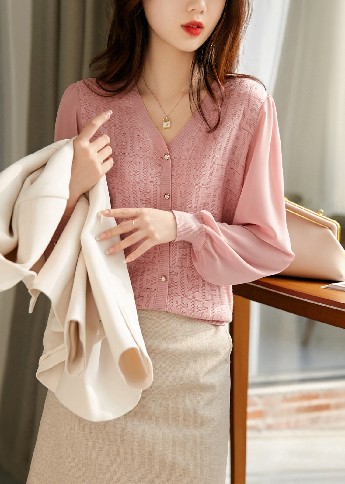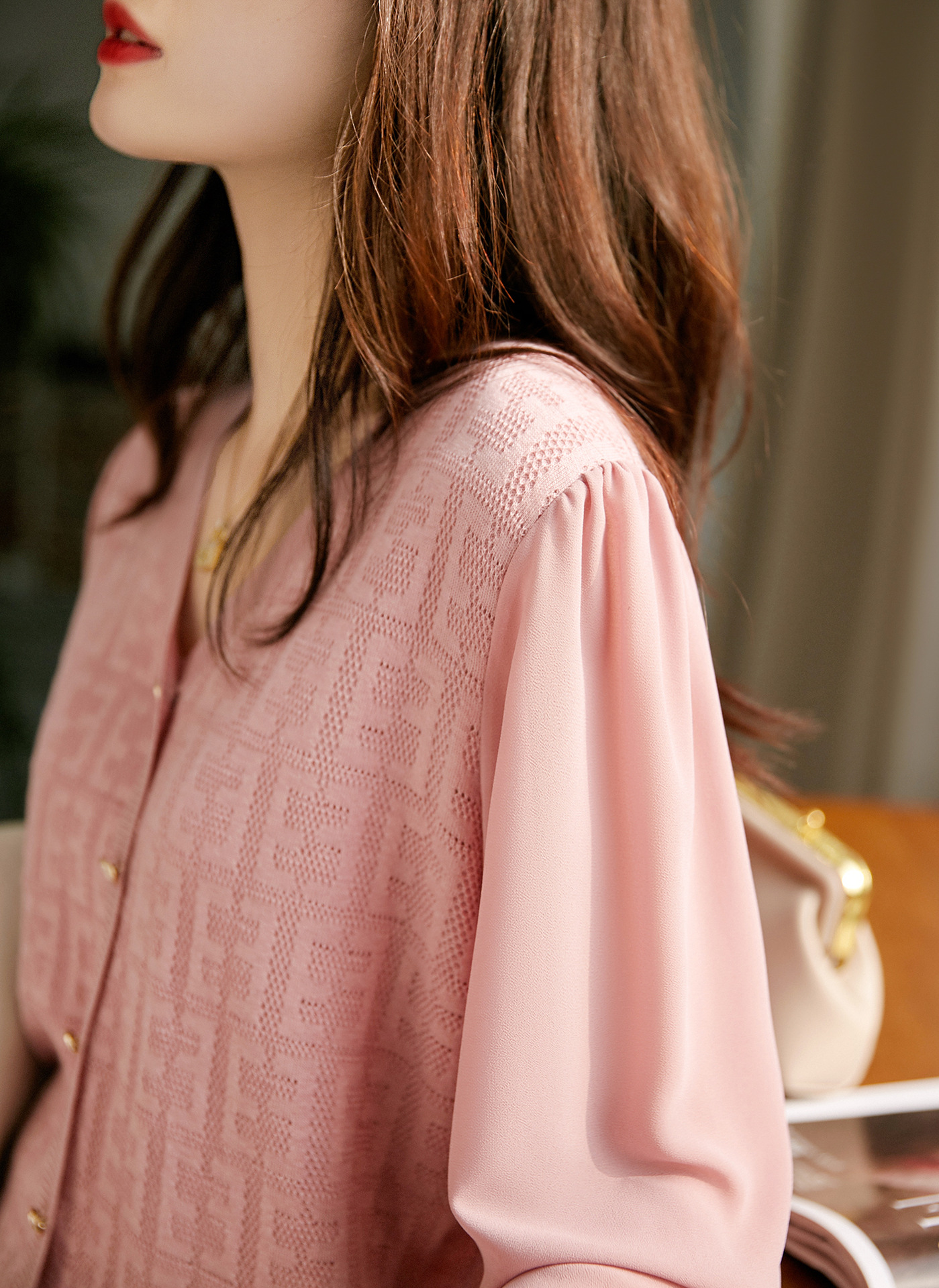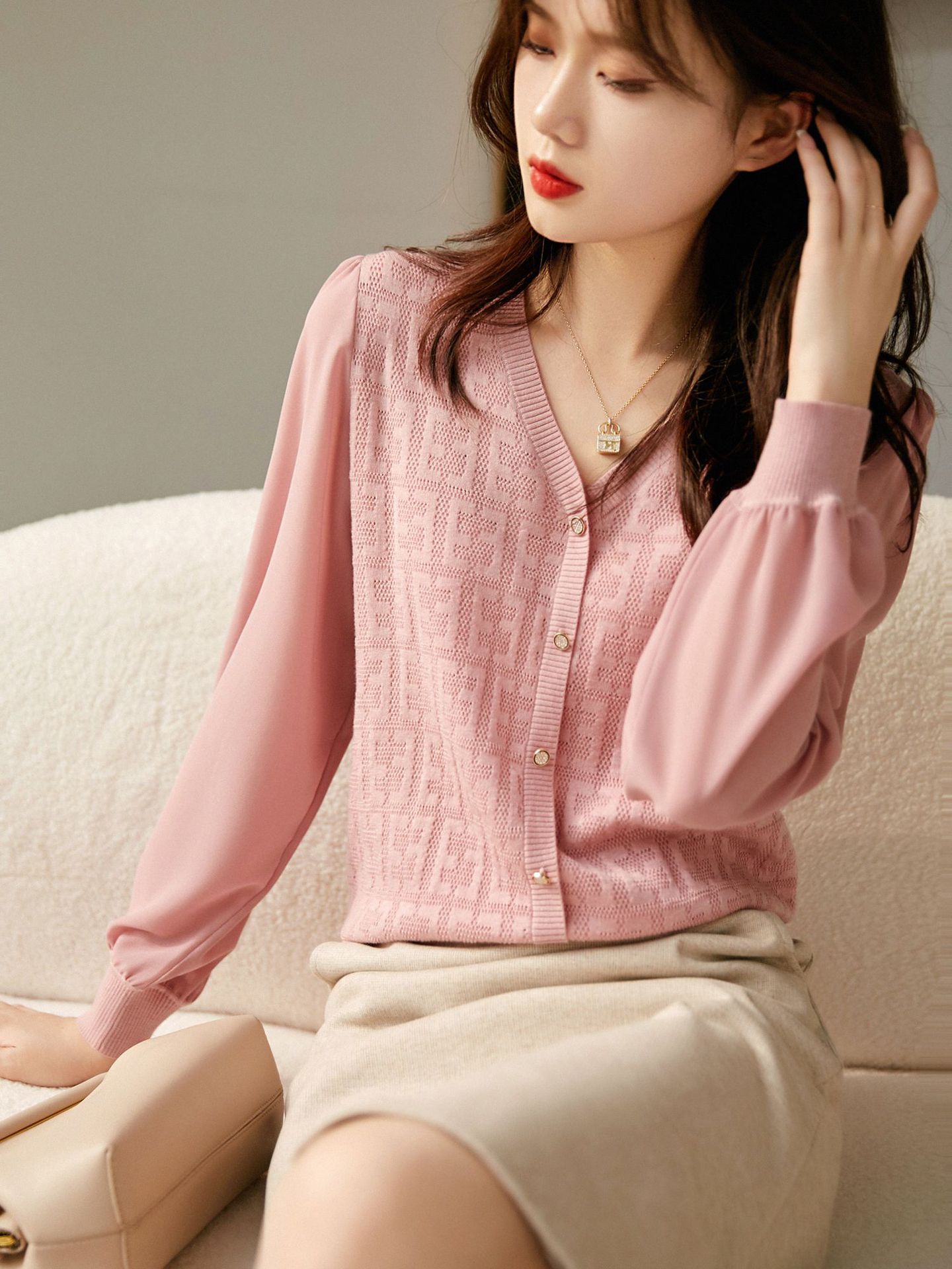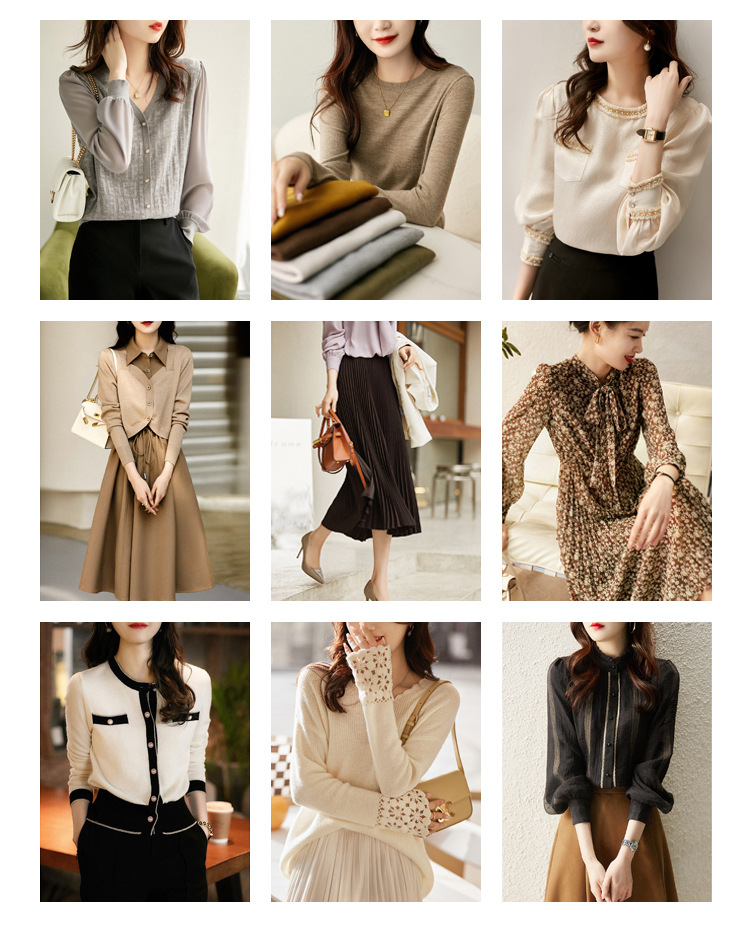 봄과 가을 2024 새로운 여성의 긴 소매 할로우 쉬폰 스티칭 V-넥 니트 베이스 셔츠 웨스턴 스타일 탑스토어 가기