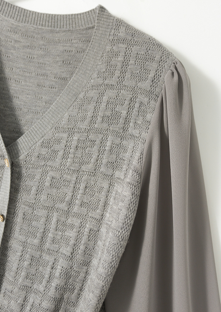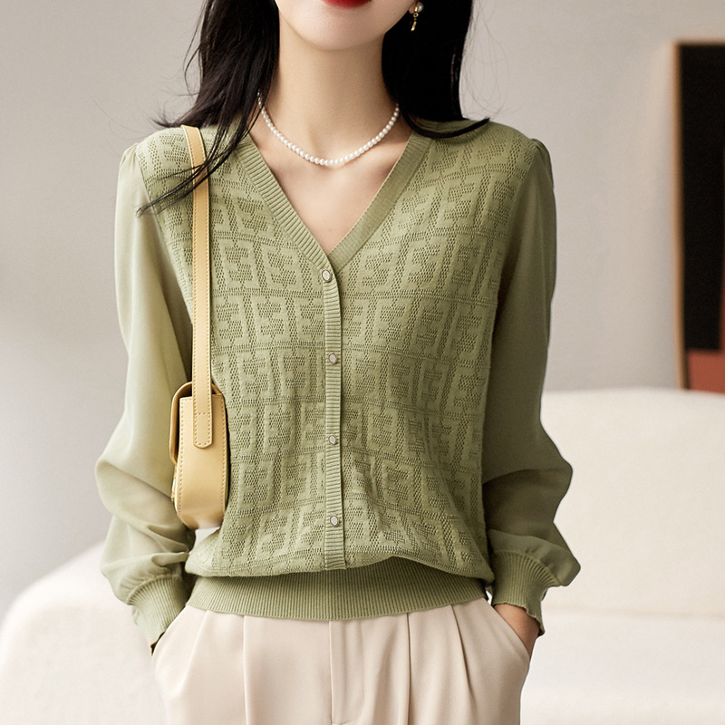 봄과 가을 2024 새로운 여성의 긴 소매 할로우 쉬폰 스티칭 V-넥 니트 베이스 셔츠 웨스턴 스타일 탑