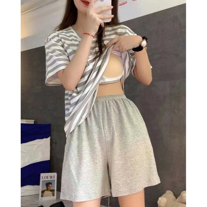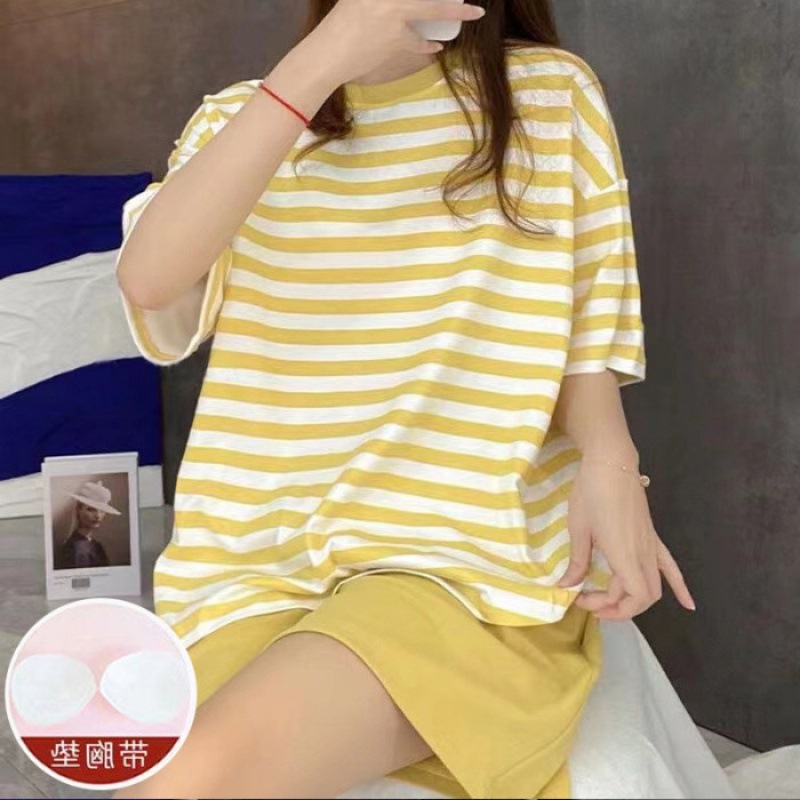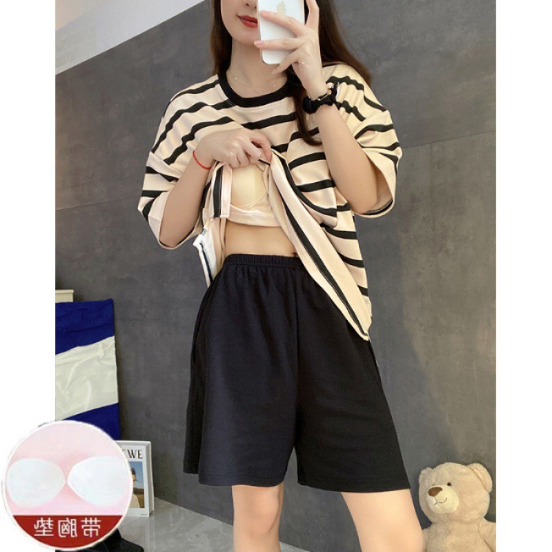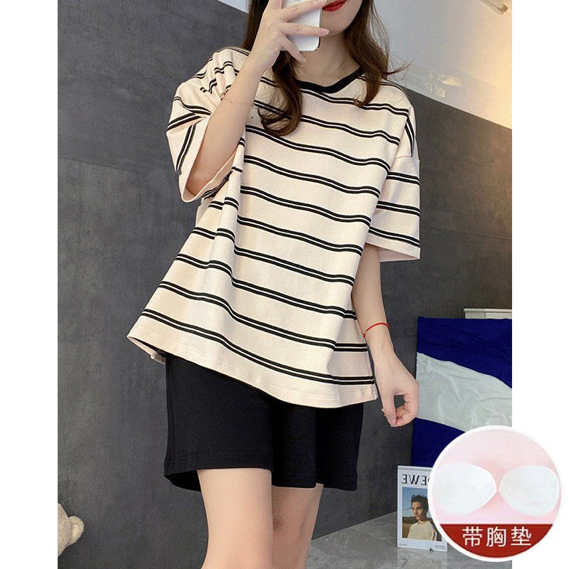 가슴 패드가있는 여성용 잠옷 여름 새로운 스타일 모조 면 반팔 스트라이프 세트 달콤한 심플 느슨한 겉옷 착용