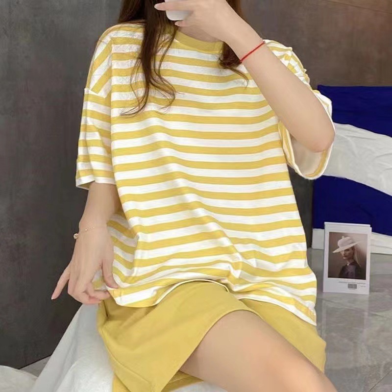 가슴 패드가있는 여성용 잠옷 여름 새로운 스타일 모조 면 반팔 스트라이프 세트 달콤한 심플 느슨한 겉옷 착용스토어 가기