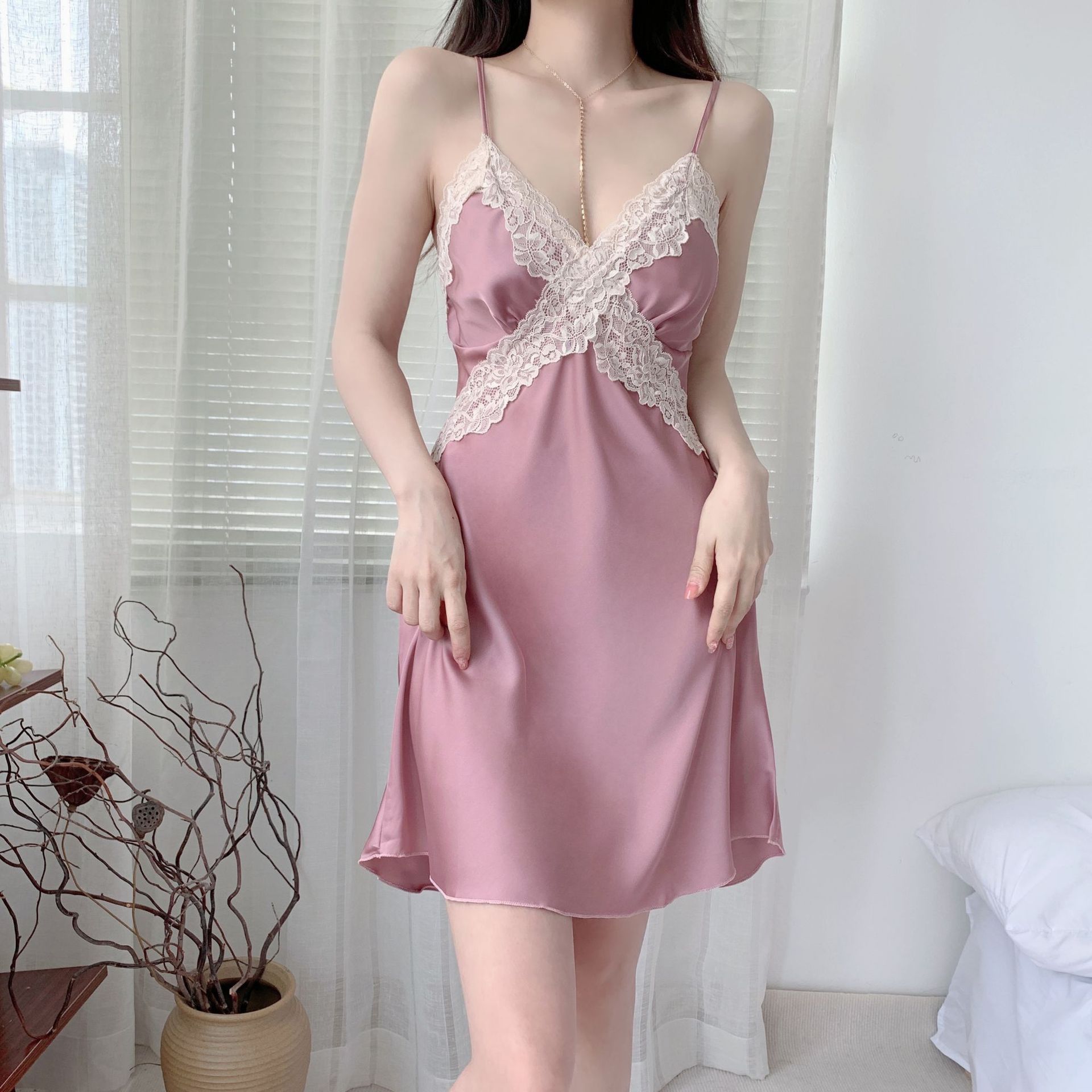 인터넷 연예인 섹시한 잠옷 하이 엔드 여성용 여름 아이스 실크 슬링 잠옷 순수 레이스 유혹 새틴 얇은 잠옷스토어 가기