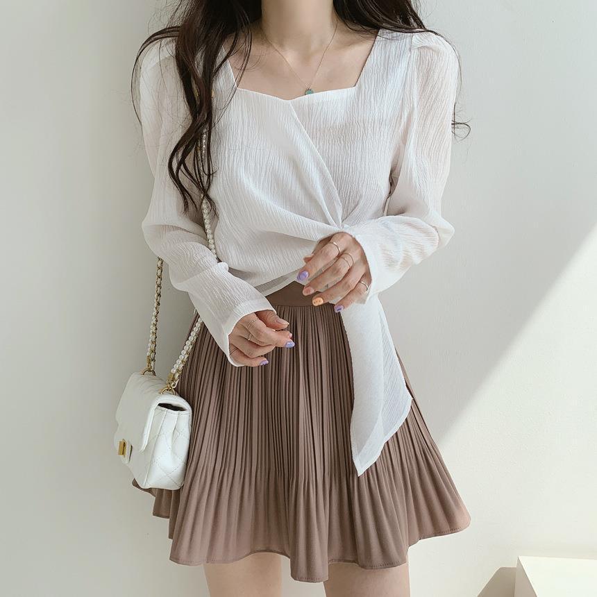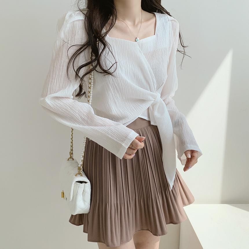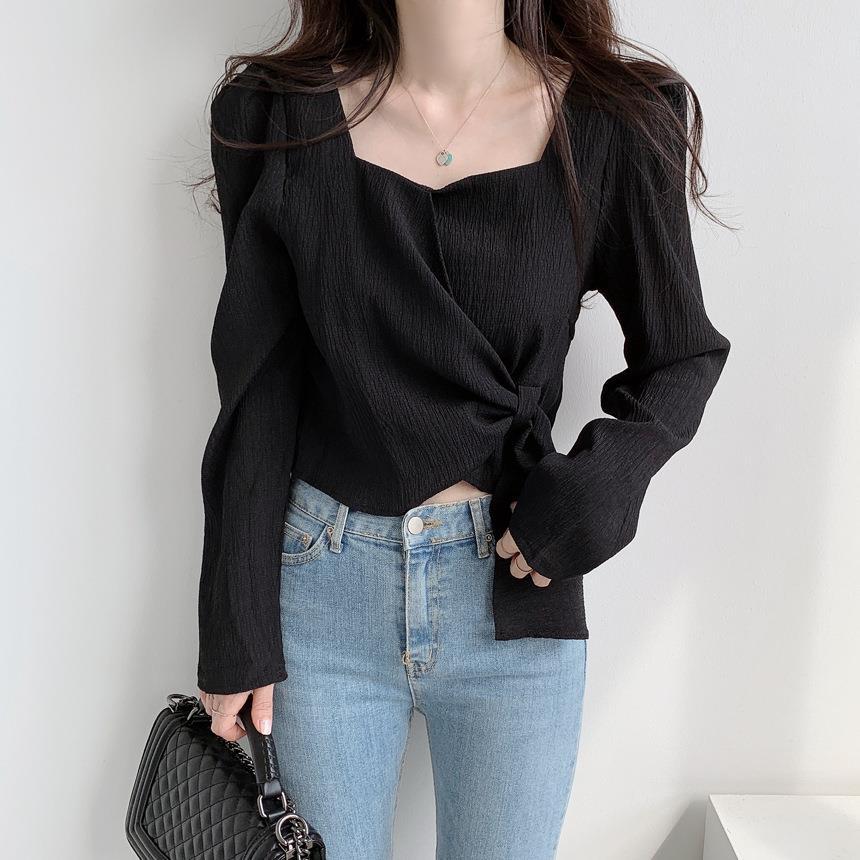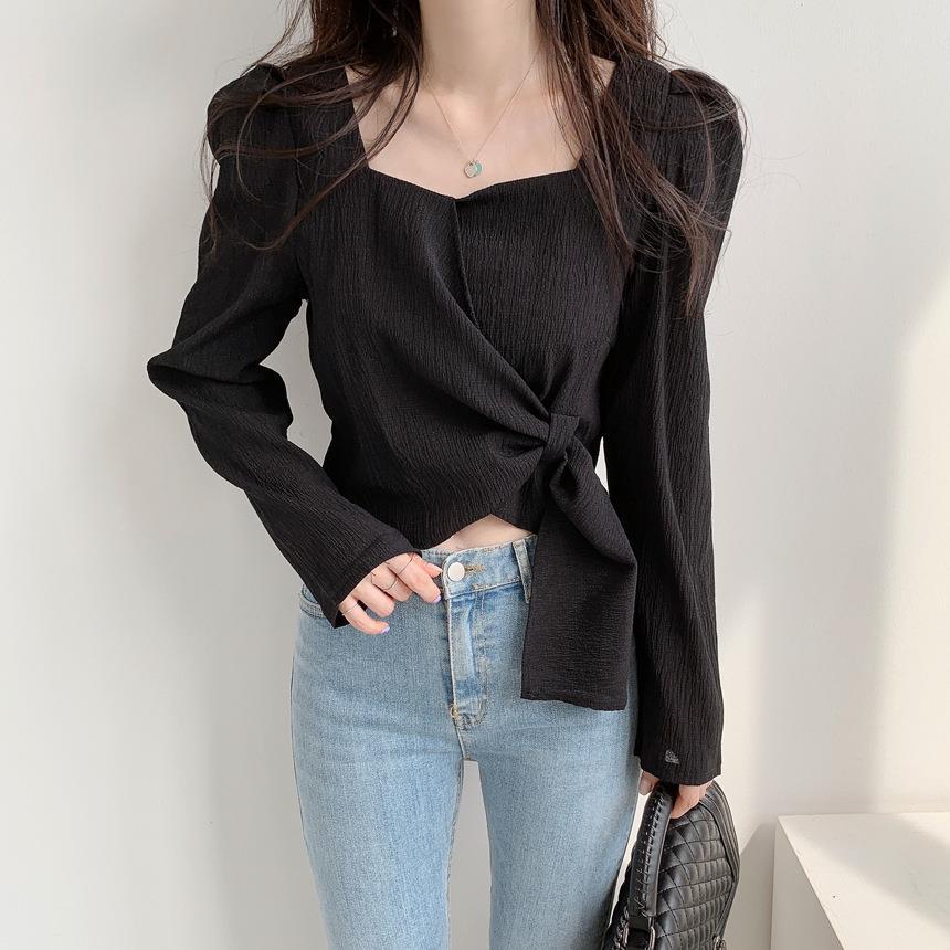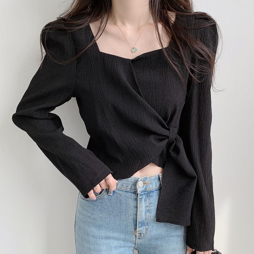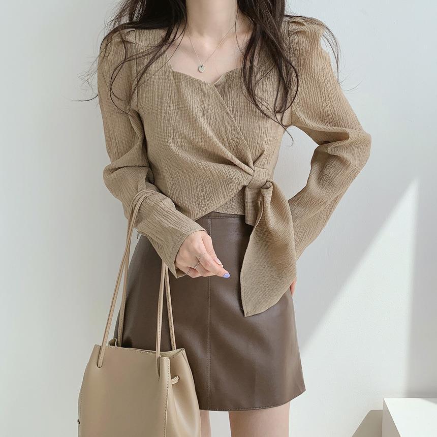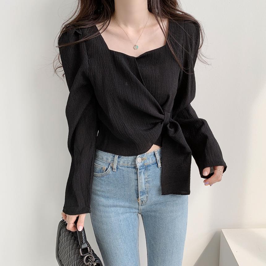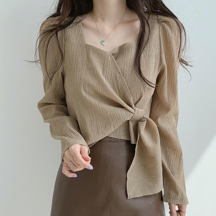 봄 가을 디자인감 있는 패셔너블한 2025 한국 스타일 스퀘어 넥 셔츠 퍼프 긴팔 끈 묶는 슬림핏 여성 셔츠스토어 가기