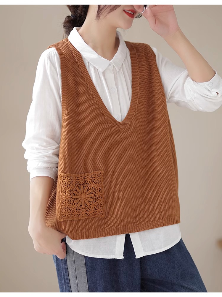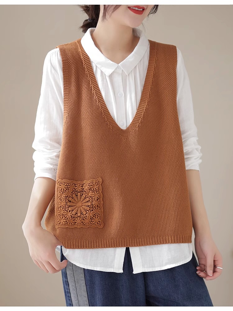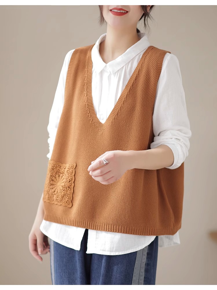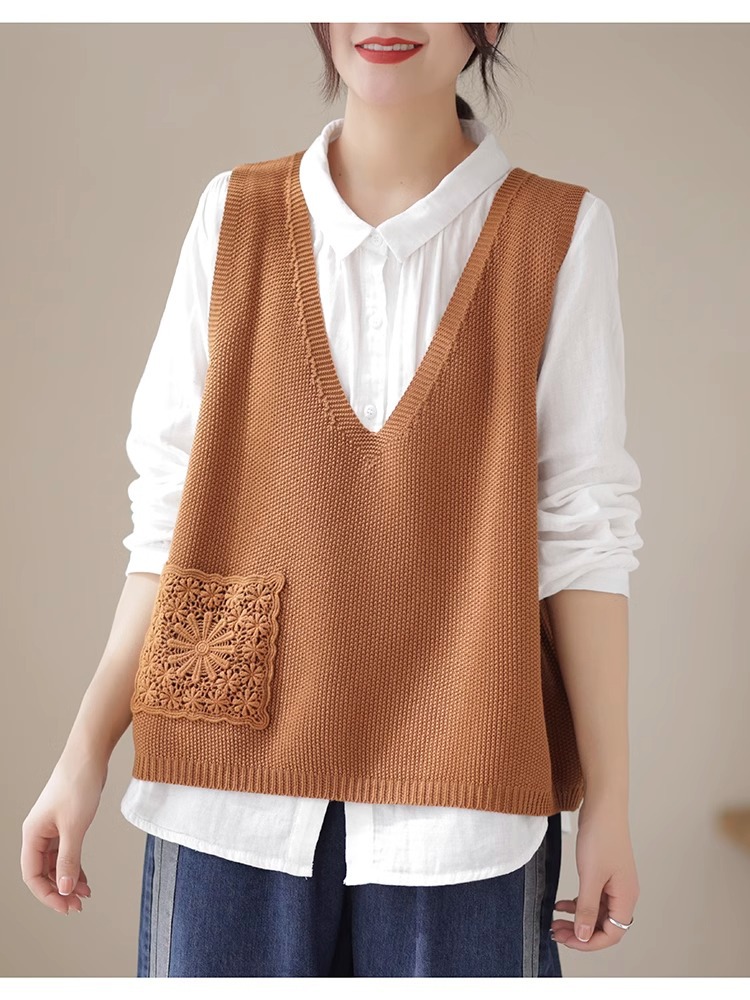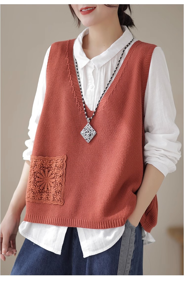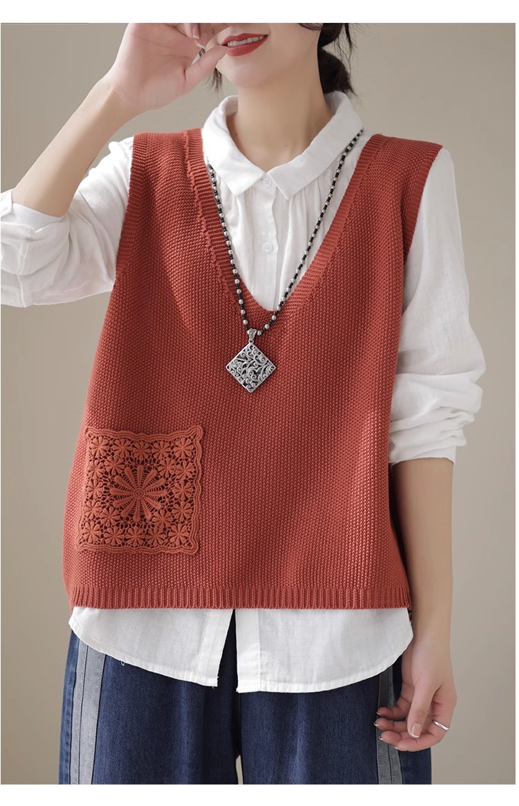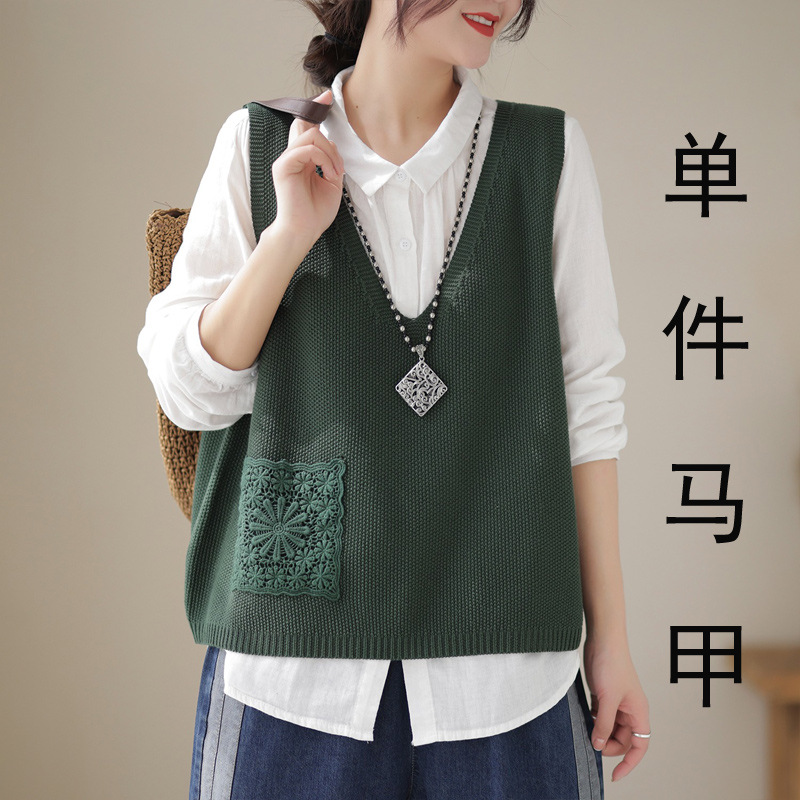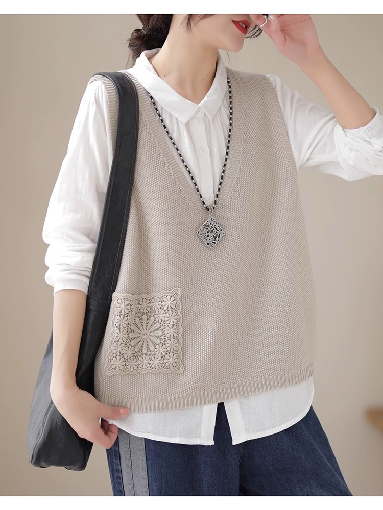 예술적 레이스 패치 크루 넥 니트 조끼 여성 봄 2024 새로운 단색 캐주얼 민소매 탑