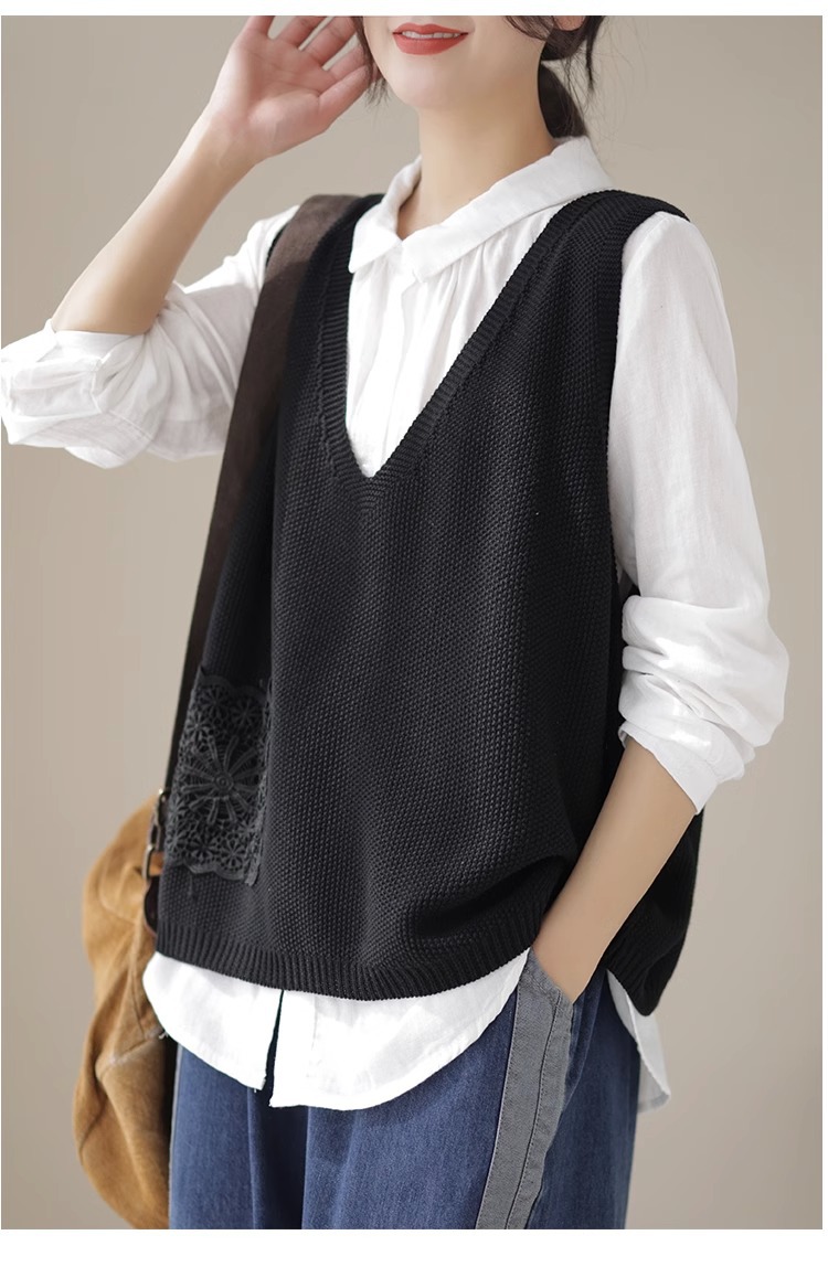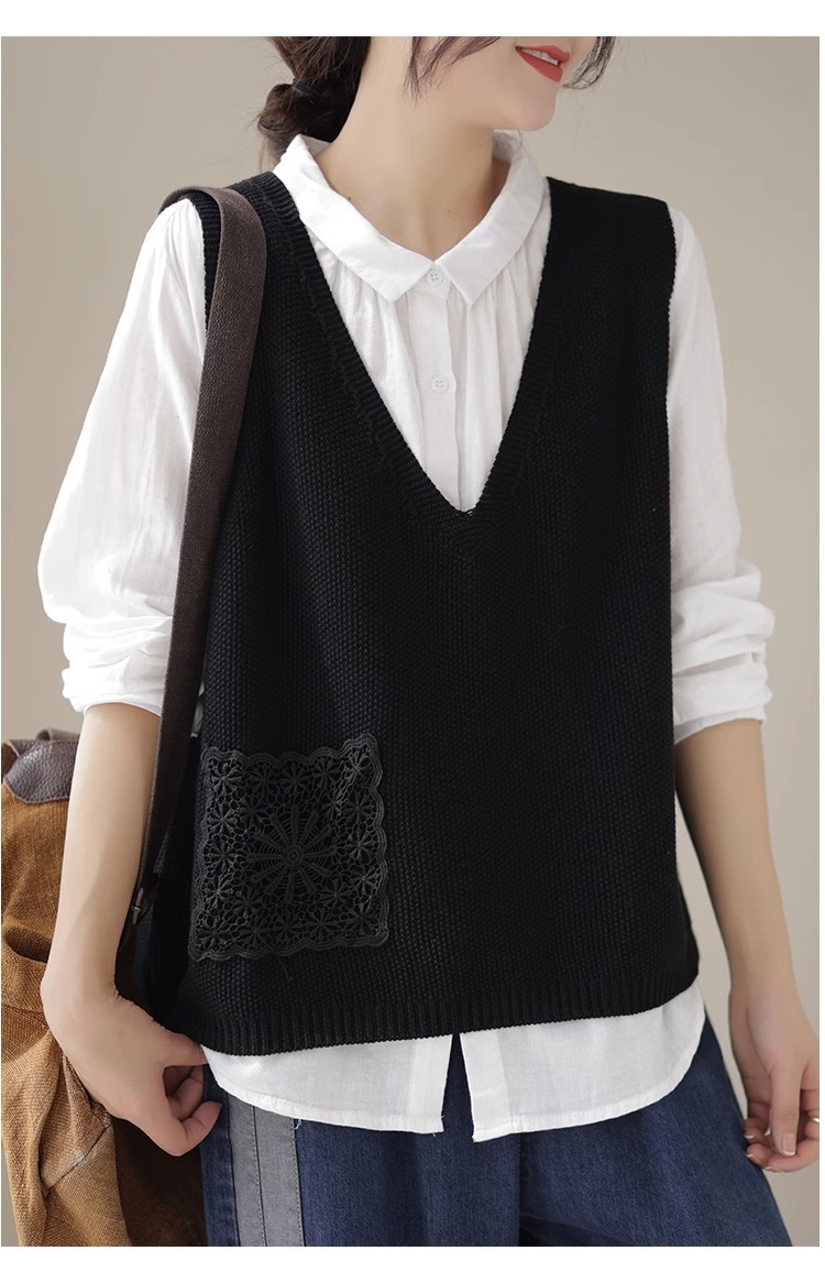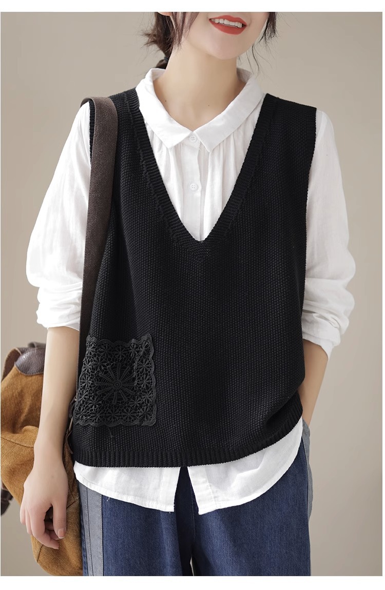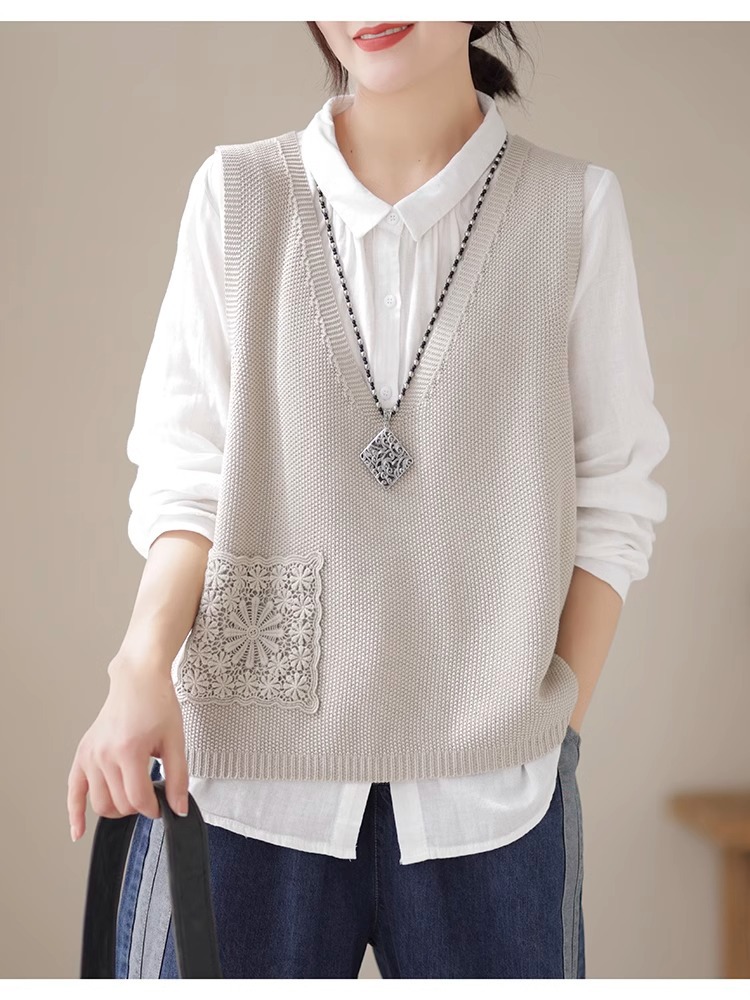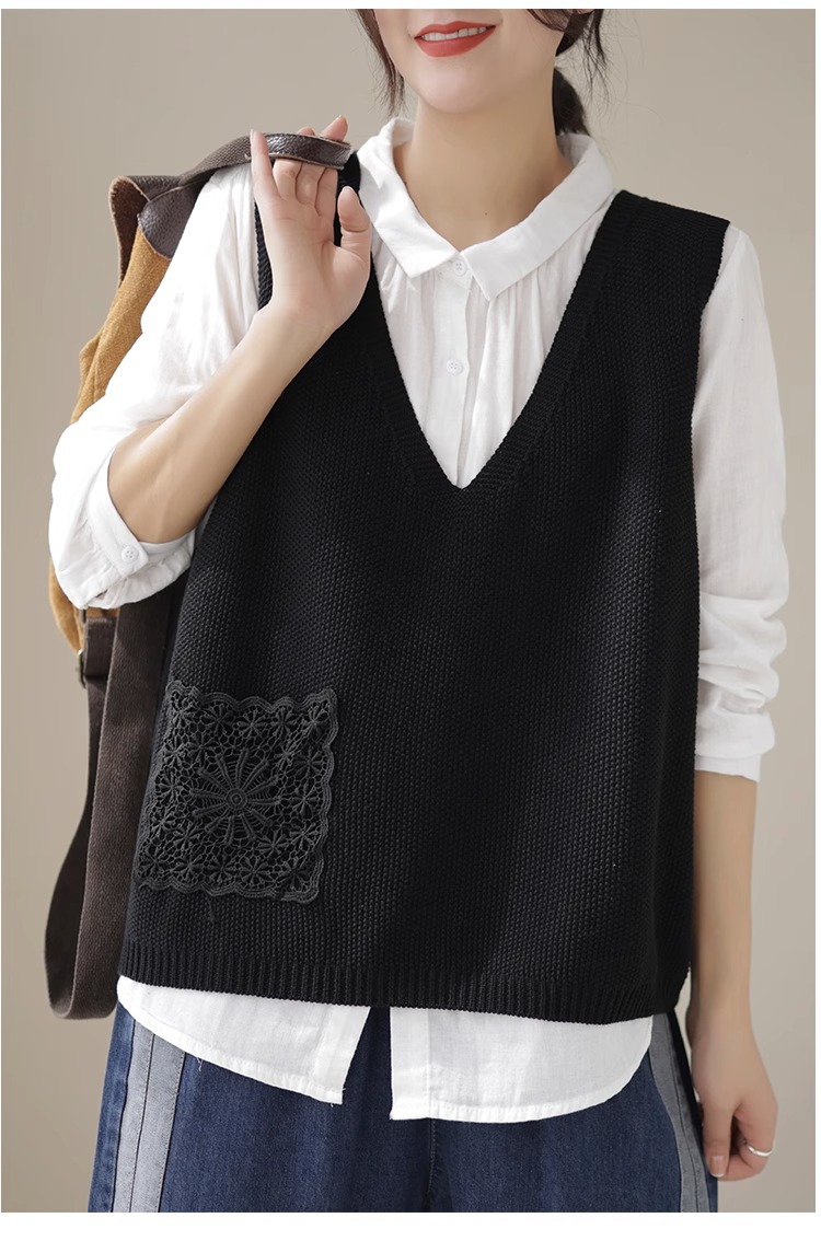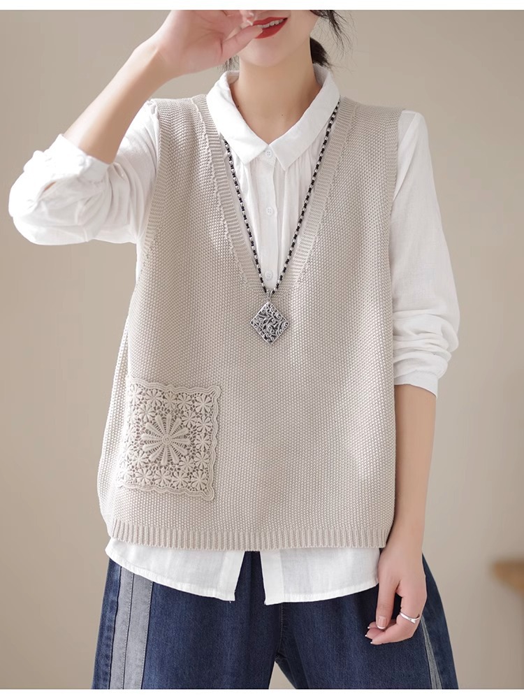 예술적 레이스 패치 크루 넥 니트 조끼 여성 봄 2024 새로운 단색 캐주얼 민소매 탑스토어 가기
