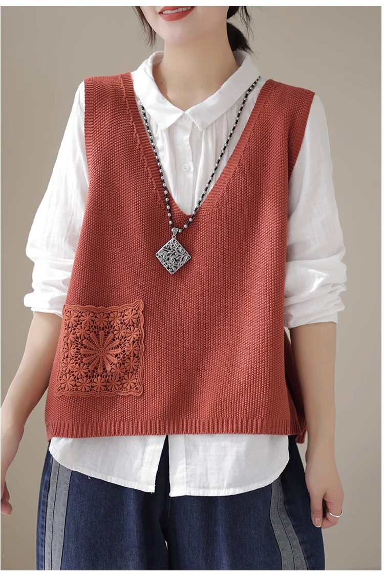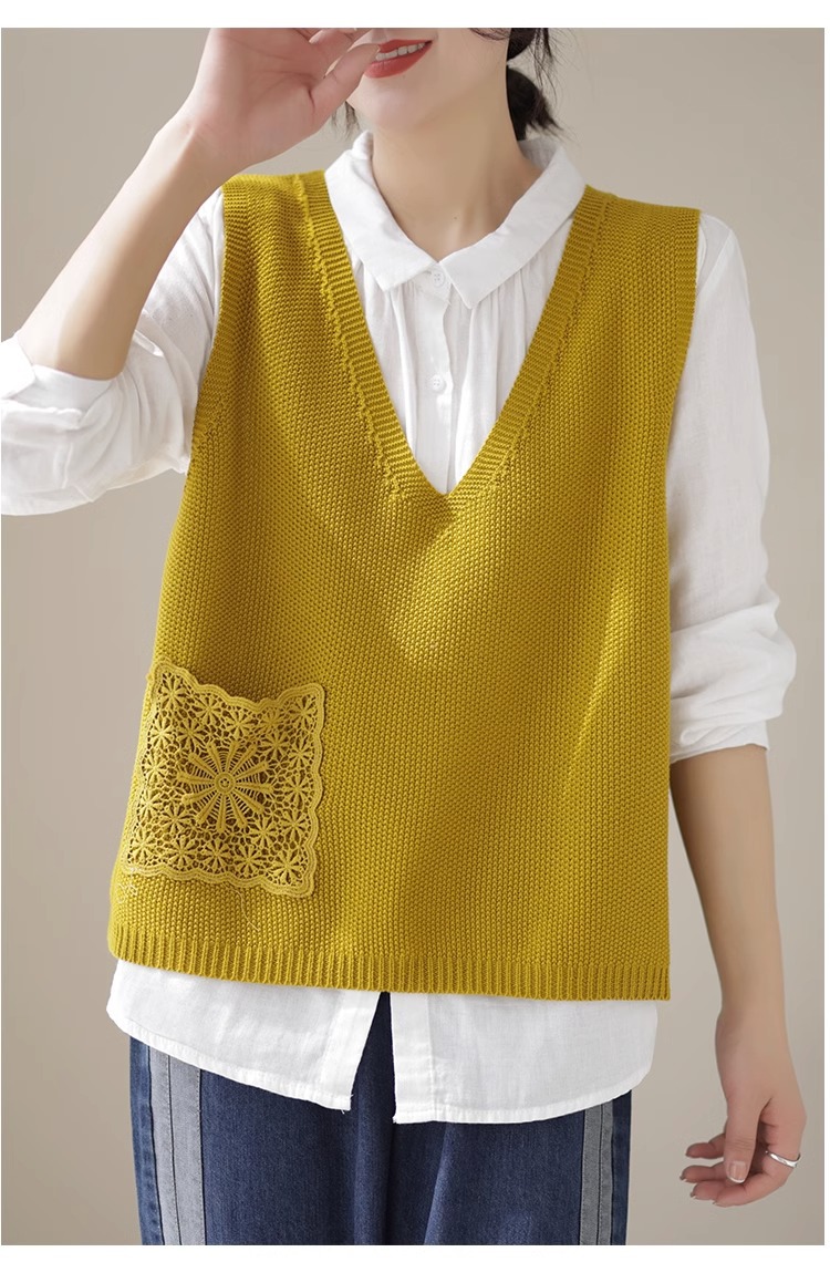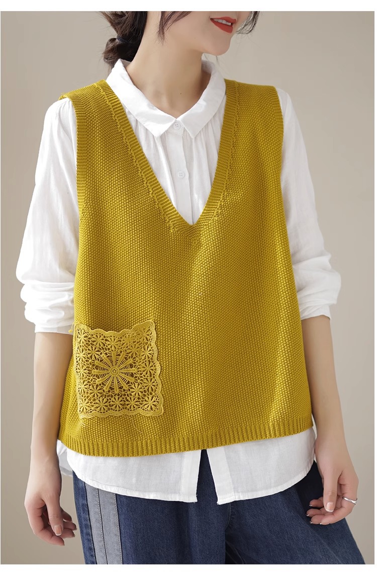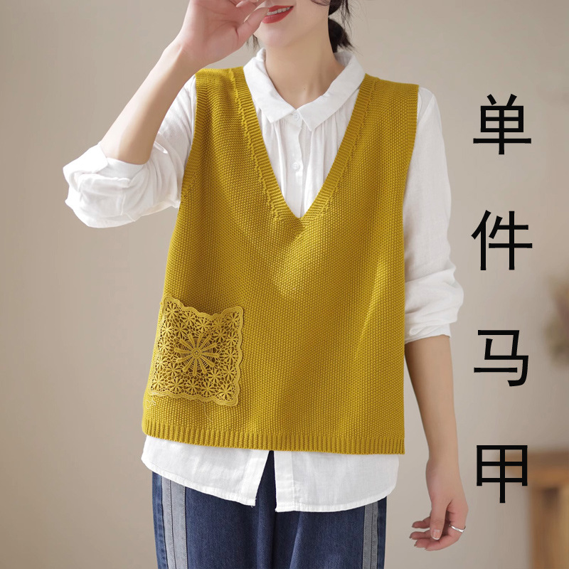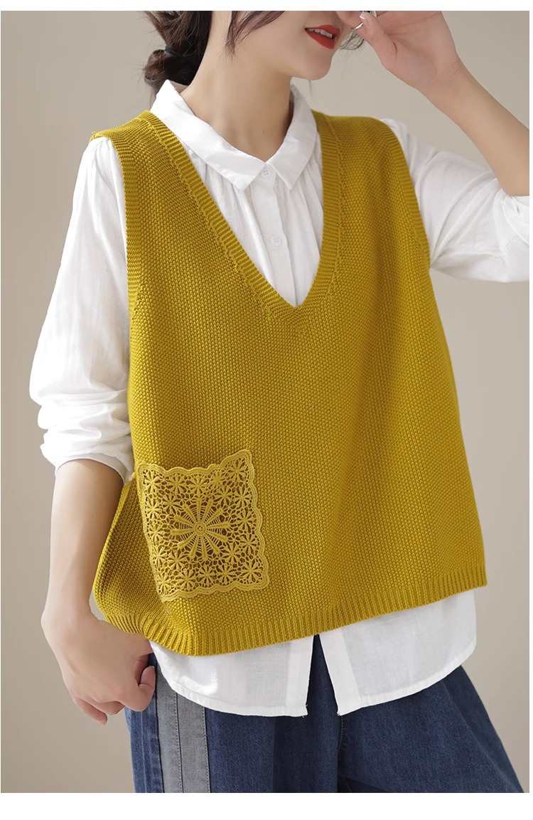 예술적 레이스 패치 크루 넥 니트 조끼 여성 봄 2024 새로운 단색 캐주얼 민소매 탑스토어 가기