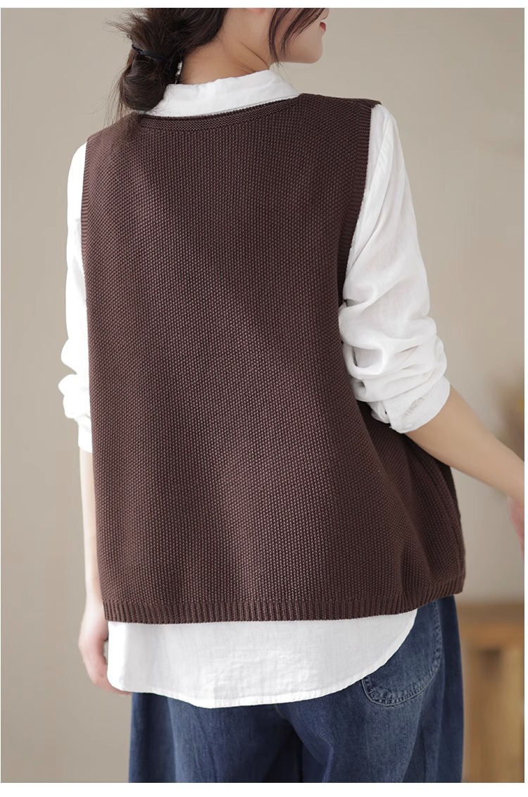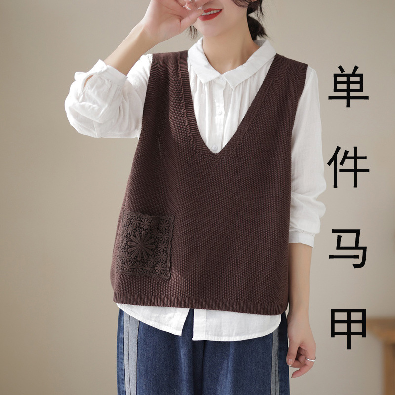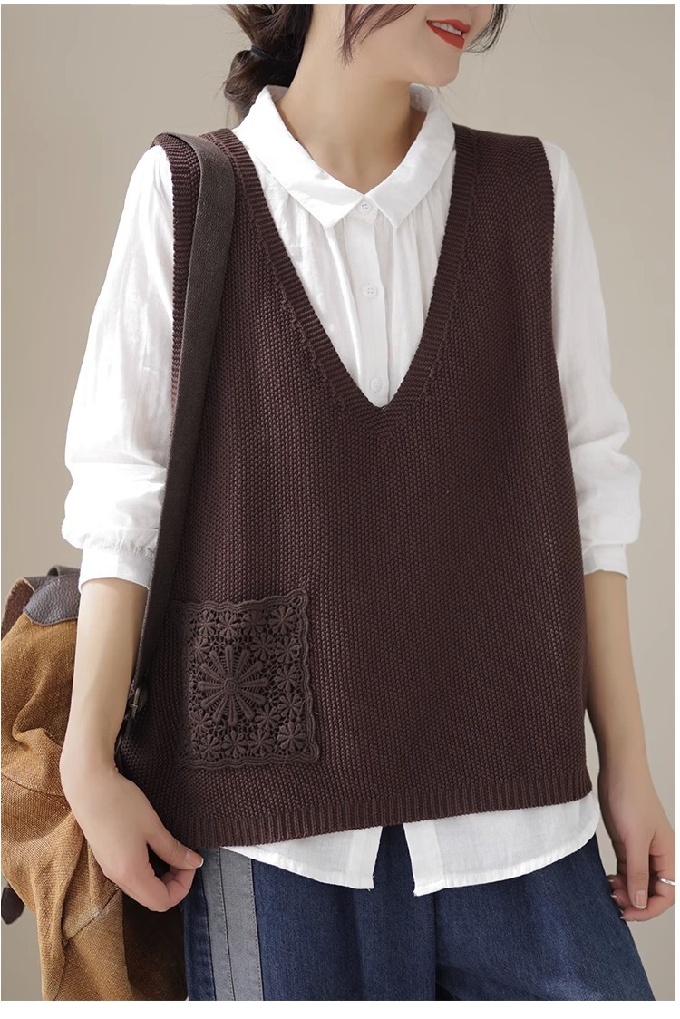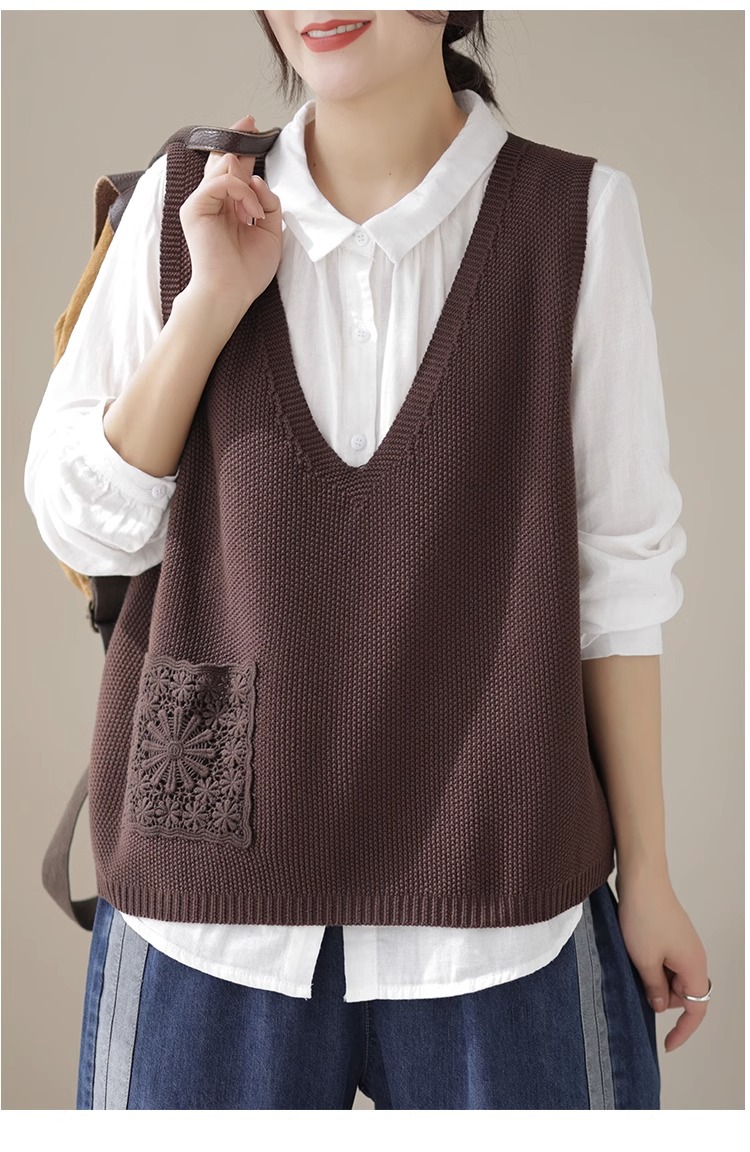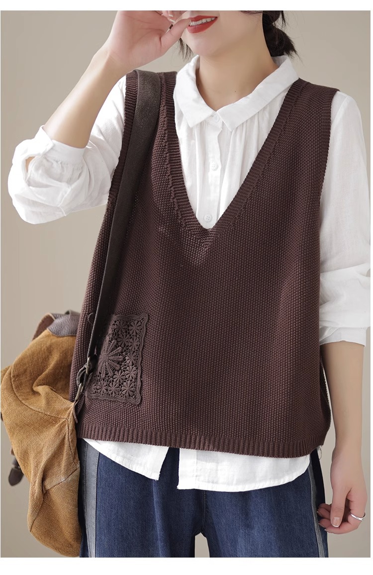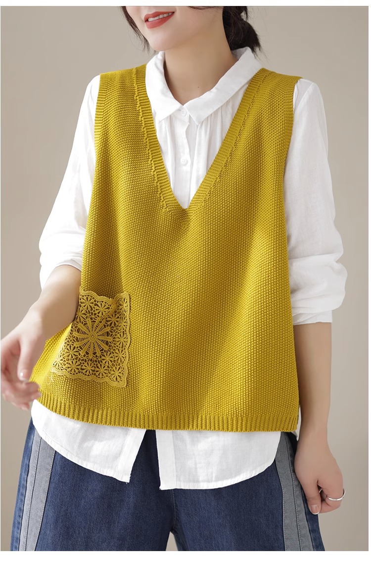 예술적 레이스 패치 크루 넥 니트 조끼 여성 봄 2024 새로운 단색 캐주얼 민소매 탑스토어 가기