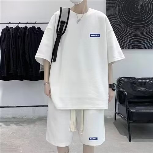 와플 캐주얼 스포츠 세트 남자의 느슨한 여름 반팔 티셔츠 남자 의류 세트 잘 생긴 반바지스토어 가기