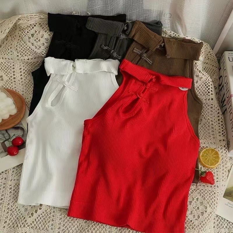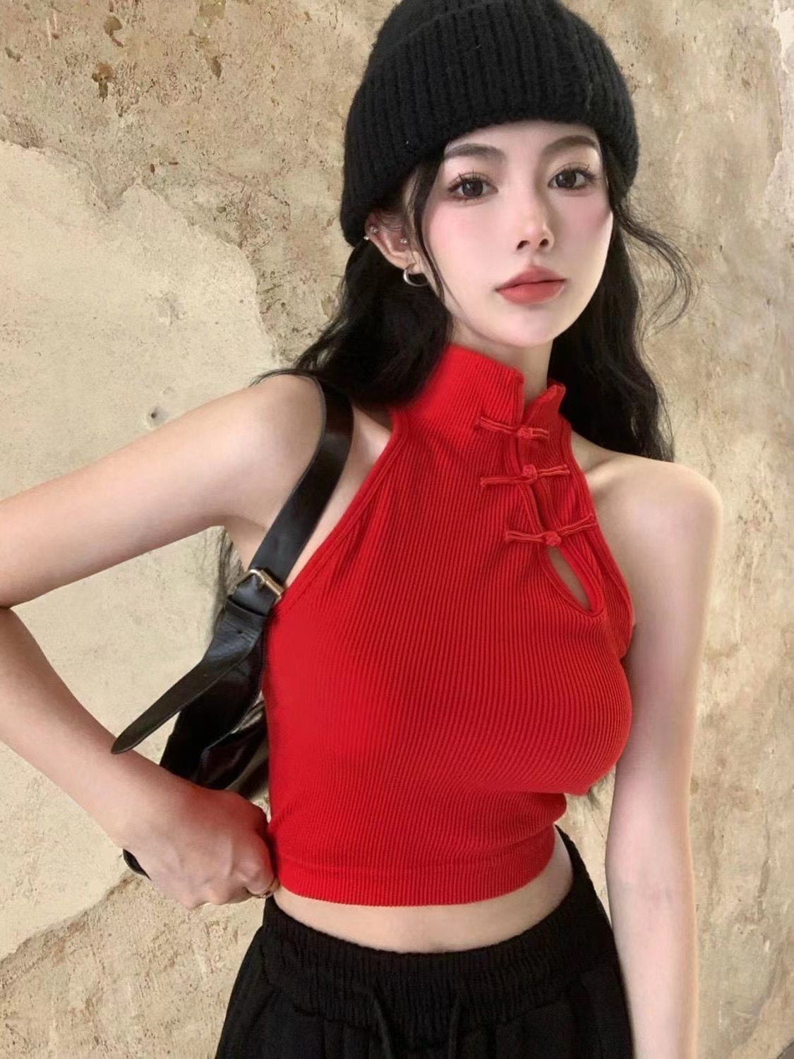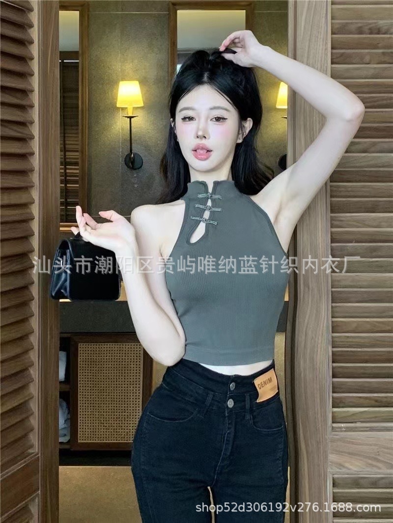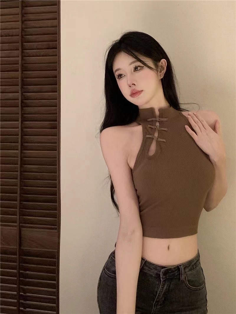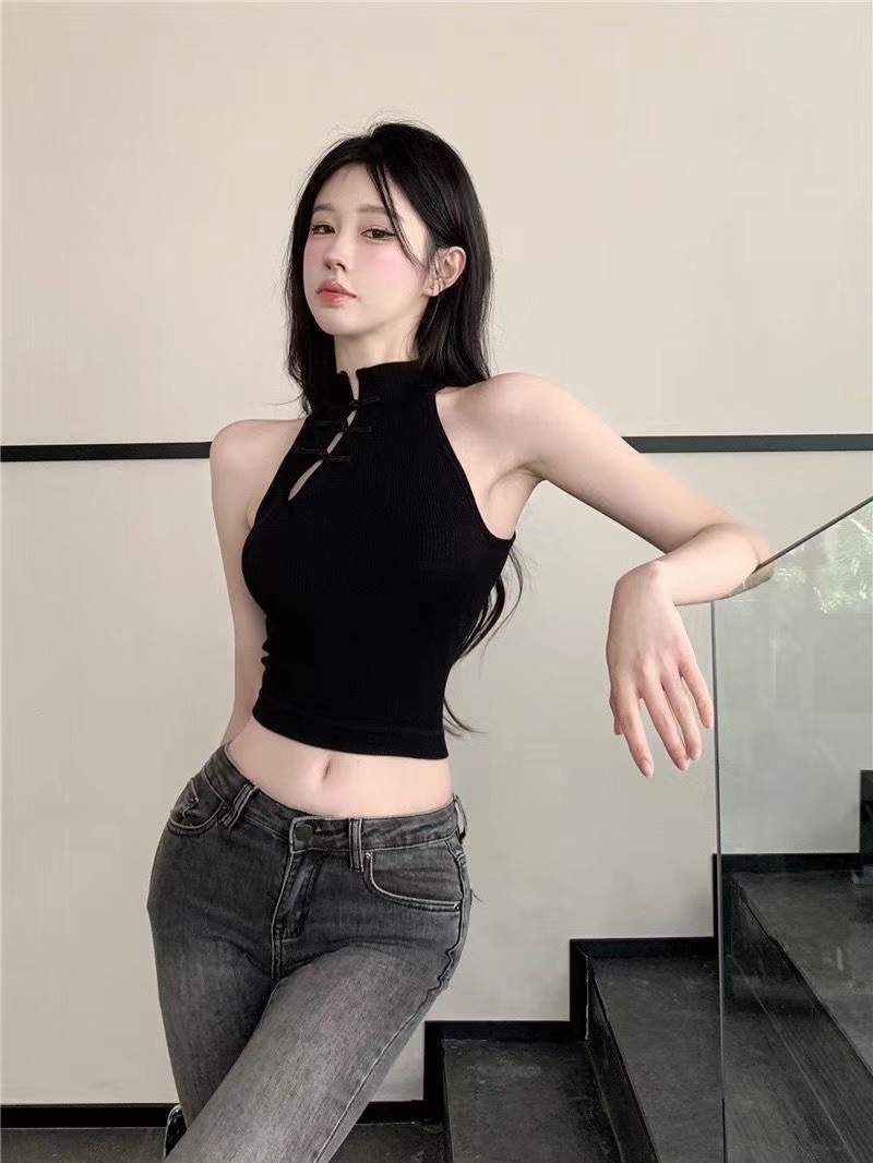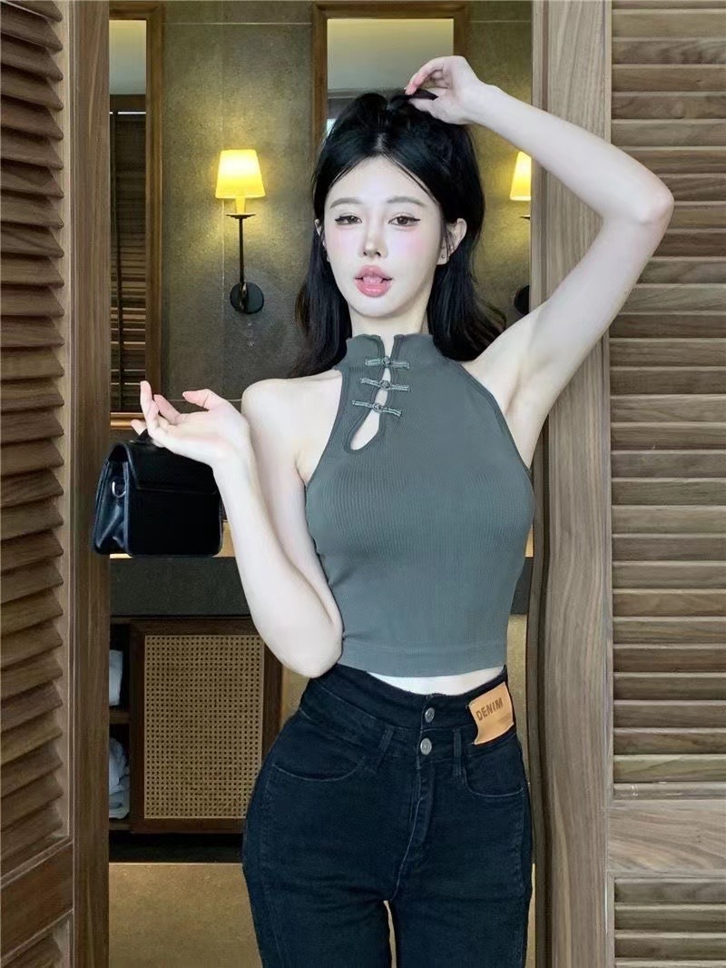 빈티지 청삼 버클 작은 카미솔 조끼 여성 가을 인테리어 순수 스파이스 소녀 섹시한 민소매 짧은 목 탑