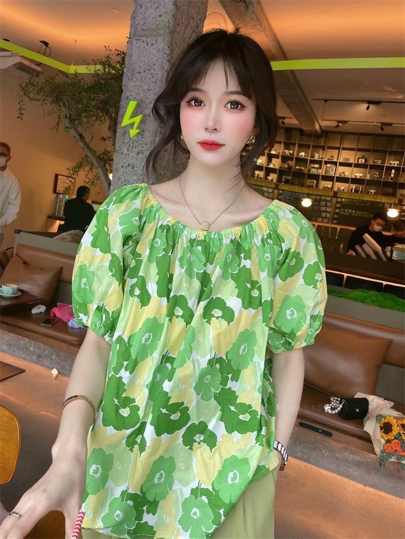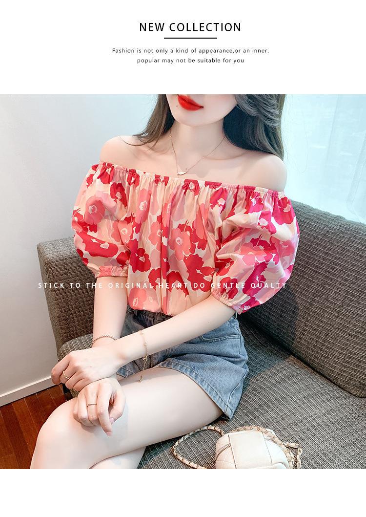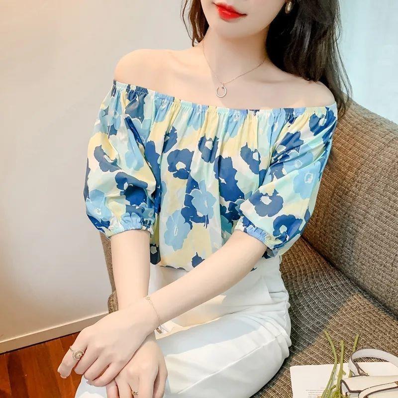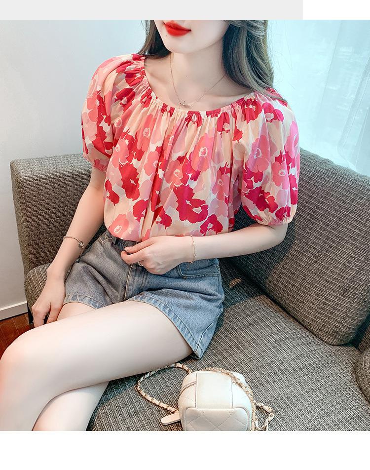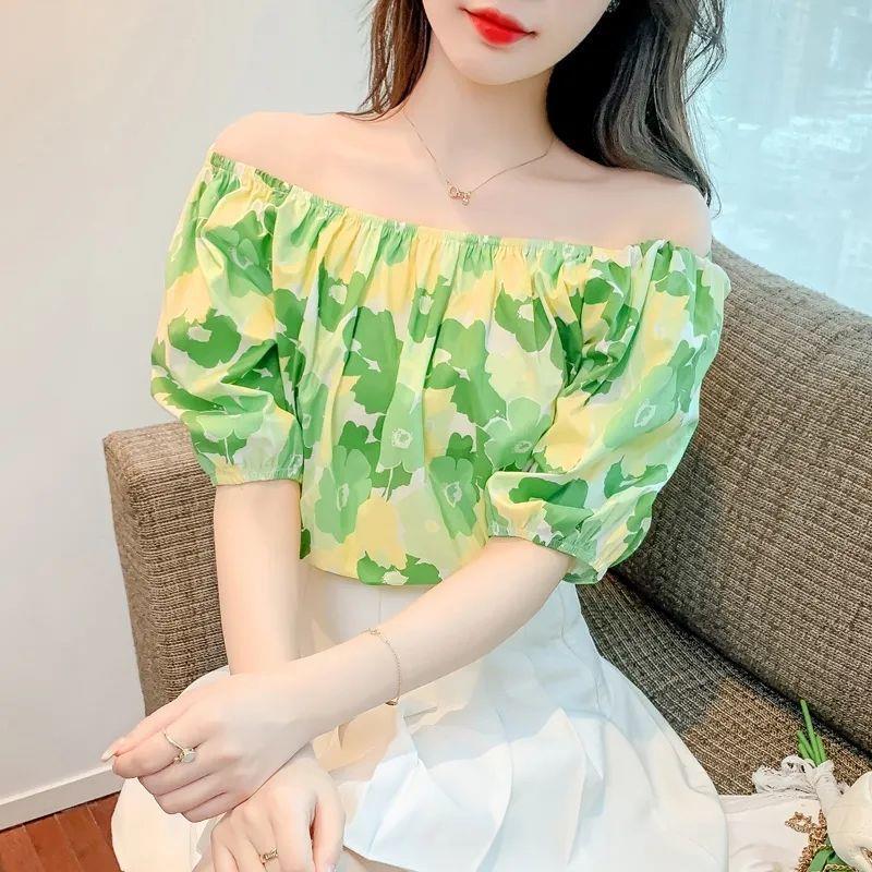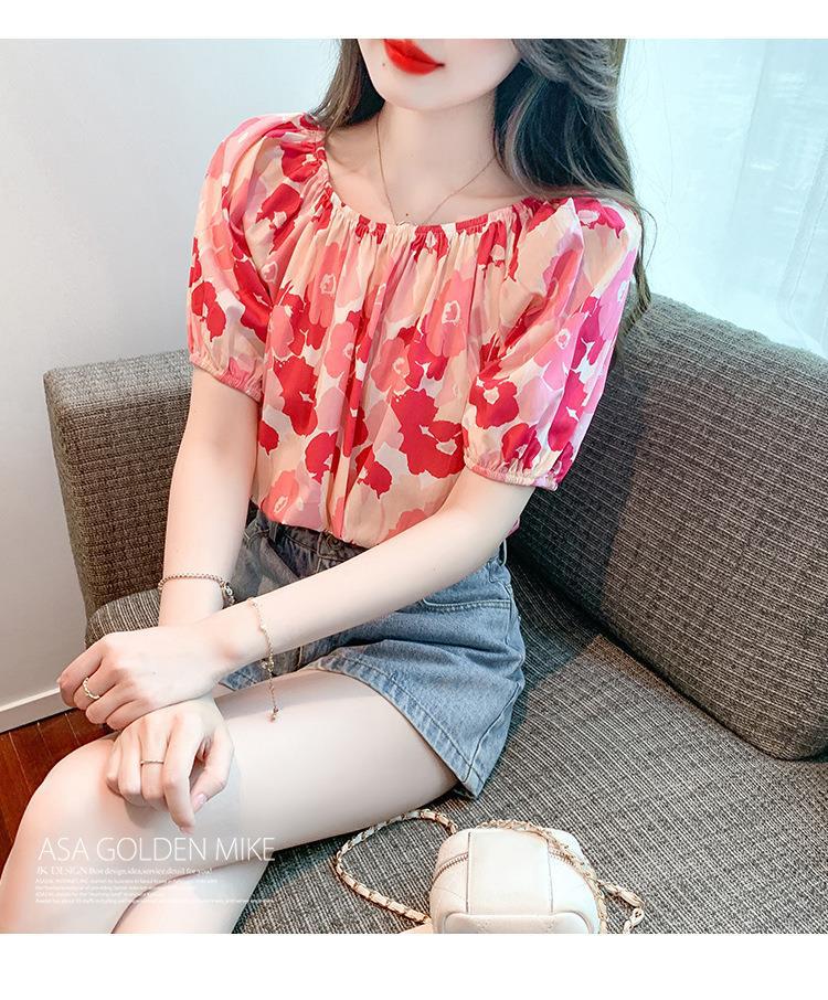 달콤한 원 라인 칼라 플로럴 쉬폰 셔츠 여성용 반팔 여름 연령 감소 고기 숨기기 슬리밍 탑 숄더 버블 슬리브 작은 셔츠스토어 가기