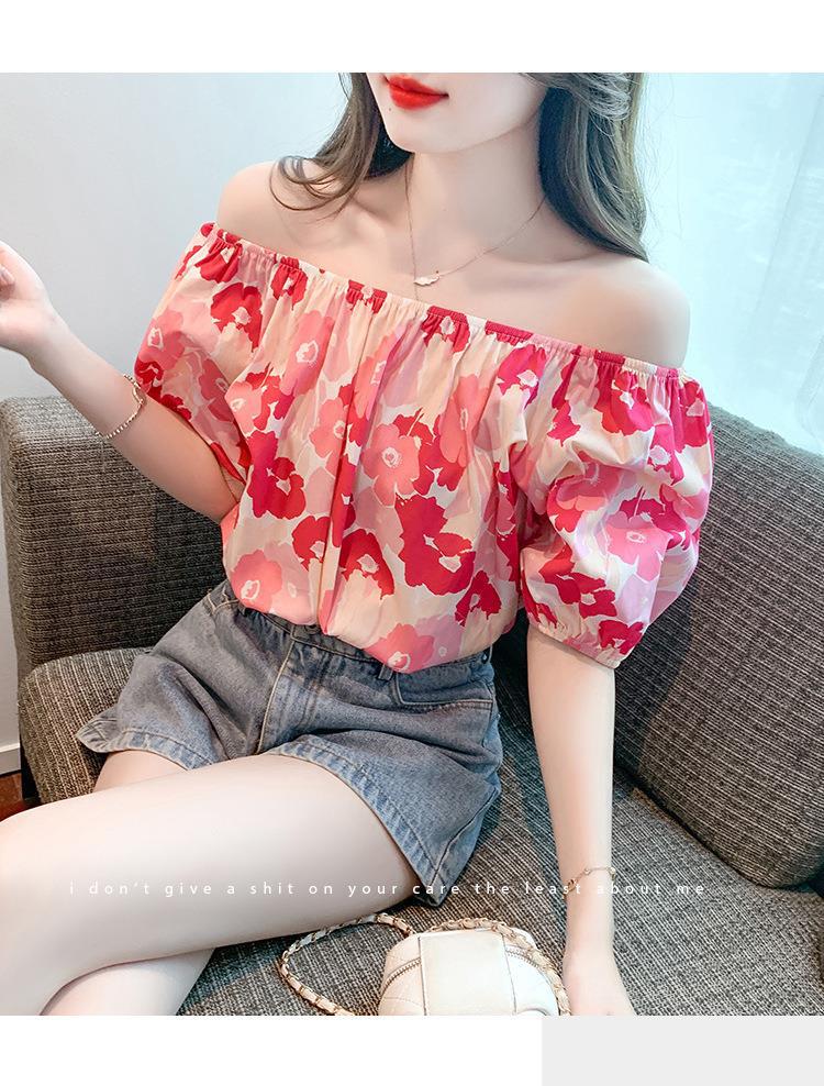 달콤한 원 라인 칼라 플로럴 쉬폰 셔츠 여성용 반팔 여름 연령 감소 고기 숨기기 슬리밍 탑 숄더 버블 슬리브 작은 셔츠