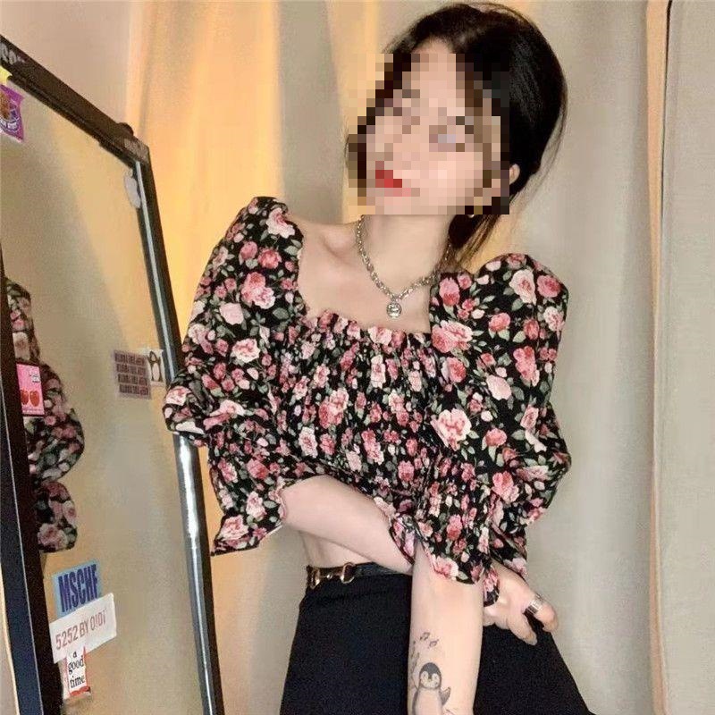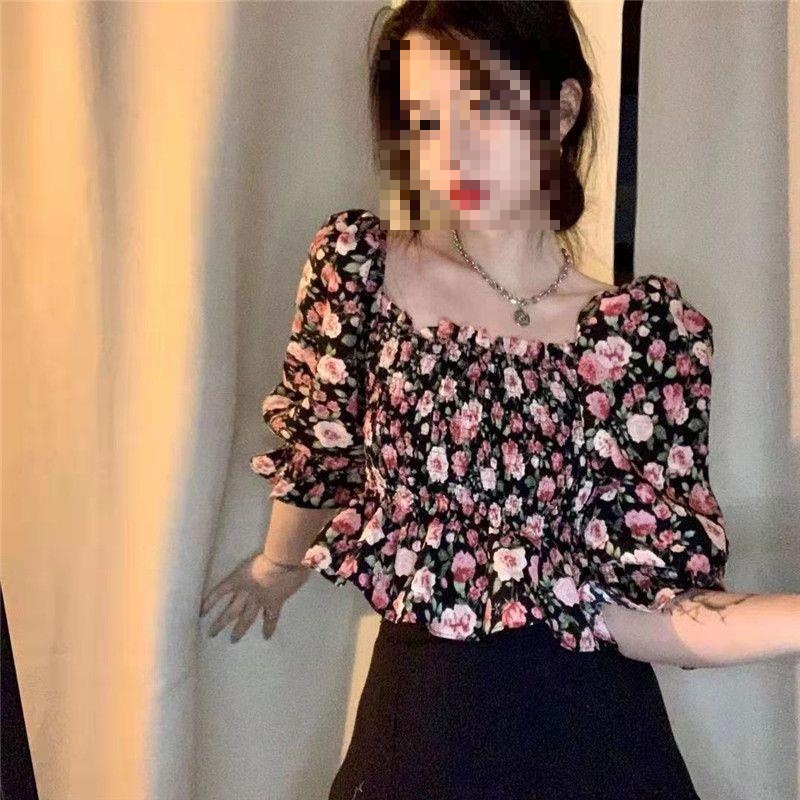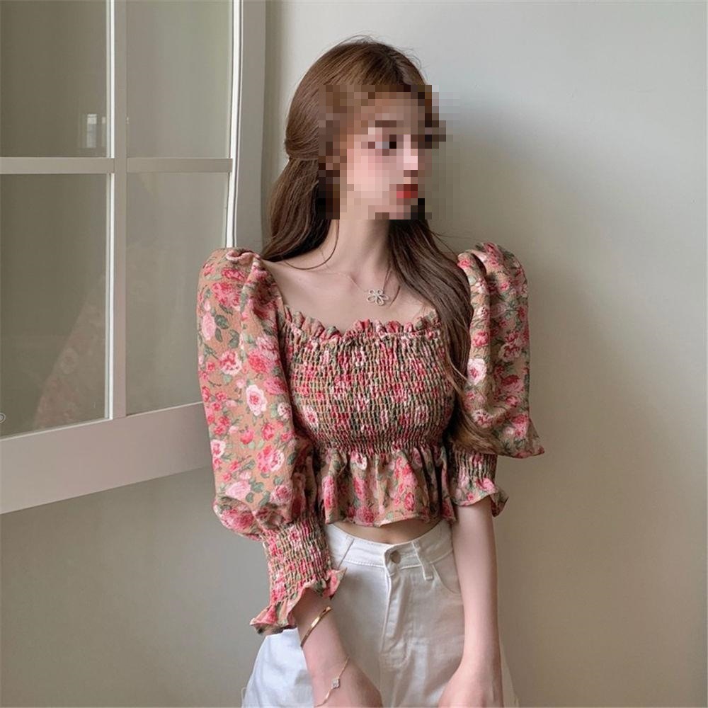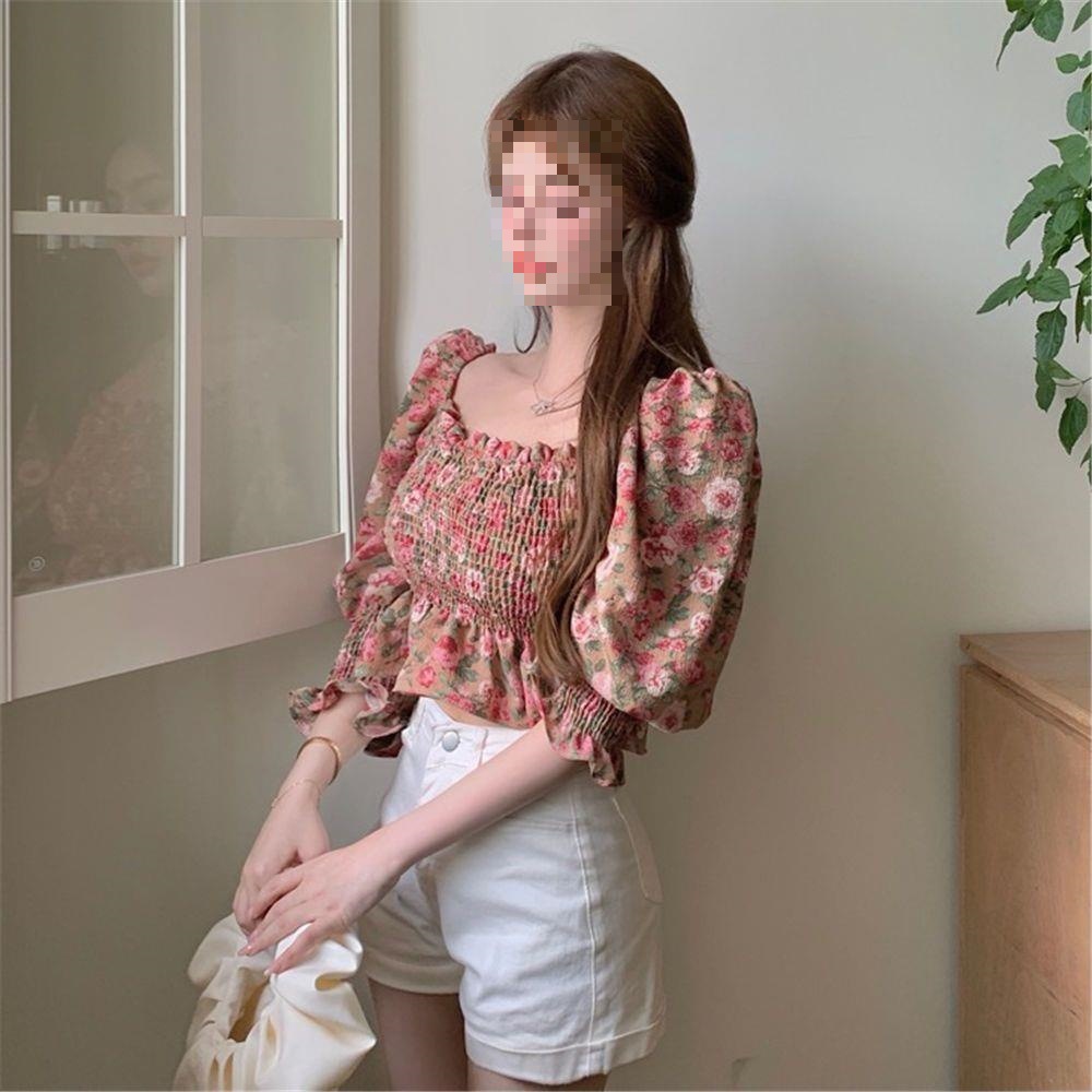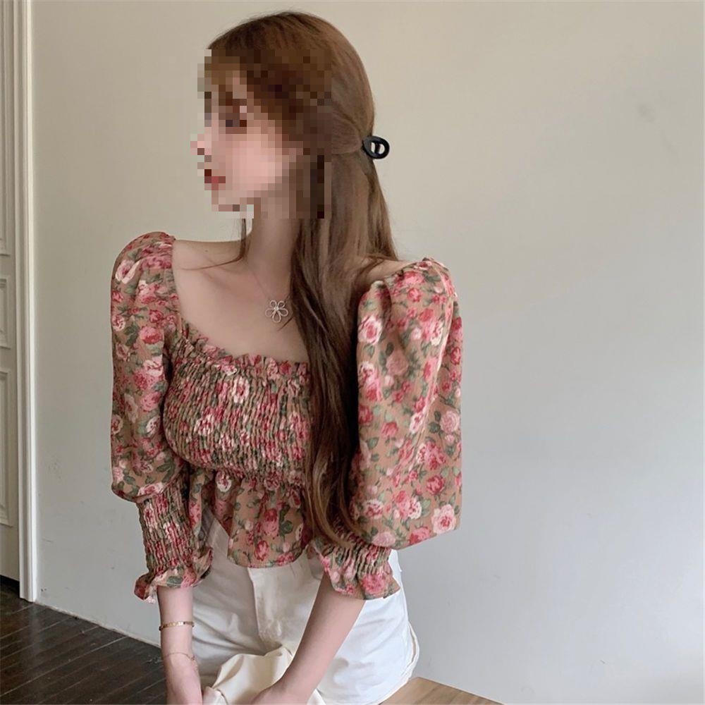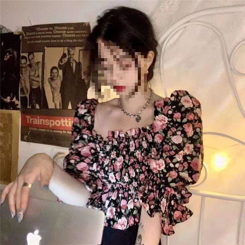 홍콩 스타일 빈티지 플로럴 스퀘어 칼라 탑 여성용 가리 스타일 퍼프 슬리브 짧은 쉬폰 셔츠 2023 새로운 여름스토어 가기