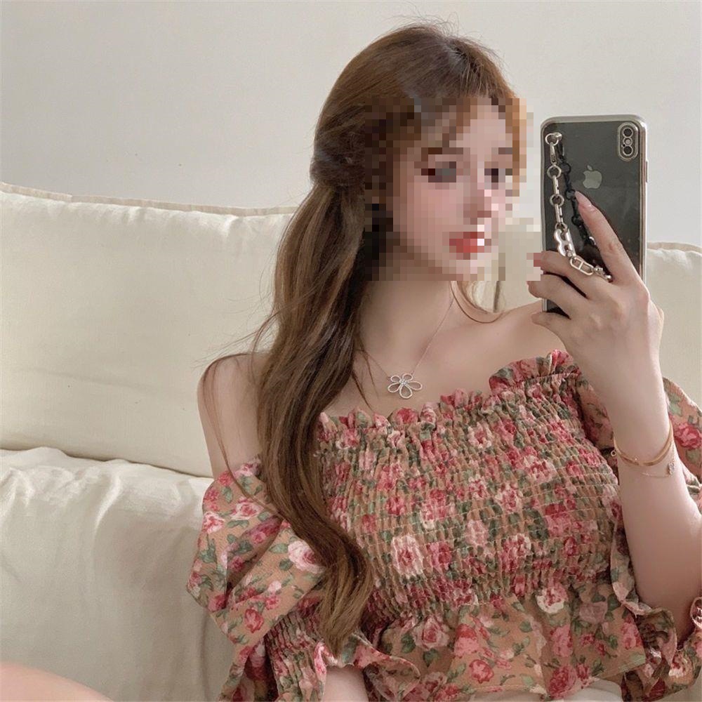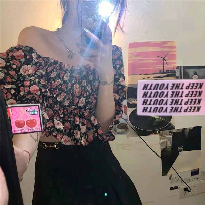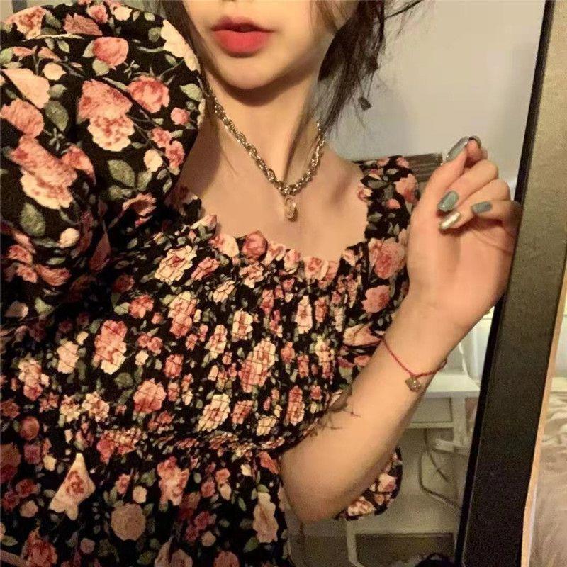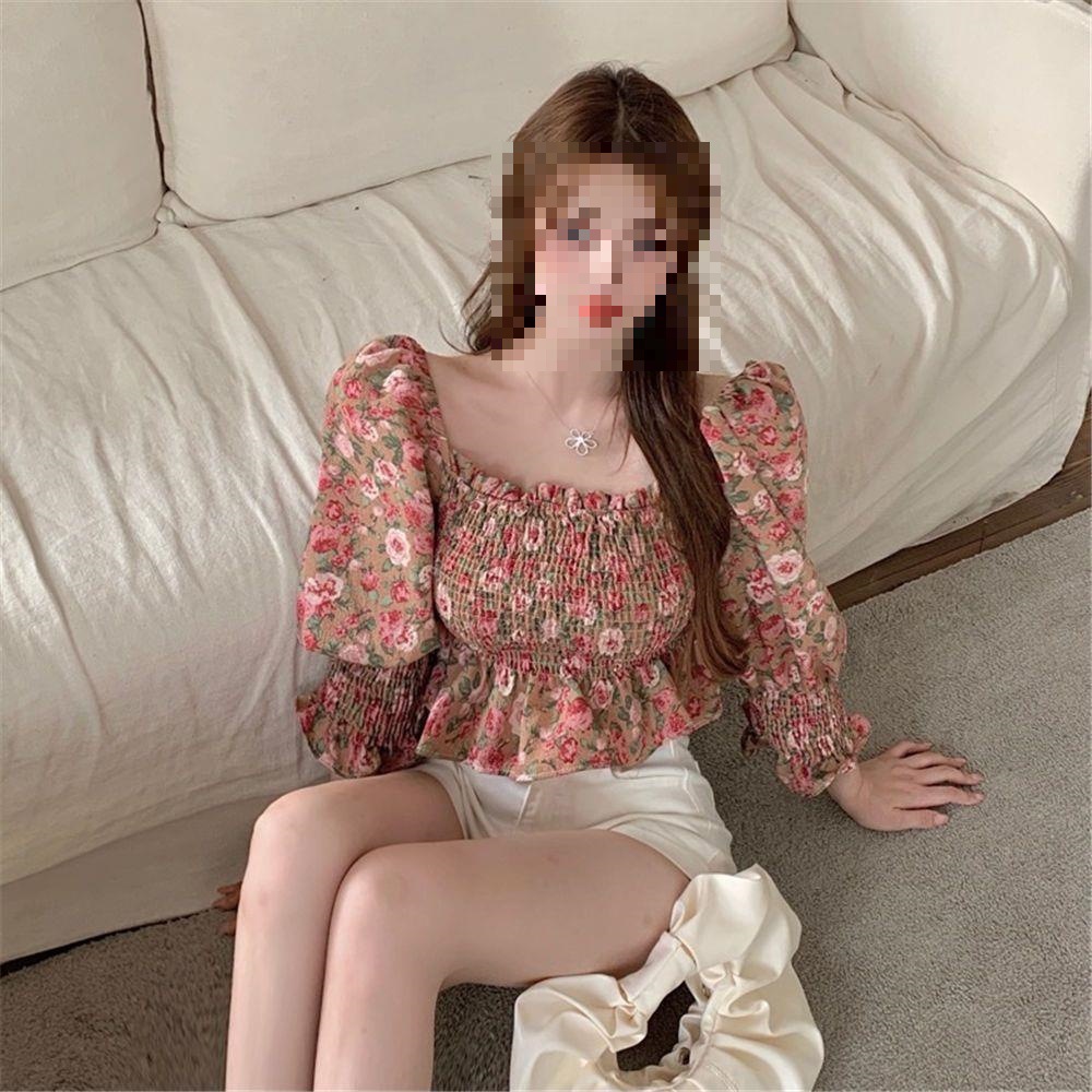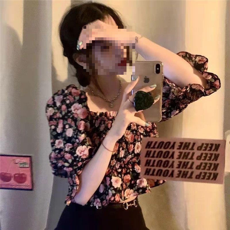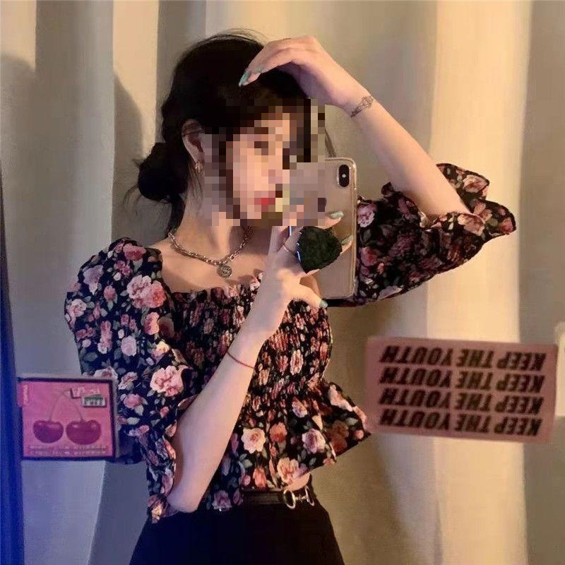 홍콩 스타일 빈티지 플로럴 스퀘어 칼라 탑 여성용 가리 스타일 퍼프 슬리브 짧은 쉬폰 셔츠 2023 새로운 여름스토어 가기