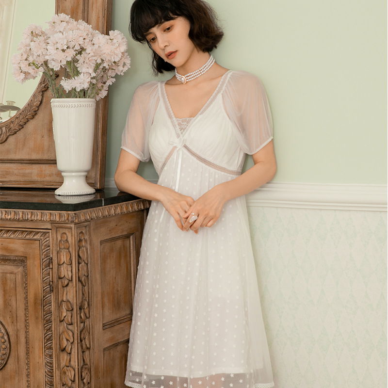 프로모션 가격 섹시한 여성용 여름 반팔 메쉬 레이스 얇은 공주풍 프렌치 스타일 가슴 패드가 있는 캐주얼 잠옷스토어 가기