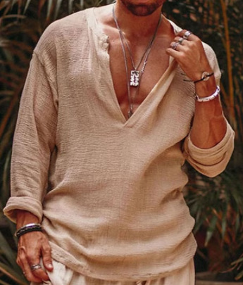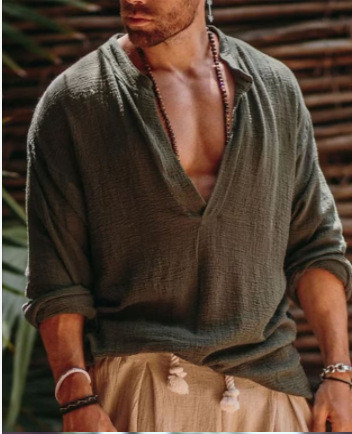 국경 간 대외 무역 2023 사계절 새로운 유럽과 미국 남성의 단순한 순수한면 단색 스탠드 칼라 긴 소매 린넨 셔츠 남성스토어 가기