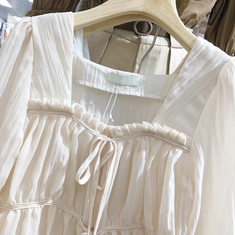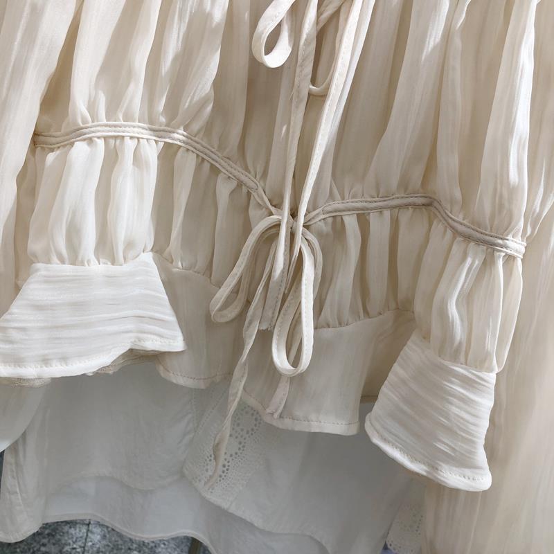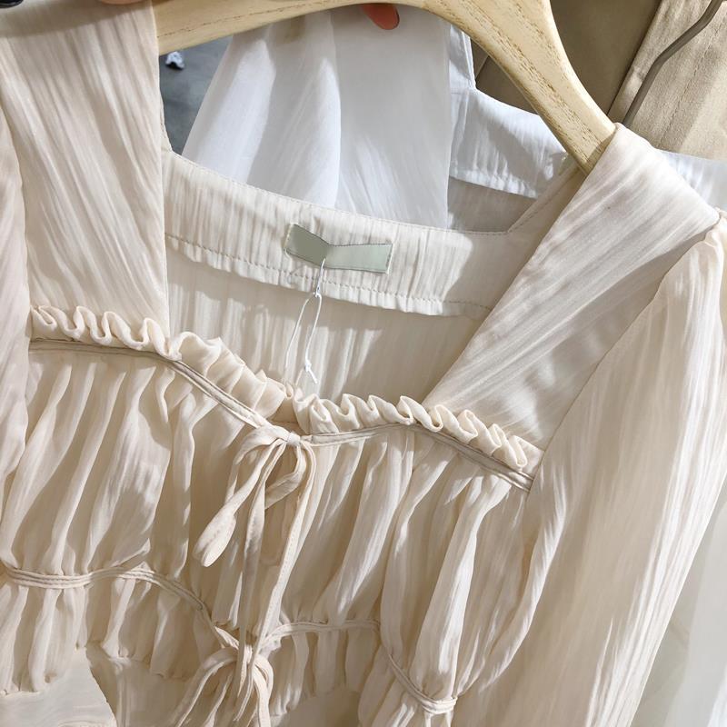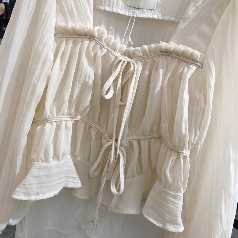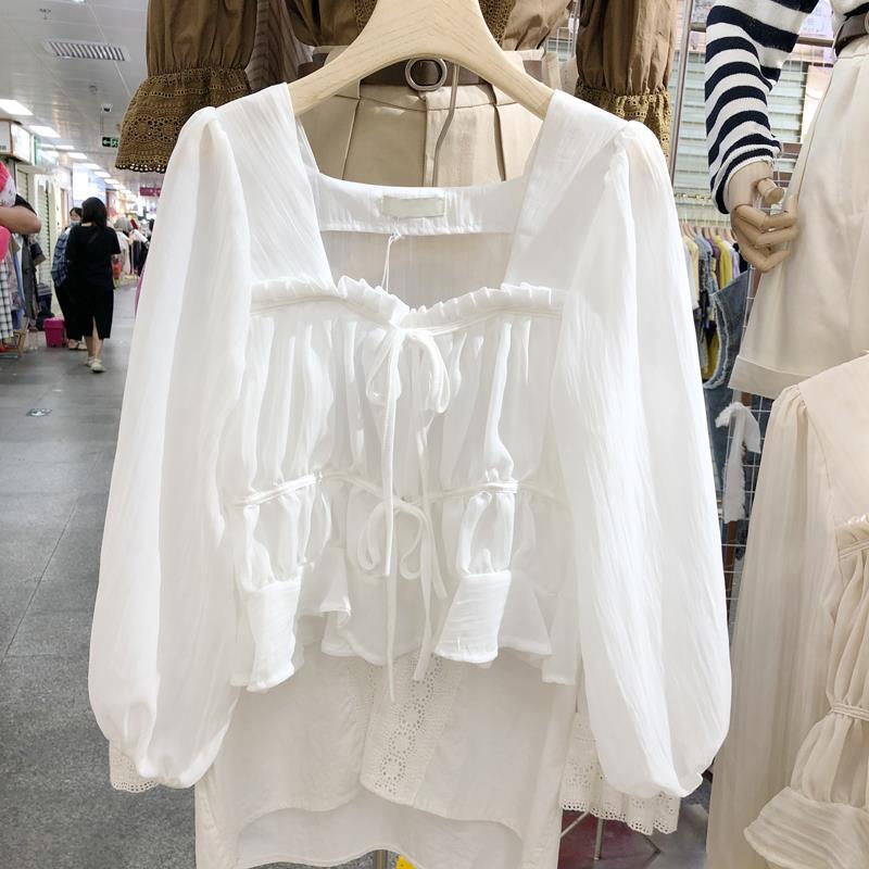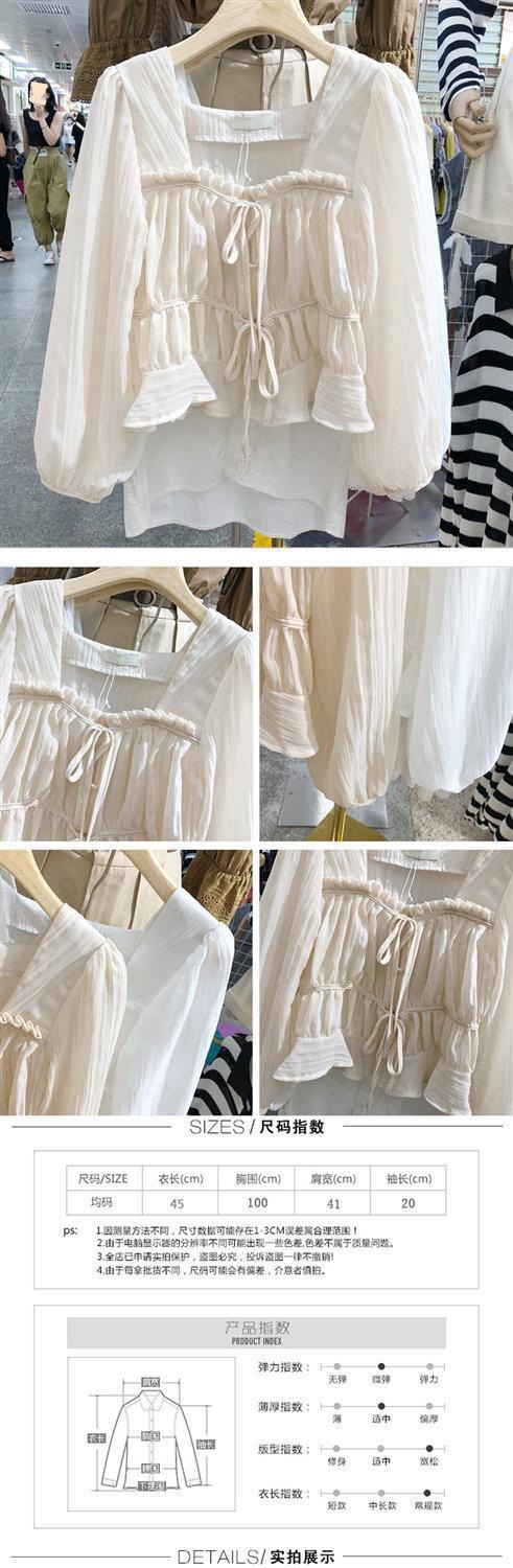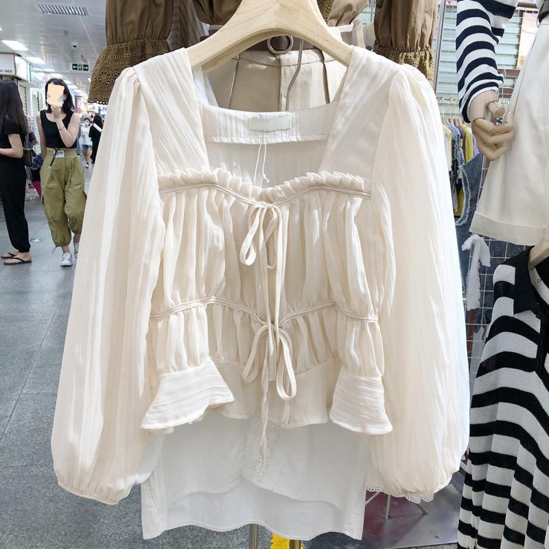쉬폰 셔츠 여성용 2023 새로운 초가을 순수한 색상 달콤한 우아한 작은 셔츠 슬리밍 연령 감소 퍼프 슬리브 짧은 탑