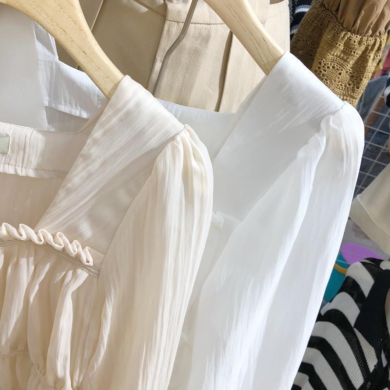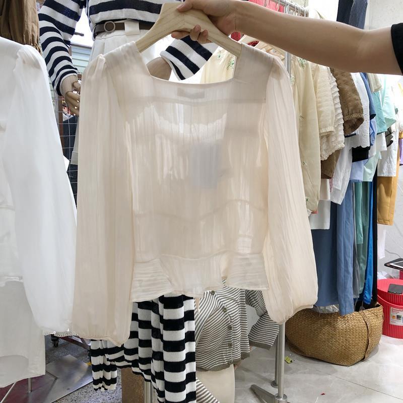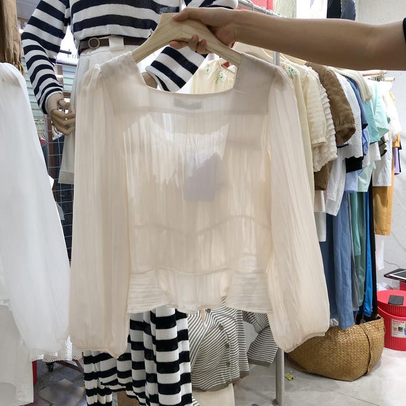쉬폰 셔츠 여성용 2023 새로운 초가을 순수한 색상 달콤한 우아한 작은 셔츠 슬리밍 연령 감소 퍼프 슬리브 짧은 탑스토어 가기